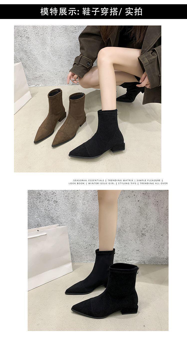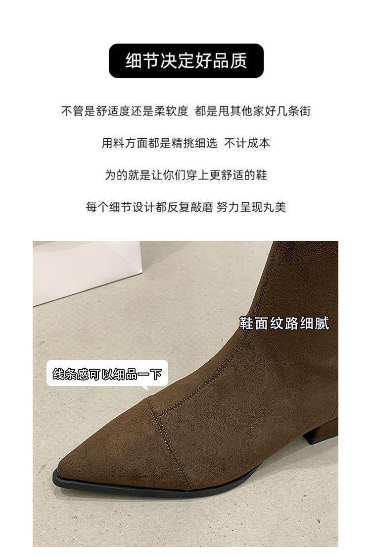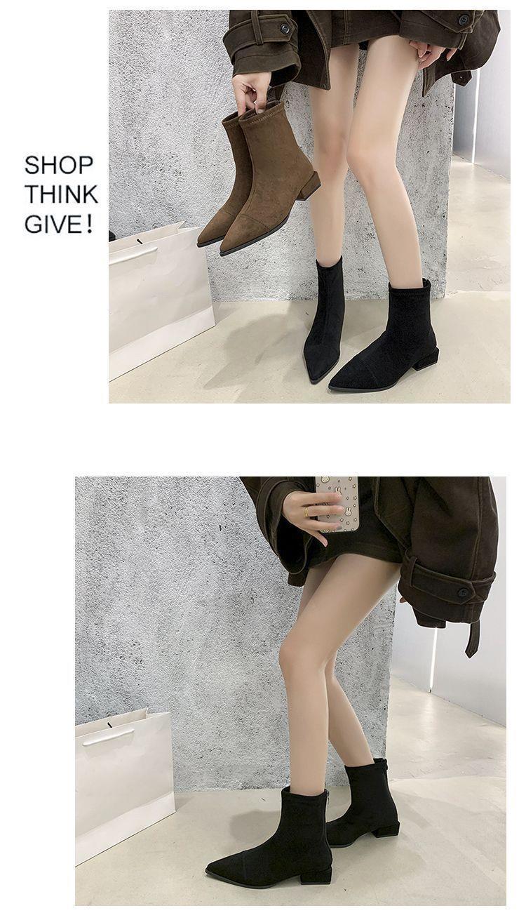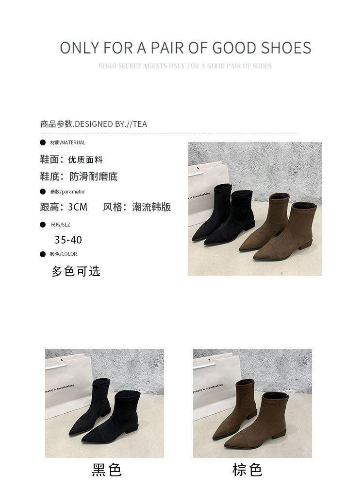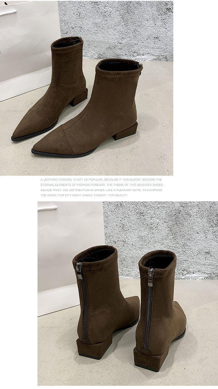 法式后拉链裸靴平底尖头短靴子时尚显瘦弹力瘦瘦靴秋冬新款35-40