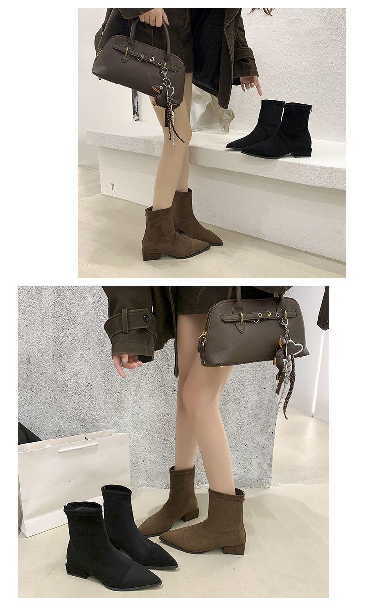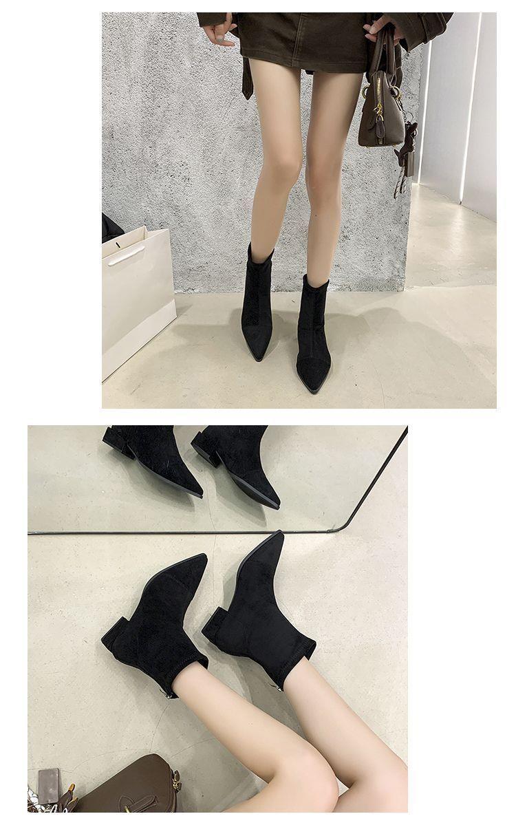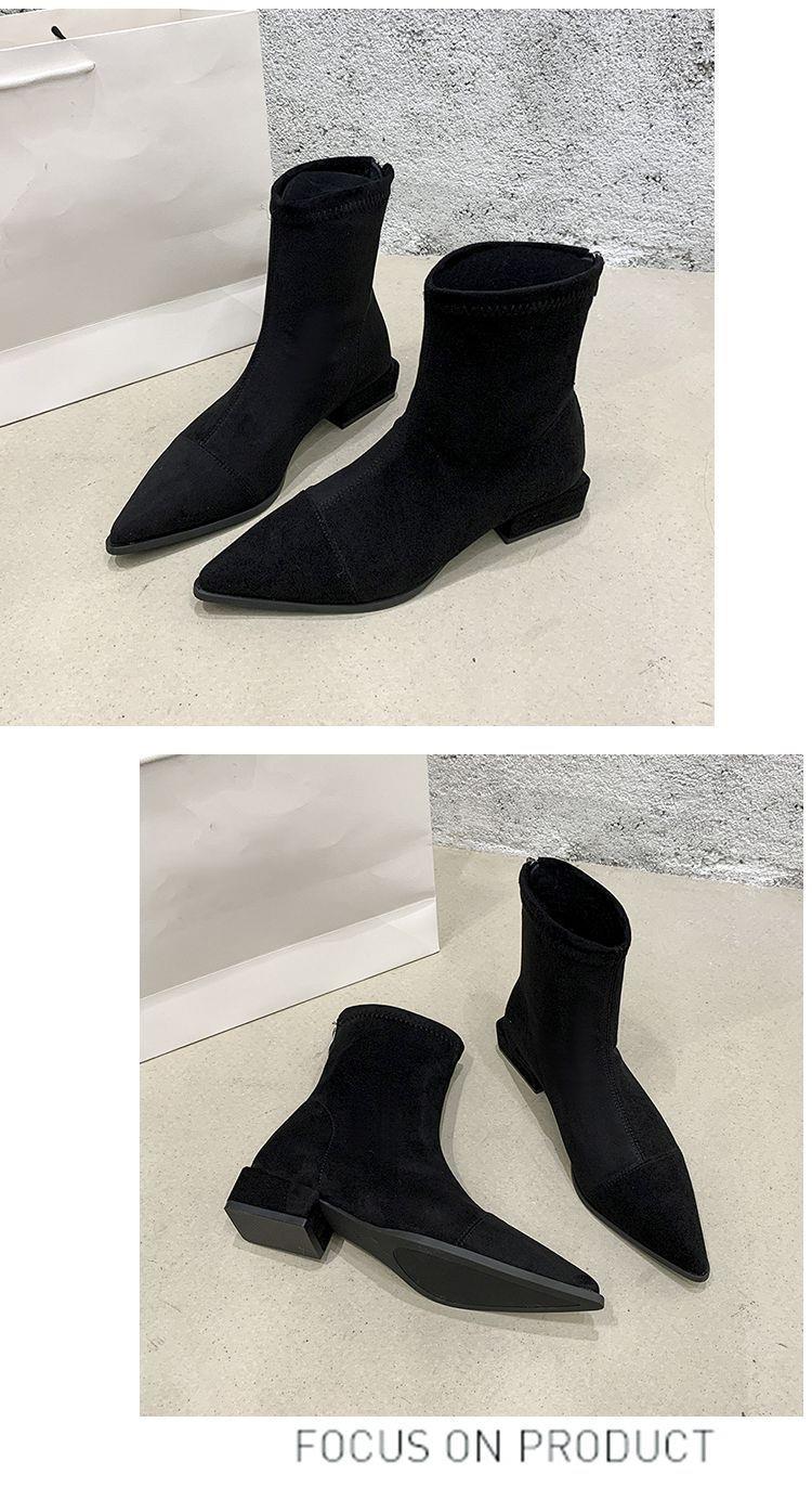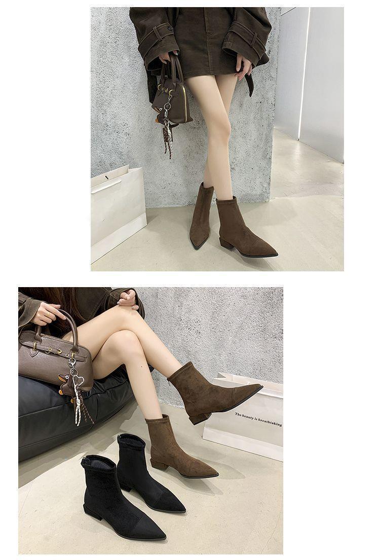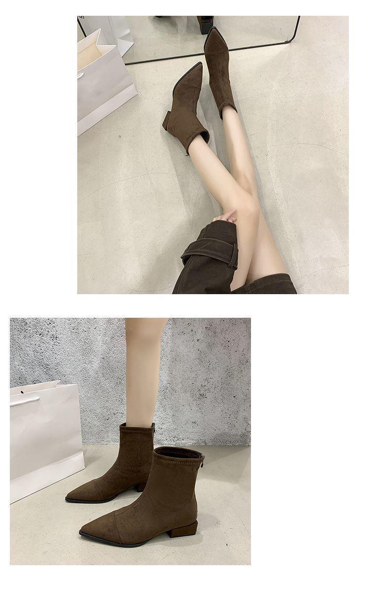 法式后拉链裸靴平底尖头短靴子时尚显瘦弹力瘦瘦靴秋冬新款35-40