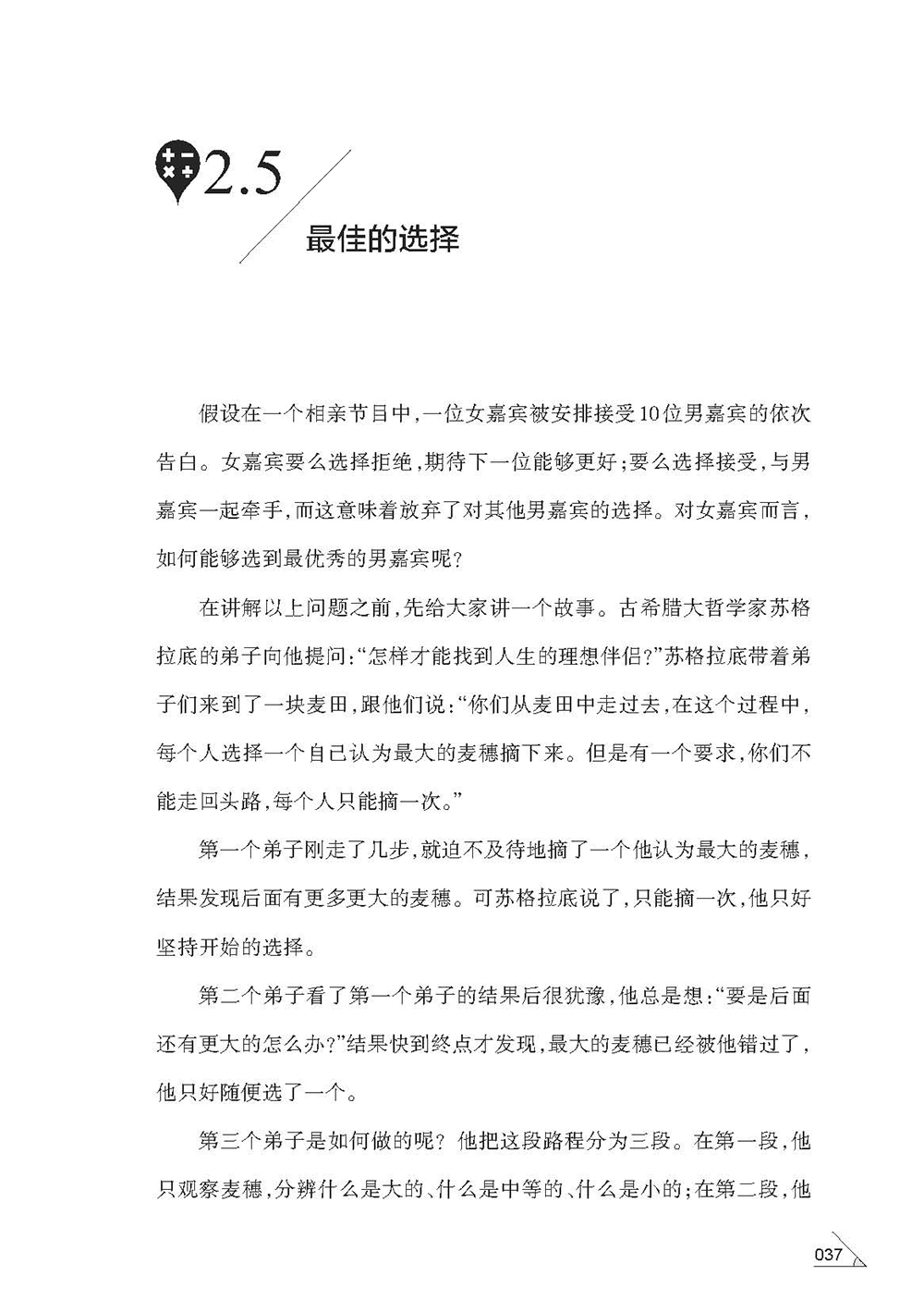 第1章 从哥德巴赫猜想谈起素数的应用1.1 哥德巴赫猜想1.2 哥德巴赫猜想的证明思路1.3 素数的应用1.4 探索素数之旅第2章 怎样洗抹布更干净无处不在的自然常数e2.1 怎样洗抹布更干净2.2 怎样存钱利息更高2.3 无处不在的自然常数e 2.4 难得的缘分2.5 最佳的选择第3章 圆周率其实很好记神奇的pi;3.1 pi;的起源与历史3.2 pi;的计算方法3.3 pi;中是否包含了宇宙的秘密3.4 我们对pi;的了解3.5 pi;的应用第4章 保险、期货与量化投资数学在金融中的应用4.1 什么是金融4.2 保险的历史与数学内核4.3 通过一个案例分析保险的价值4.4 期货是如何诞生的4.5 数学催生的金融新星量化投资第5章 宇宙究竟什么样欧氏几何与非欧几何的;相爱相杀5.1 从三角形内角和为180 度说起5.2 《几何原本》与欧氏几何5.3 非欧几何的诞生5.4 不同几何学的统一5.5 广义相对论与非欧几何5.6 宇宙的模样第6章 理发师该不该给自己理发认识经典悖论6.1 什么是悖论6.2 理发师悖论与第三次数学危机6.3 常见的经典悖论6.4 悖论与;杠精 6.5 悖论的意义第7章 该不该改变选择从;三门问题来认识概率7.1 关于;三门问题的争论7.2 概率的起源7.3 概率的意义7.4 频率学派与贝叶斯学派7.5;三门问题的概率解释第8章 赌徒必输定律概率的应用8.1 必胜方法与必输定律8.2 看得到的是概率,看不到的是陷阱8.3 赌徒谬误8.4 制胜的秘诀凯利公式第9章 海岸线究竟有多长分形与混沌9.1 神奇的分形曲线9.2 从整数维度到分数维度9.3 什么是混沌9.4;蝴蝶效应与三体问题9.5 混沌的意义与应用第10章 什么是完美身材数学中的黄金分割10.1 从断臂的维纳斯谈起10.2 无处不在的黄金分割10.3 黄金分割与斐波那契数列10.4 设计中的黄金分割第11章 无穷大有多大集合论漫谈11.1 从有限到无限11.2 希尔伯特的神奇旅馆11.3 集合论的创立11.4 无穷的本质11.5 生命有限,智慧无限