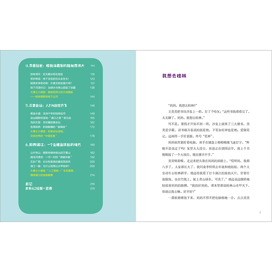 .视觉化叙事,打造沉浸式阅读:大量精美的插图、示意图、人物对话与板块设计,将复杂的科学过程可视化,仿佛将桂林山水与科学奥秘一同搬到了读者眼前,成就了一本可以;边走边读的视觉盛宴。