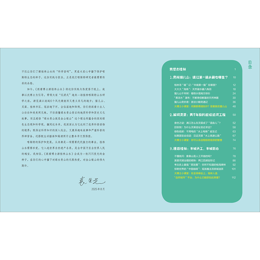 桂林山水需要珍爱,它入选世界自然遗产名录,是全中国乃至全世界人民的瑰宝。我相信,《跟着博士游桂林山水》会成为一粒闪闪发光的金种子,在孩子们的心中播下对绿水青山的无限热爱,对金山银山的伟大期许。
