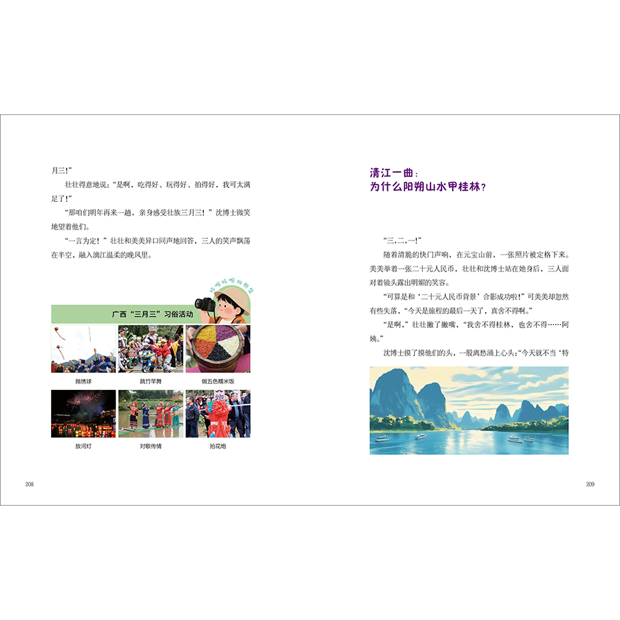 旅程中,孩子们不仅领略了;甲天下的自然风光,更在沈博士的引导下,深入了解了喀斯特地貌的亿年形成之谜、灵渠等古代工程的卓越智慧、湿地作为;漓江之肾的生态功能,以及;绿水青山就是金山银山的可持续发展理念。作品通过;皓皓小百科、;科学实验和;美美的笔记等栏目,将地质、生态、历史与民族文化知识巧妙融合,语言活泼,插图丰富。