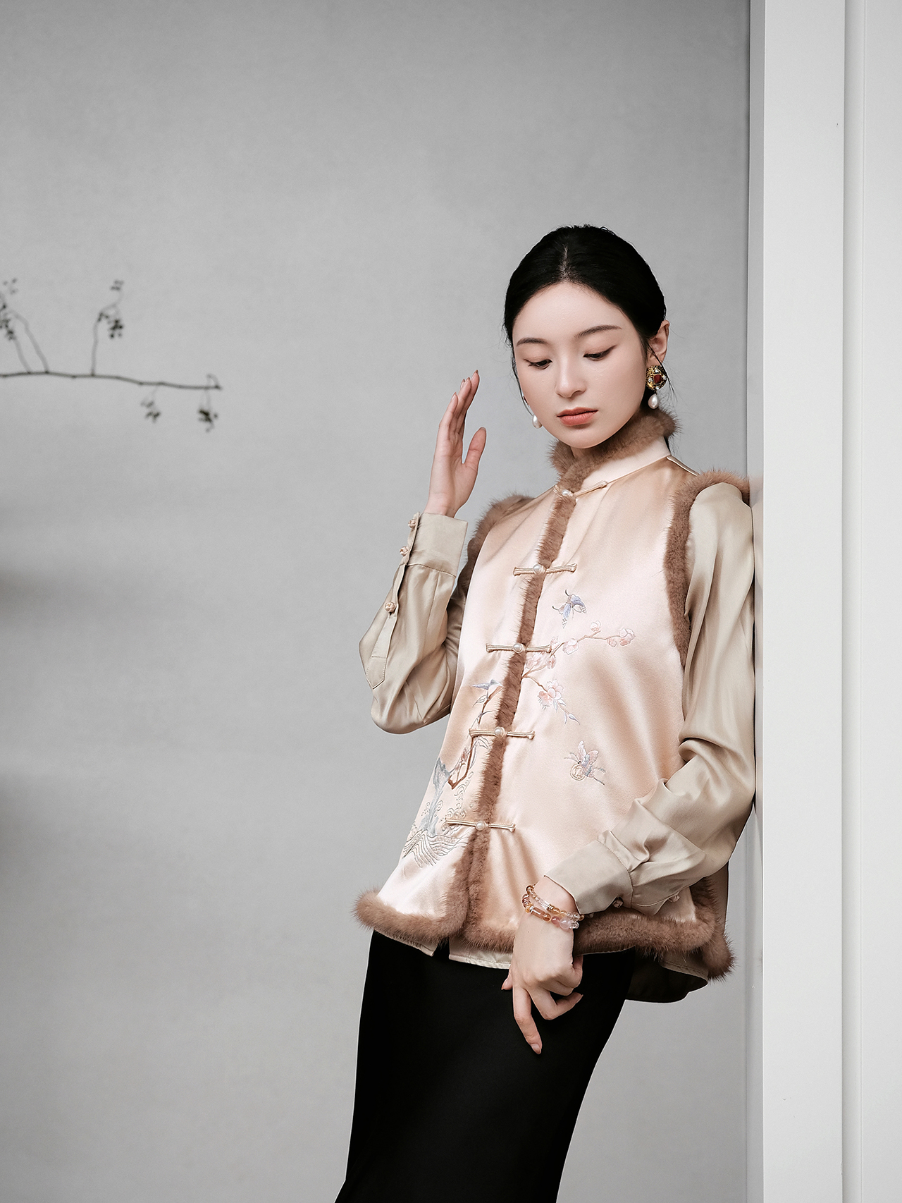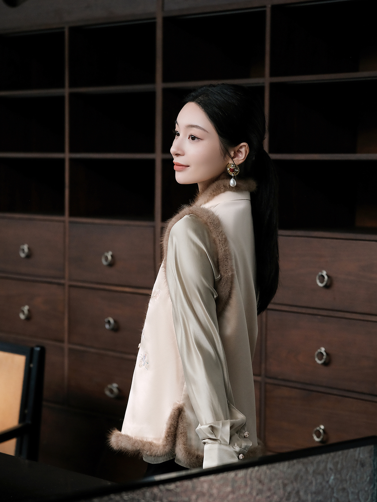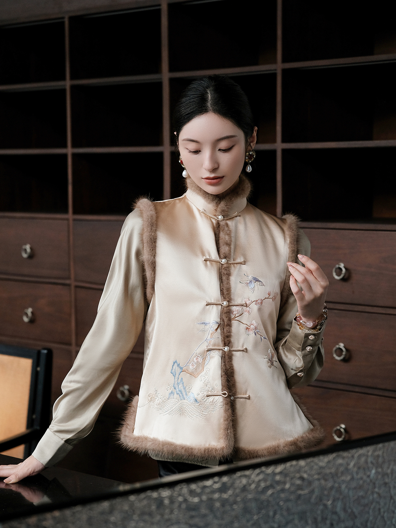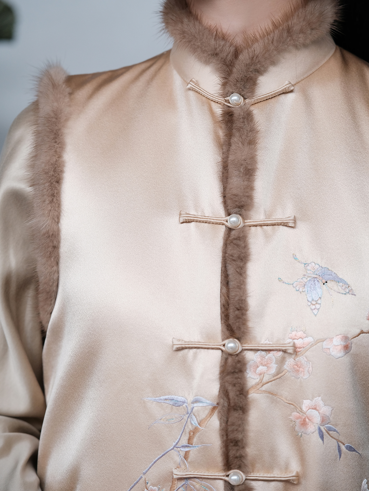 盛唐牡丹大师系列-卢梅红 | 重缎真丝水貂手绣棉马甲