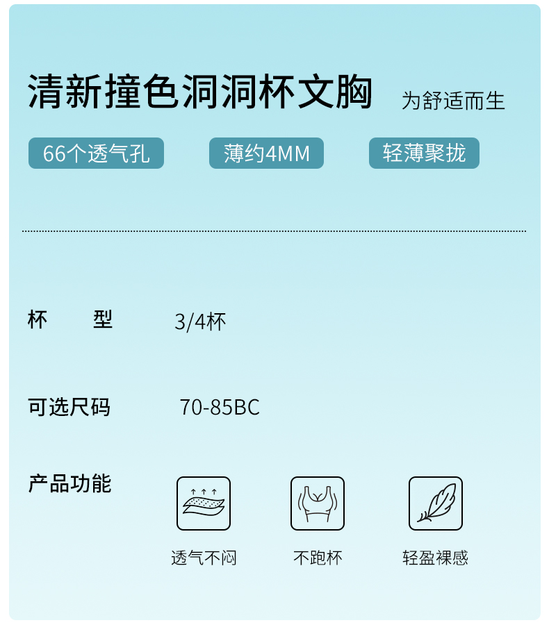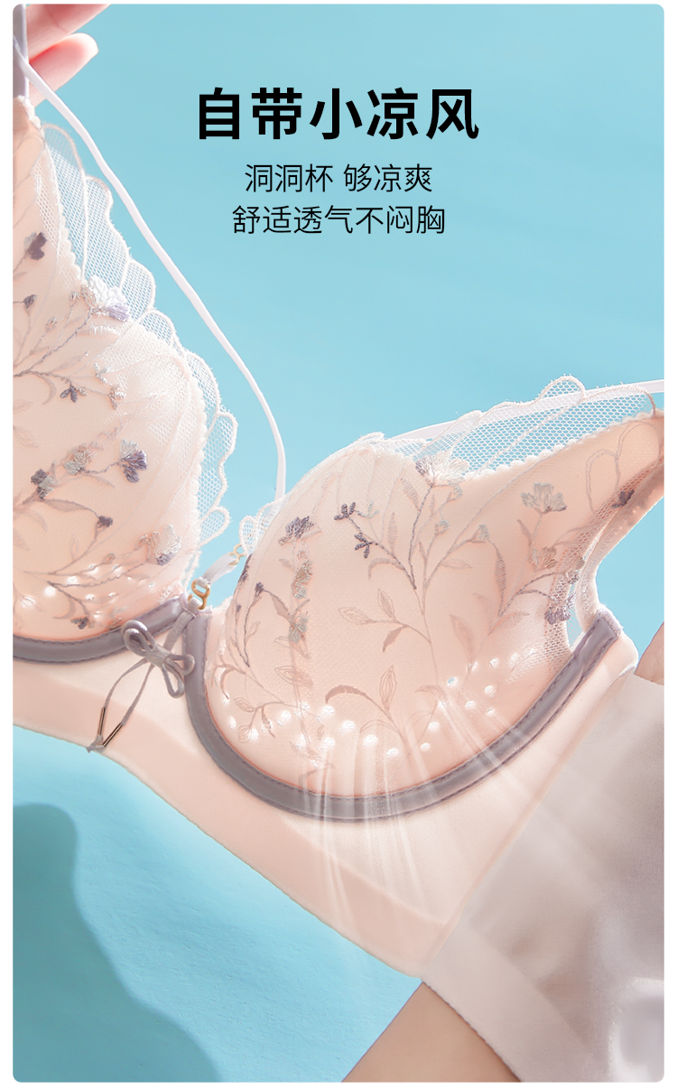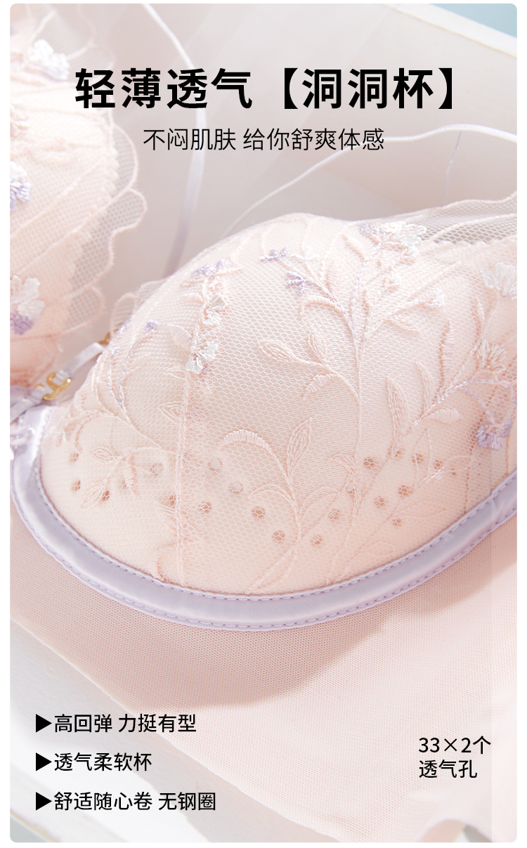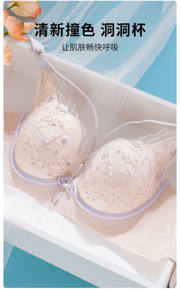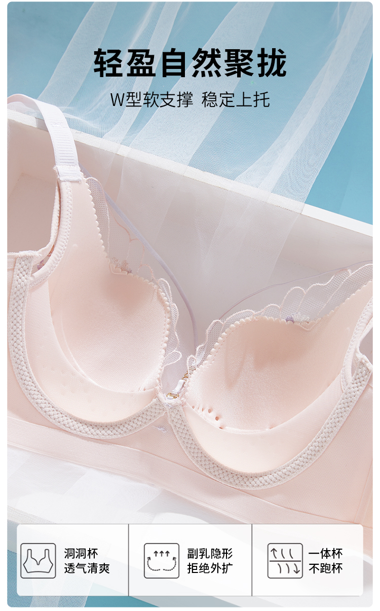 雅黛俪内衣女薄透气洞洞杯性感蕾丝无钢圈撞色聚拢上托一体杯文胸
