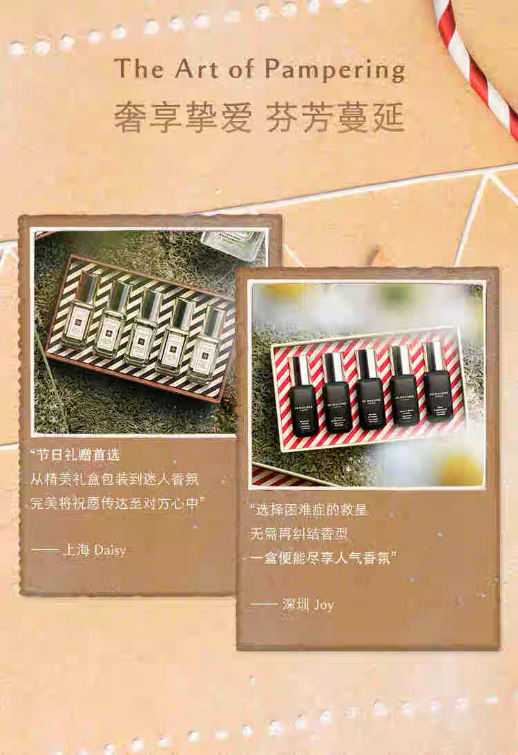 品名:Jo Malone祖玛珑明星版经典礼盒 Jo Malone London祖玛珑节日限定香氛套装 使用方法:将适量本品施用于耳后,手腕等部位肌肤上。 |