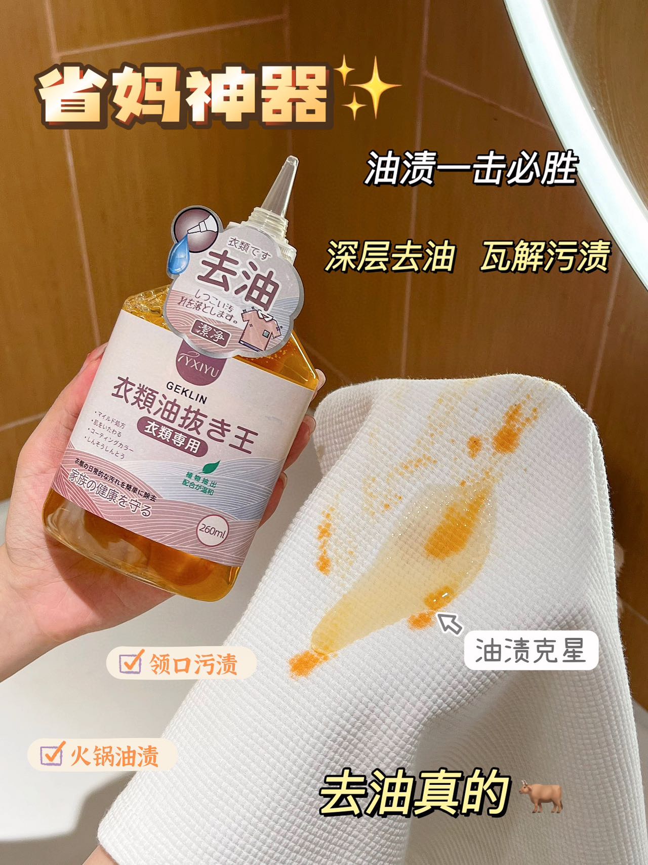 超值3瓶装【GEKLIN衣物去油王】出口日本 一瓶解决多种顽固污渍 奶渍、血渍、油渍 温和清洁不伤衣物不伤手,260ml/瓶