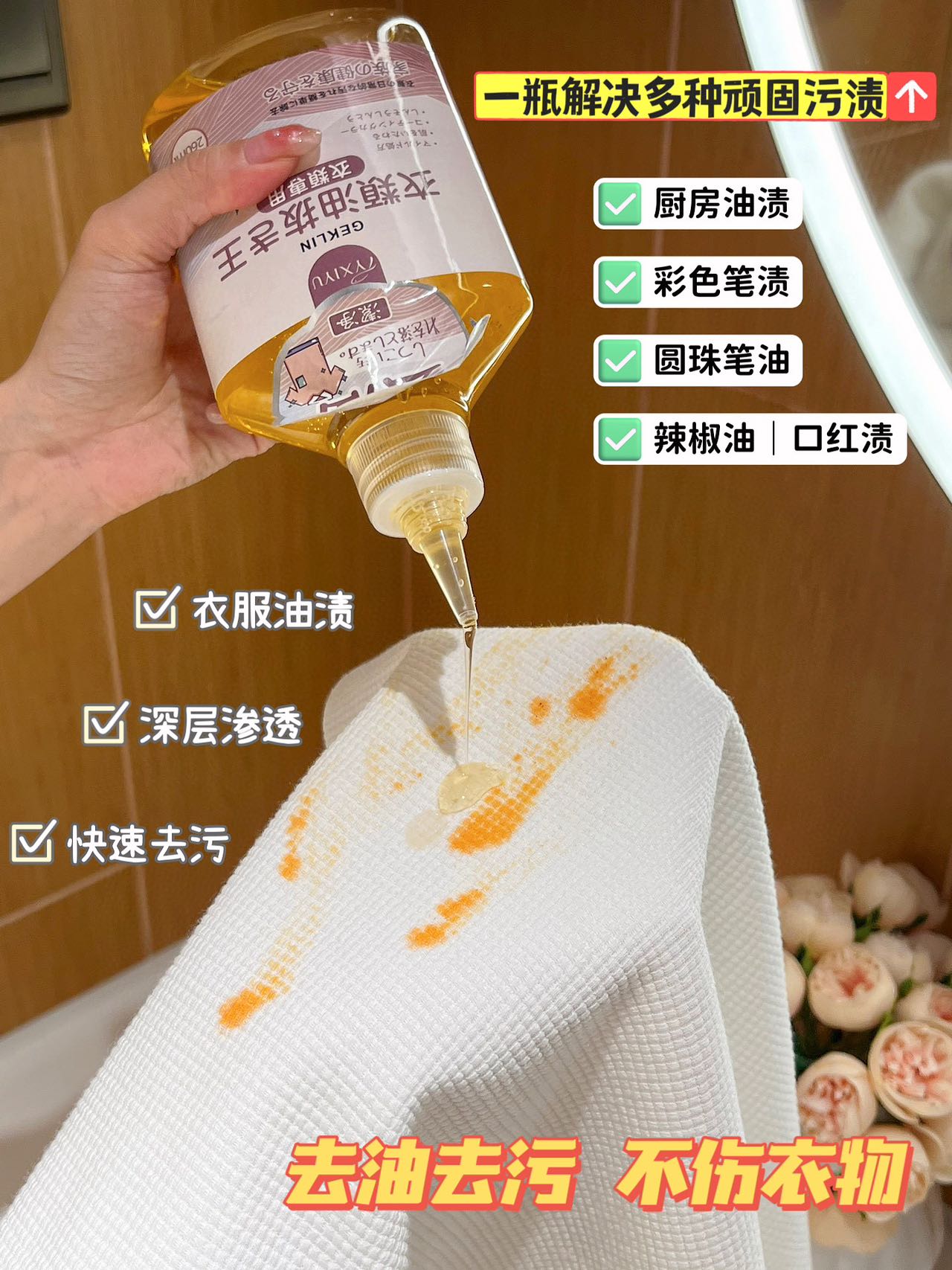 产品:GEKLIN衣物去油王 规格:260ml/瓶 发货时效:48小时内,周日及节假日顺延 发货地区:浙江 快递:中通极兔 仓库就近随机 |