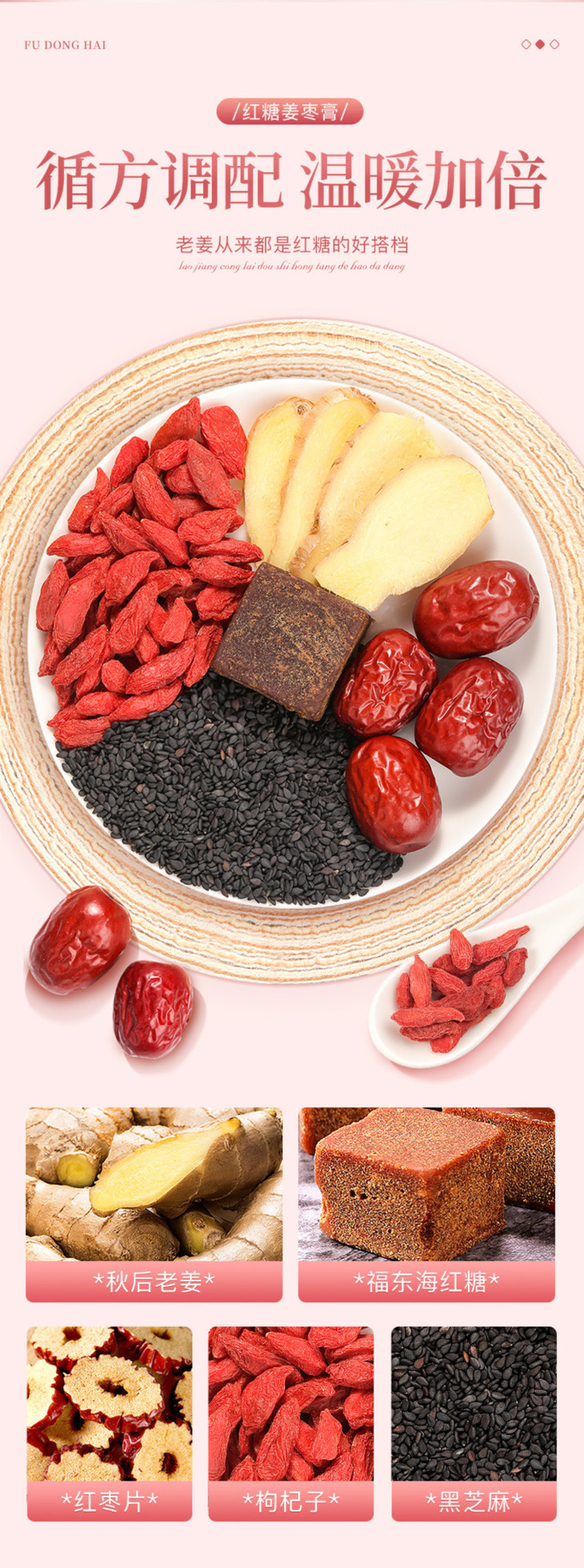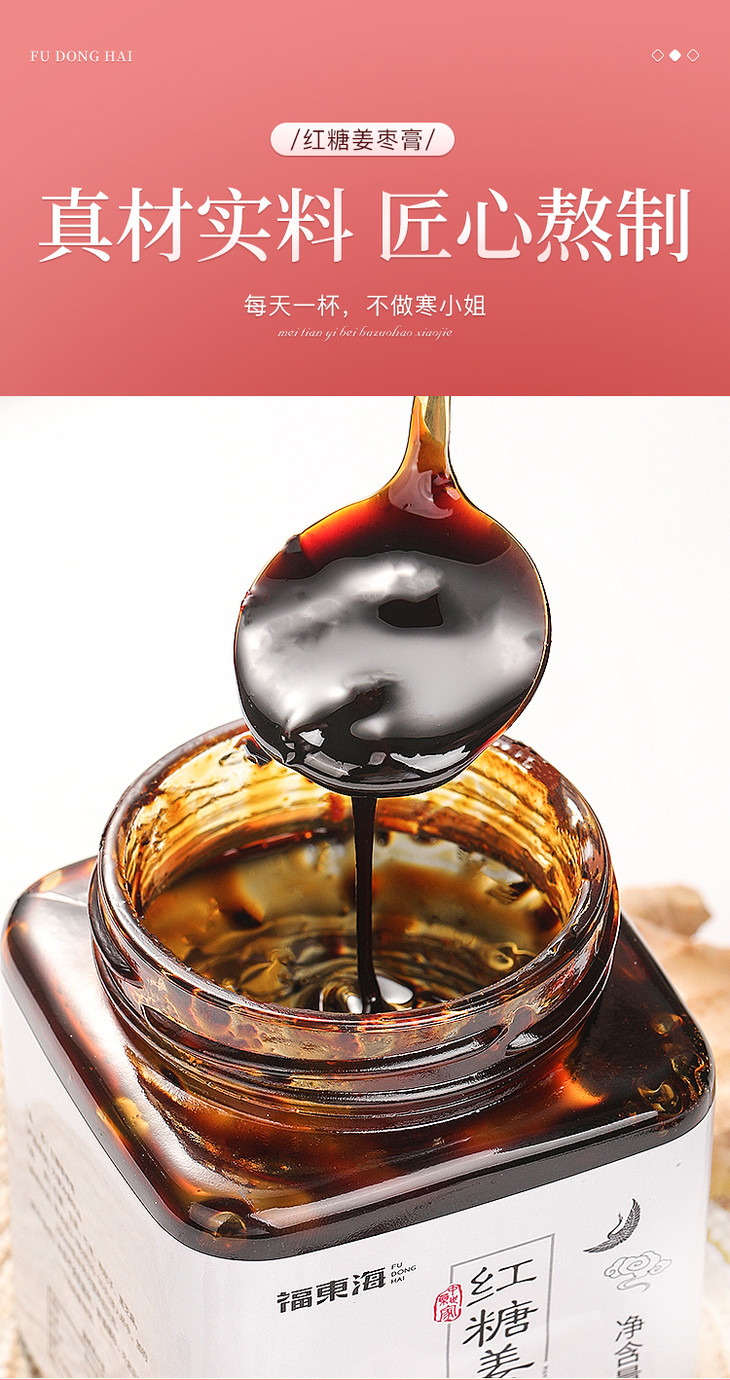 福东海的姜枣膏,是在姜糖膏的基础上再入了红枣、枸杞和芝麻熬制而成,对暖胃驱寒、手脚冰凉、调节月经都有帮助。用料也是很好,红糖来自国际长寿养生之乡遂溪 ,含有胡萝卜素、烟酸和微量元素锰、锌、铬等;生姜则是精挑细选的小黄姜 ,对增强血液循环,刺激胃液分泌、促进消化、增进食欲都有帮助;红枣就不用说了,补中益气、养血安神大家都知道;黑芝麻富含生物素、维生素E等,对养发也是好处多多啦!传统配方不断改良再结合现代工艺,制作的每一个步骤严格按照国家卫生检测标准,全程无菌室操作,每批次的产品都会进行检测,喝起来也安心有保障。