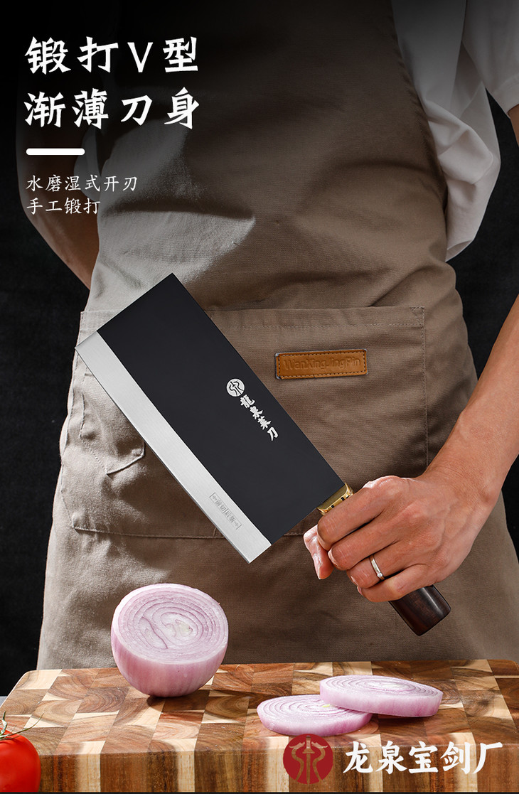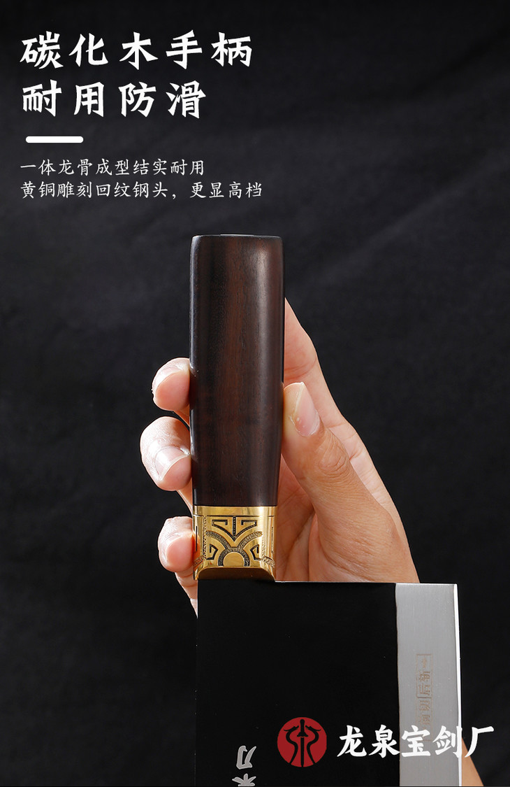追溯品牌渊源,龙泉宝剑厂承载着2600多年的铸剑传奇。自春秋战国时期起,这里锻造的兵器便以锋利坚韧闻名天下。如今,品牌延续古法精髓,融入现代科技,将这份跨越千年的技艺注入厨具,才有了这把集实用与艺术于一身的斩切刀。