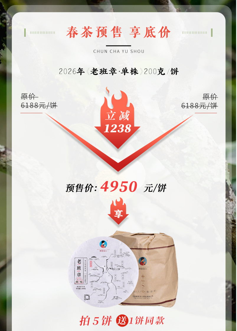 【预售8折,买5送1】2026《老班章单株》古树春茶 200克*1饼 生茶