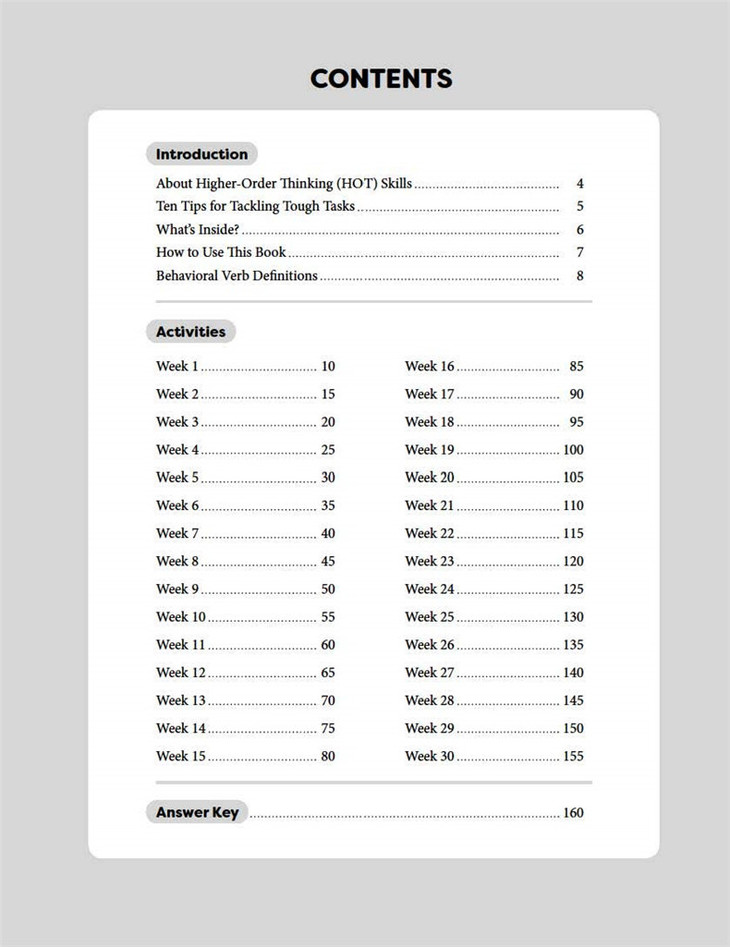 通过每日高阶思维三年级教师版书籍帮助您的三年级学生发展他们的批判性思维和解决问题的技能。我们的书包括每天20分钟的课程,教师可以将其作为热身活动、提前完成的任务和GR的小组项目。这些活动将包括逻辑难题、视觉难题、脑筋急转弯、创造性写作任务和文字游戏,所有这些都将使你的三年级学生在学习高阶思维技能的同时保持娱乐。