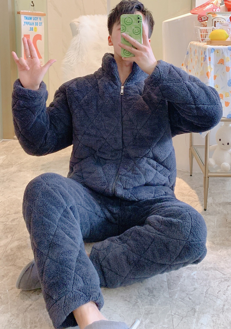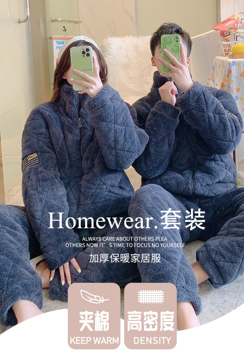 【服饰鞋包】秋冬季珊瑚绒三层夹棉加厚拉链款情侣家居服套装