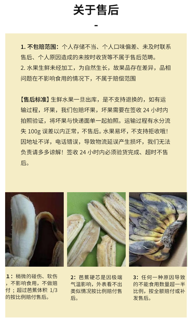 【注意事项】:我们发出的香蕉是根据基地采摘情况发货,无催熟剂,生态自然成熟,具体以收到果子情况为准,催熟时间受催熟方式和催熟温度而定,2-10天不等