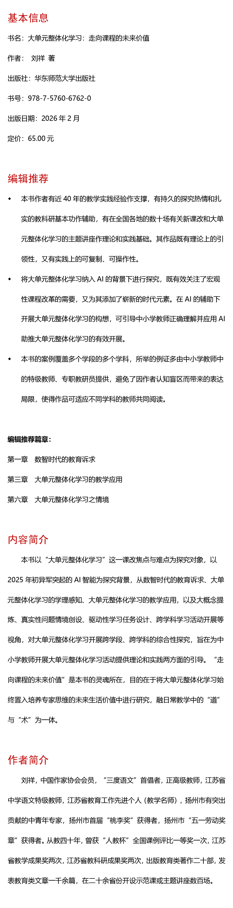 大单元整体化学习 走向课程的未来价值 大夏书系 教师专业发展 刘祥