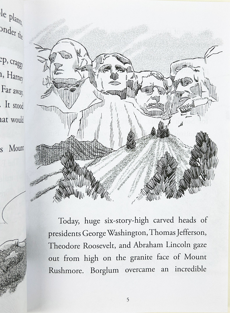 The Borglum party clambered up steep, craggy slopes to the top of the tallest mountain, Harney Peak. All around was a wonderful view. Far away, Gutzon could see a granite mountain. It stood higher than the surrounding peaks. That would be the place for his giant sculpture!