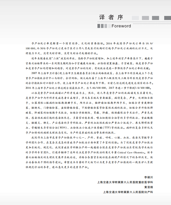 本书内容经典,汇聚了世界顶尖重症科、产科与新生儿专家的医疗经验,是产科重症学的权威专著,具有较高的学术价值。本书由上海交通大学附属第六人民医院的重症医学科联合产科,一起邀请全国在危重孕产妇救治具有较高学术地位的多学科专家团队,引进并翻译了这部关注危重孕产妇救治的英文专著。本专著从妊娠相关的生理改变展开系统论述,并结合各器官系统功能在病理产科情况下的各种改变,给予临床干预的指导建议。希望这本专著的翻译出版可以为更多危重孕产妇抢救的一线医护人员提供规范诊治的参考,进而惠及更多的危重孕产妇。