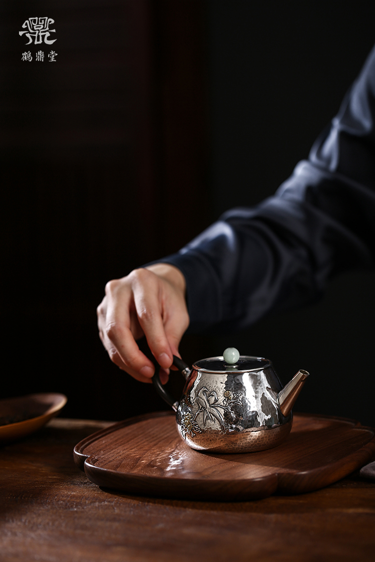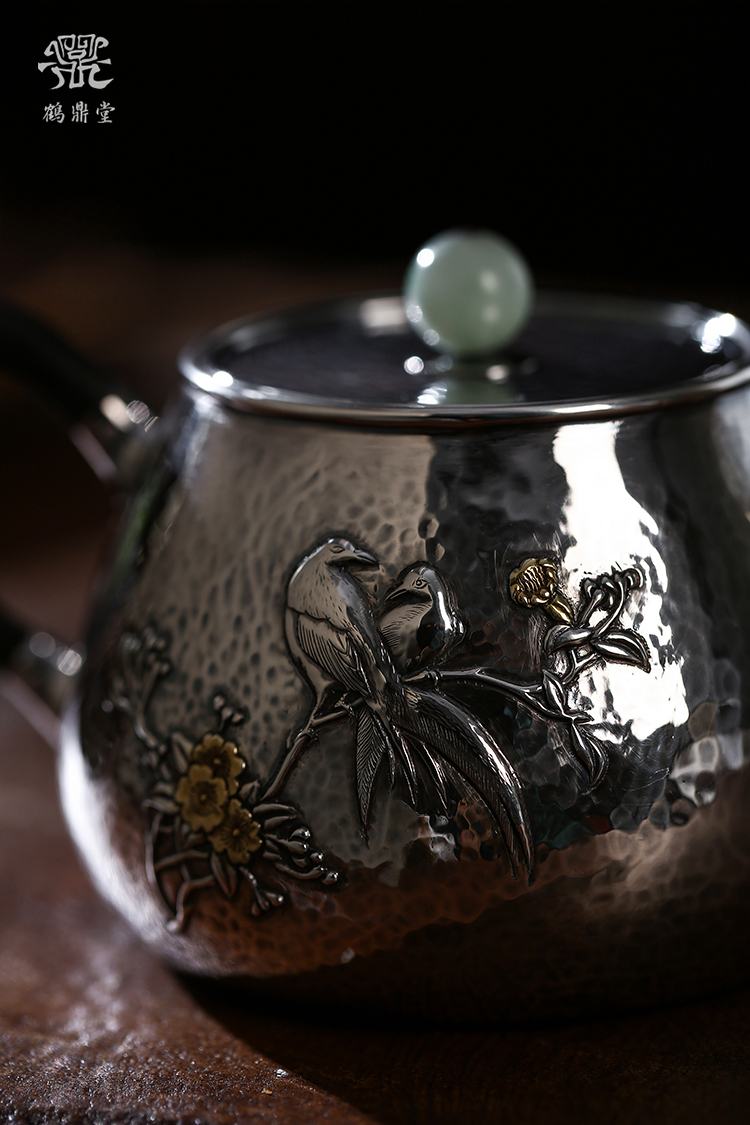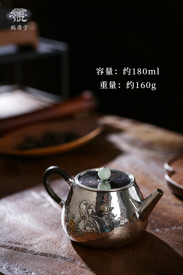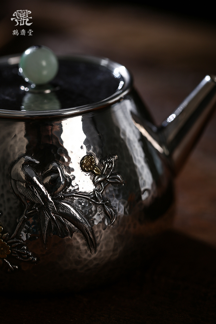 鹤鼎堂银壶闻天系列景山槌目纹錾刻鸟语花香急须(银色)(缺货)