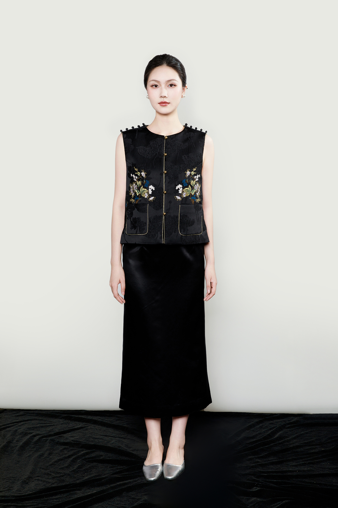 盛唐牡丹 |老工艺花蕾缎真丝马甲正反两穿