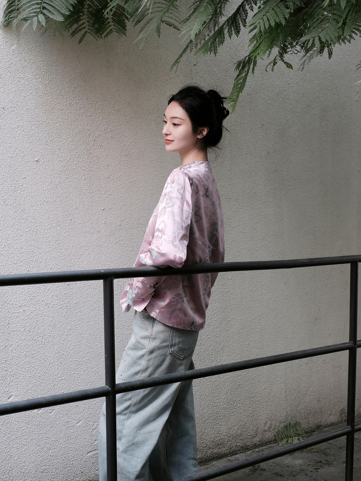 盛唐牡丹 | 粉色蝶恋花/紫色喜鹊缠枝真丝提花褶皱上衣