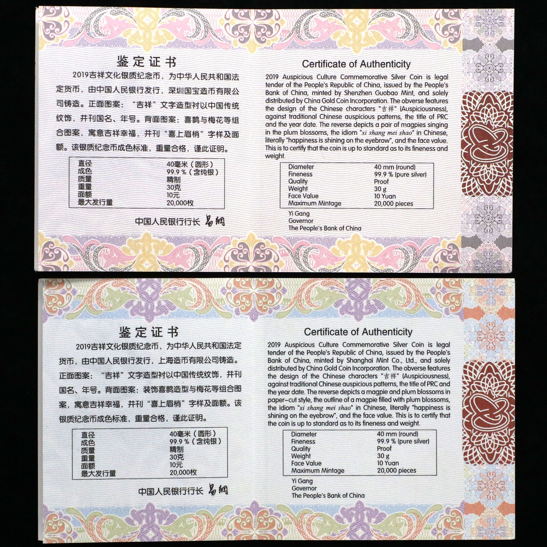 【活动专享】2019年吉祥文化—喜上眉梢银币 30克*2枚 原盒证