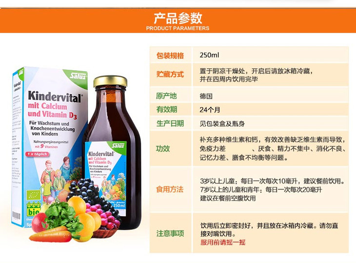 【保税区包邮直发】德国 Salus莎露斯 Floradix 儿童铁元 维生素果蔬补钙口服液 250ml