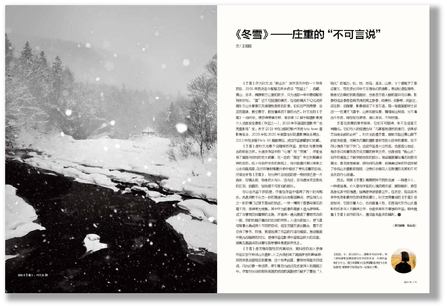 叶文龙融合高速闪光与长时间曝光两种摄影技法,用数千分之一秒的超高速闪光凝固雪花,用超长慢门去记录雪丝的轨迹,使一张照片同时承载了两个时间概念。《冬雪》是叶文龙“新山水”创作系列中的一个项目,是当代山水影像与人文精神之作,也是中华文化观照下的极具东方意趣的作品。