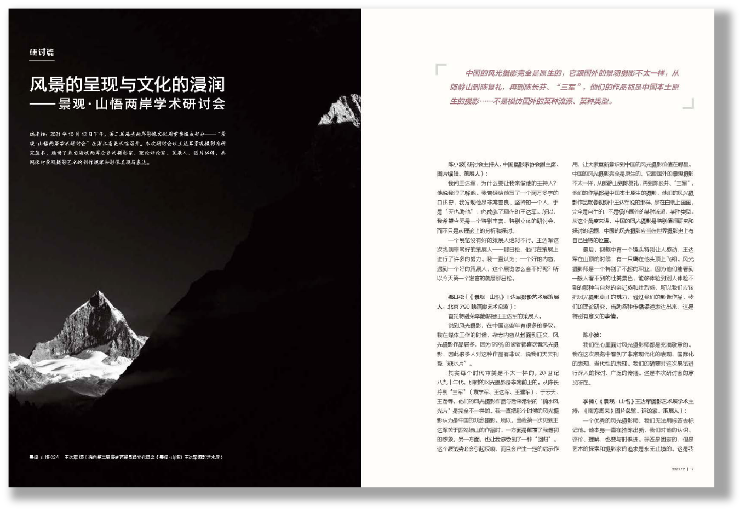 来自海峡两岸的摄影家、理论评论家、策展人、图片编辑以王达军的《景观• 山悟》为蓝本,探讨了景观摄影艺术的创作规律和影像呈现与表达。庄跃成撰写了《提升影像的审美境界》一文,提出了“摄影审美的中华语境”观点,阐释了中华文化之于摄影的价值。