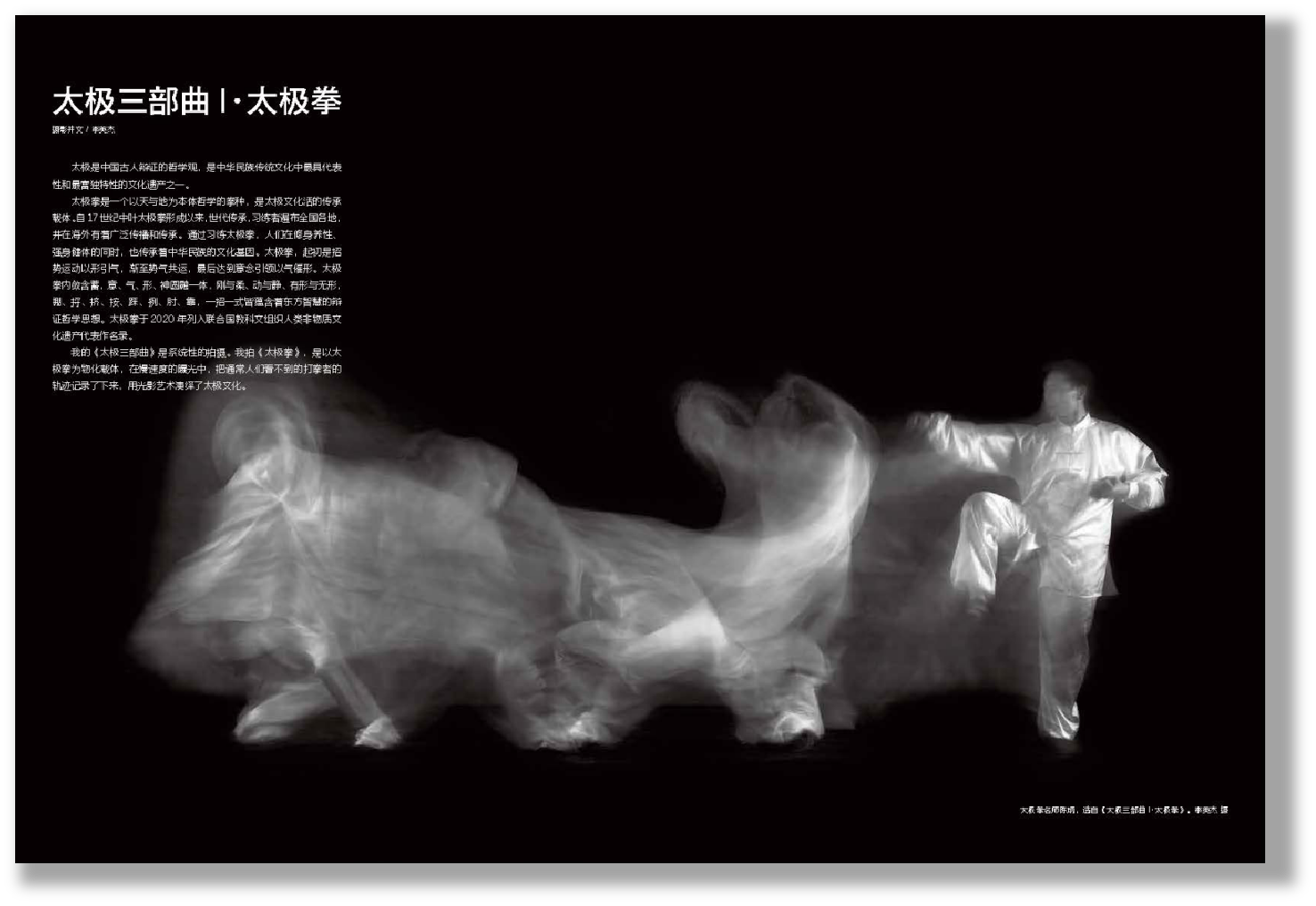 本期“个案研究”栏目,呈现了李英杰、叶文龙的摄影艺术探索。《太极三部曲》《冬雪》是两位艺术家匠心独运的成果。“惚兮恍兮,其中有象;恍兮惚兮,其中有物”。李英杰穷十数年之功,跋山涉水,觅迹寻源,仰则观法于天,俯则察勘于地,创作了太极拳、太极图、河洛象《太极三部曲》。