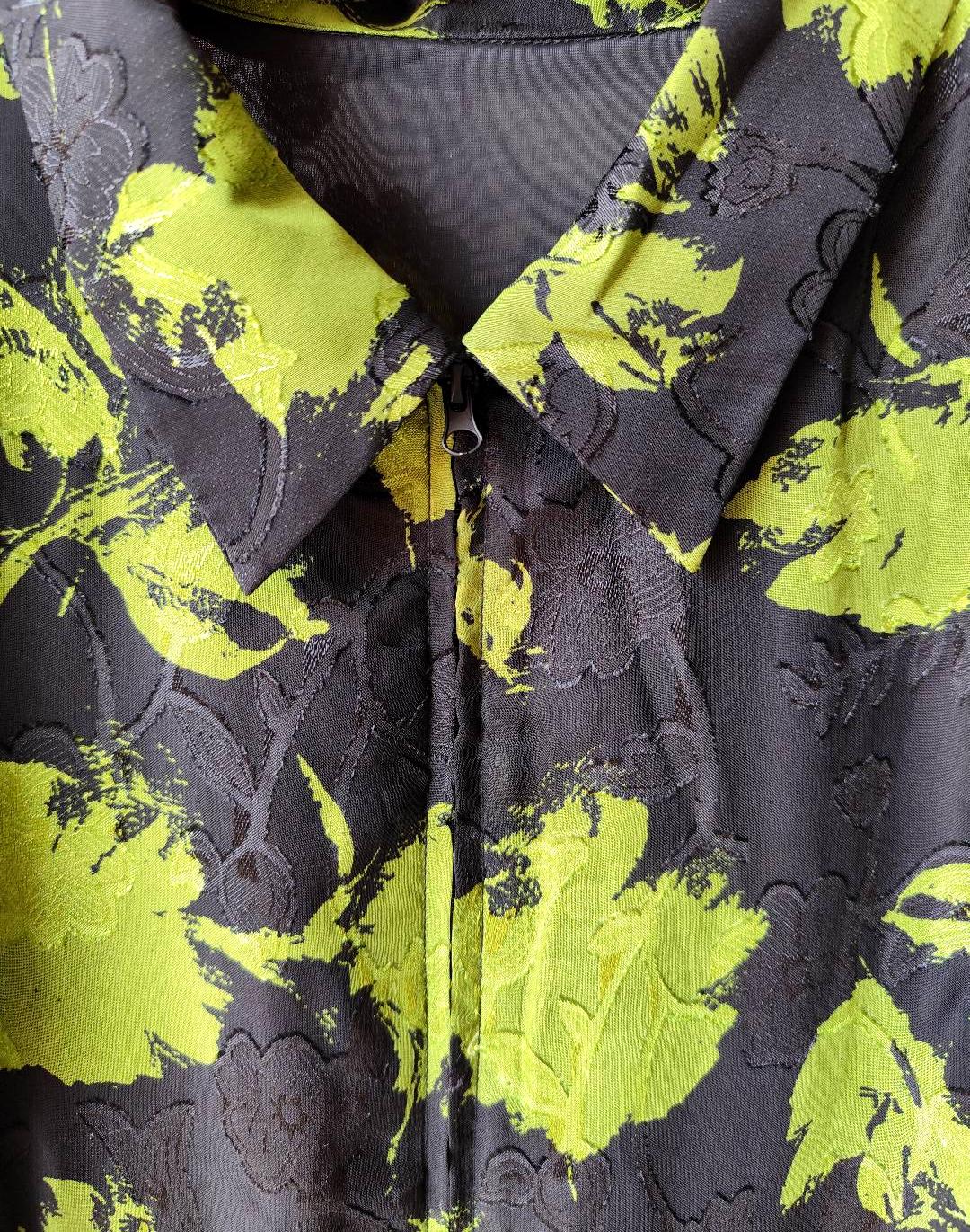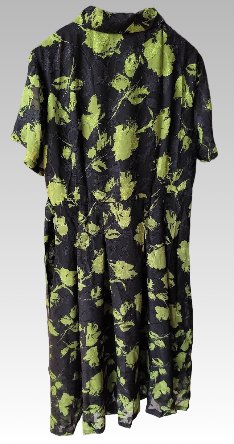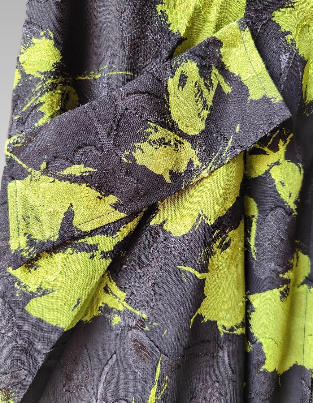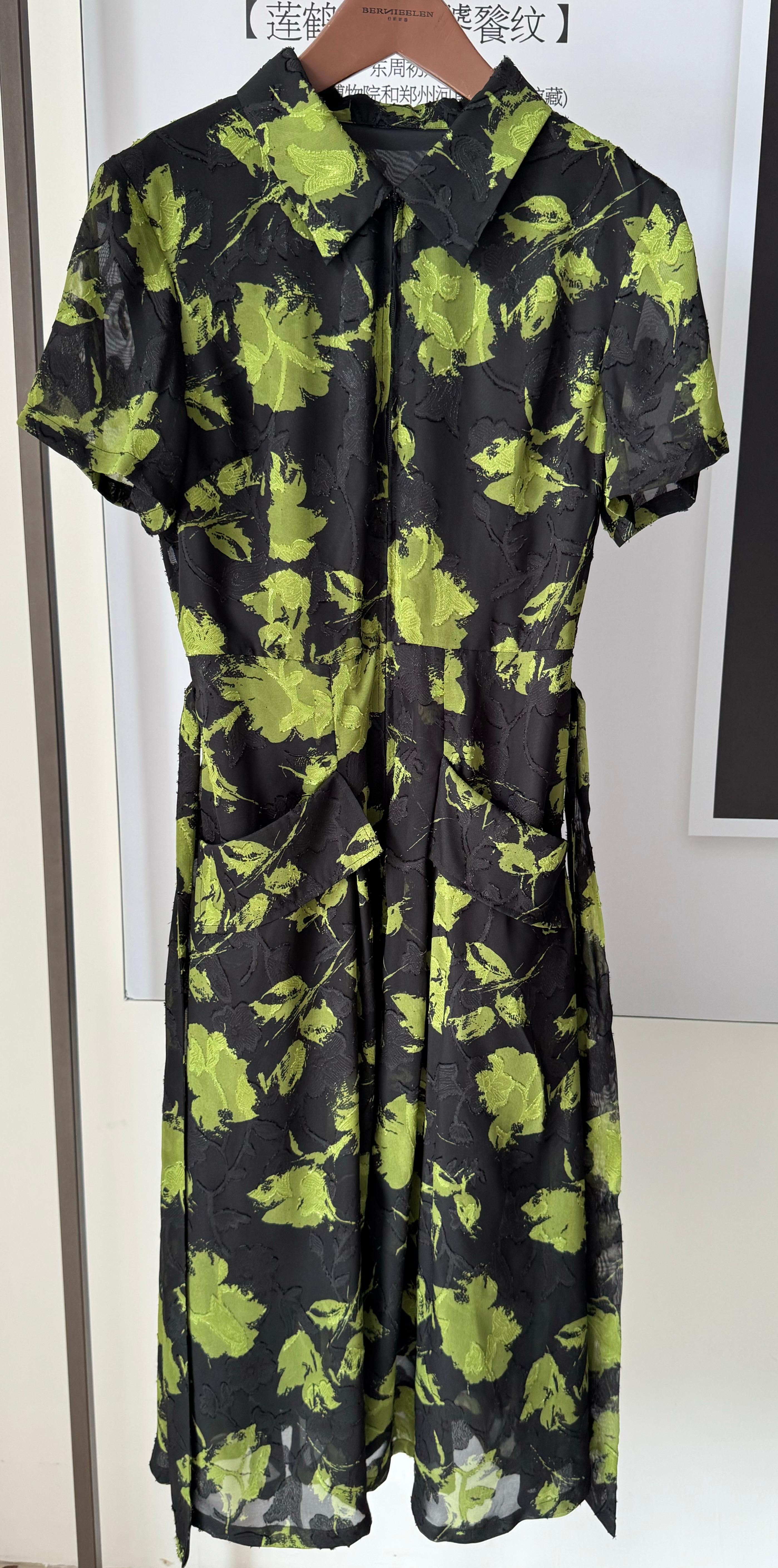 伯妮斯茵 | 复古轻奢 黑底绿花提花雪纺裙 立体肌理工艺 系带收腰显瘦 气质约会款 复古翻领烧花连衣裙 SZ3S12-水龙吟