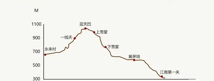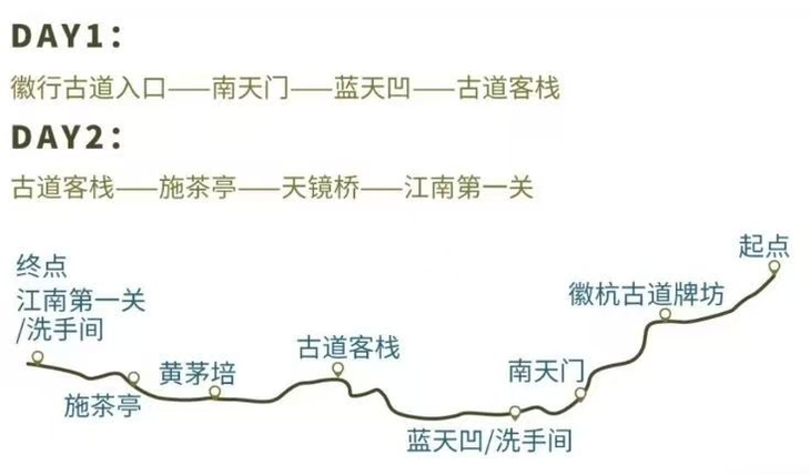 第一天:古道初体验(约9-10公里),起点 → 蓝天凹 → 下雪堂 → 入住古道人家客栈,第二天:精华穿越(约8公里,一路下坡)古道客栈→施茶亭→ 江南第一关 。
