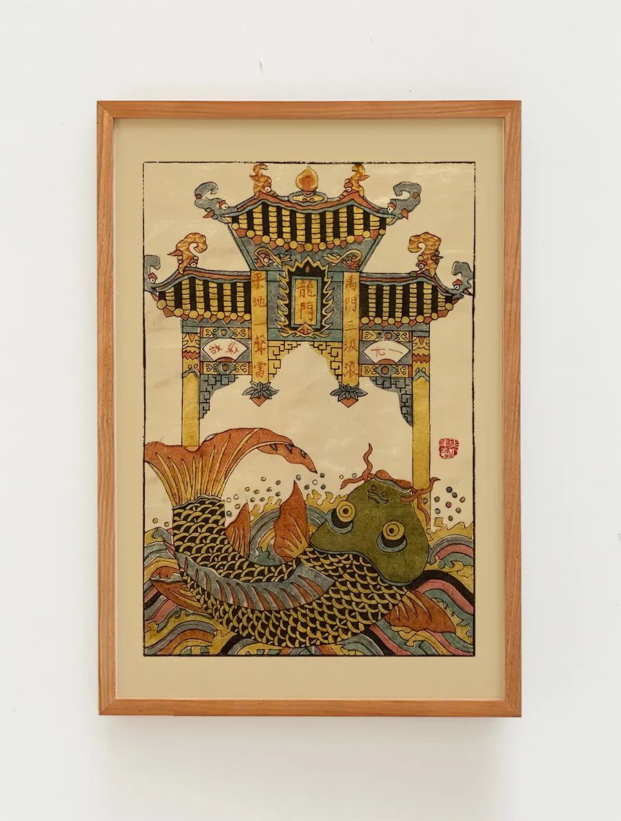 典故:这是我们最喜爱的一幅夹江年画。之所以去夹江找年画,起因也是因为发现了这幅着色和笔触都达到很高艺术水准的年画。古代传说黄河鲤鱼跳过龙门,就会变化成龙。所以以“鲤鱼跳龙门”比喻中举、升官等飞黄腾达之事。后来又用作比喻逆流前进、奋发向上。