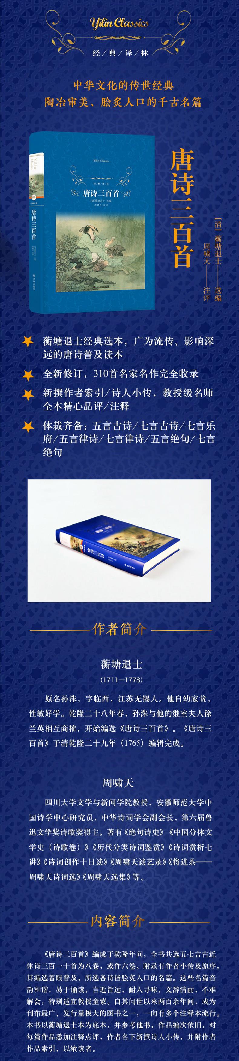 《唐诗三百首》编成于乾隆年间,全书共选五七言古近体诗三百一十首为八卷,或作六卷。附录有作者小传及原序。其编选着眼普及,所选各诗皆脍炙人口的名篇。这些名篇音韵和谐,易于诵读,言近旨远,耐人寻味,文辞清丽,不难解会,特别适宜教授童蒙。自其问世以来两百余年间,成为刊布很广、发行量很大的图书之一,一向有多个注释本流行。本书以蘅塘退士本为底本,并参考他书,作品编次依旧,对每篇作品悉加注释点评,作者名下新撰诗人小传,并附作者作品索引,以飨读者。