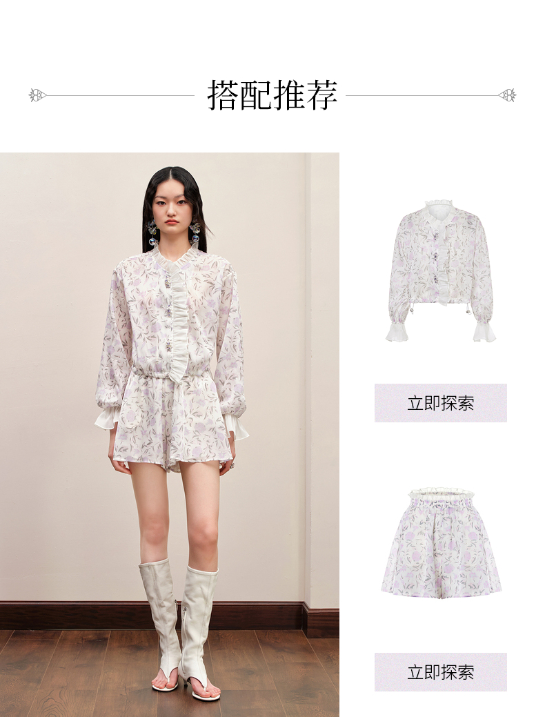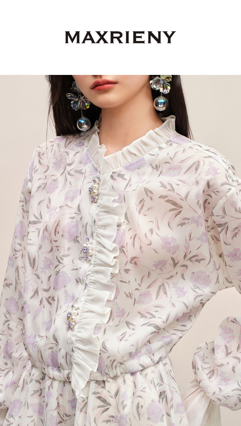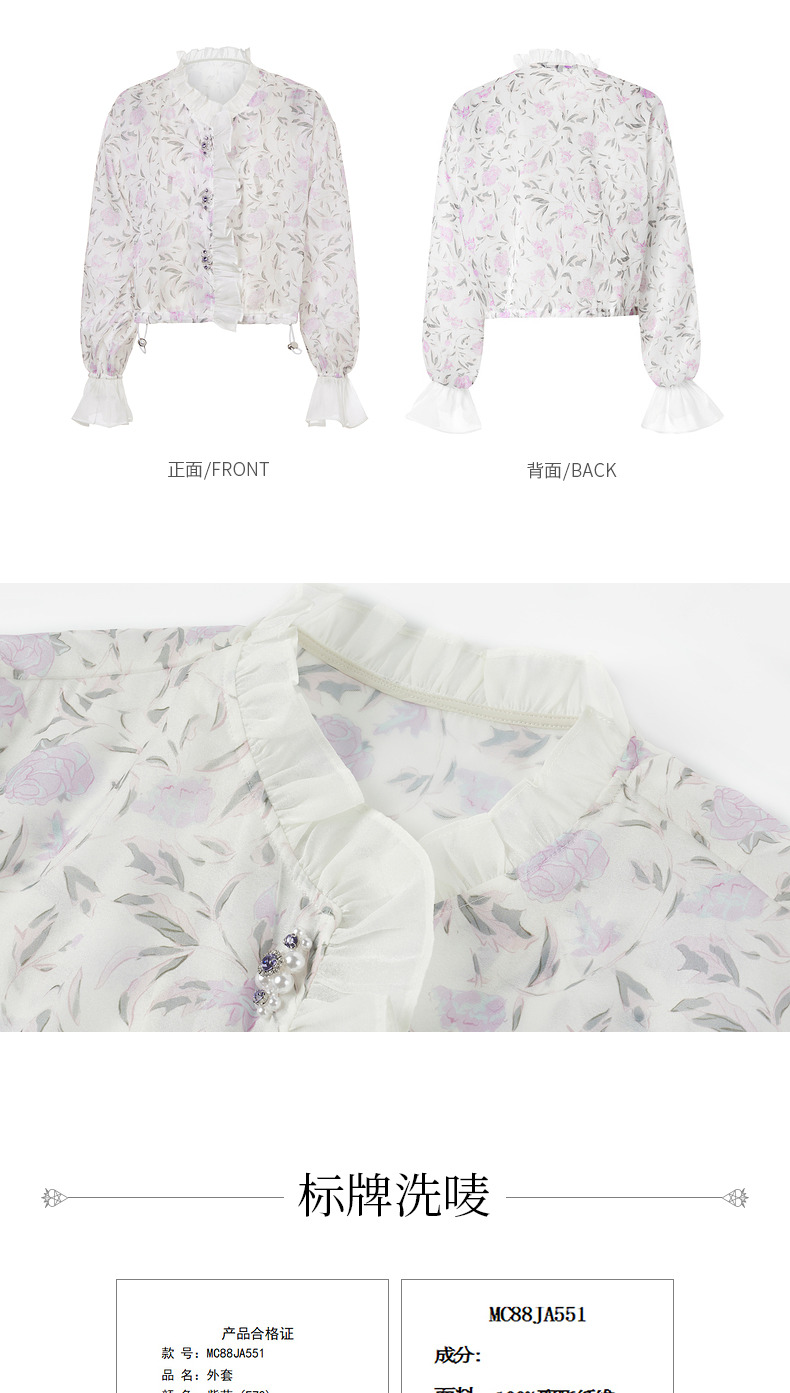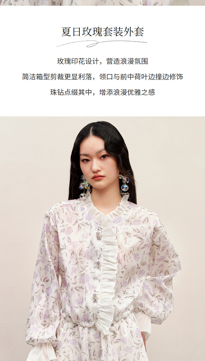 玛克门店发货:MAXRIENY玫瑰印花衬衫套装甜美浪漫氛围感欧根纱外套(货号:MC88JA551)