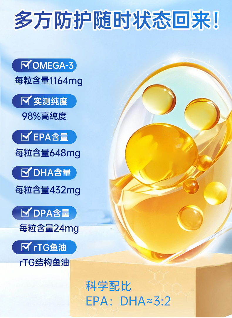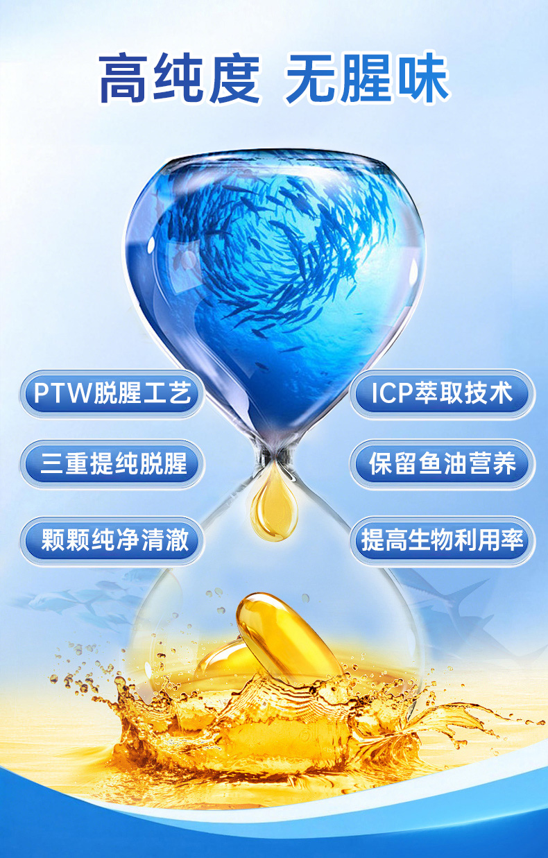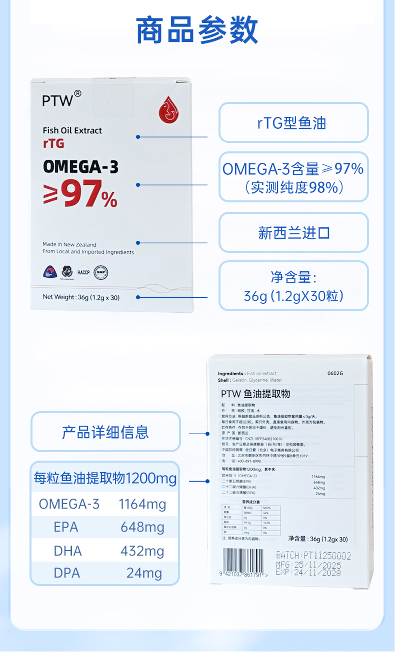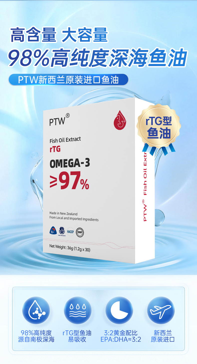 PTW新西兰进口rTG型鱼油9倍吸收高浓缩实测98%omega3深海鱼油