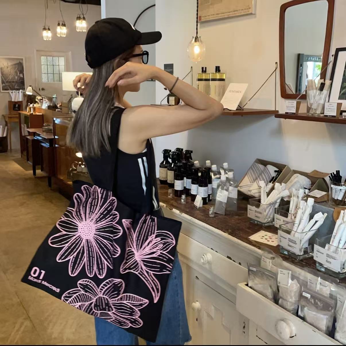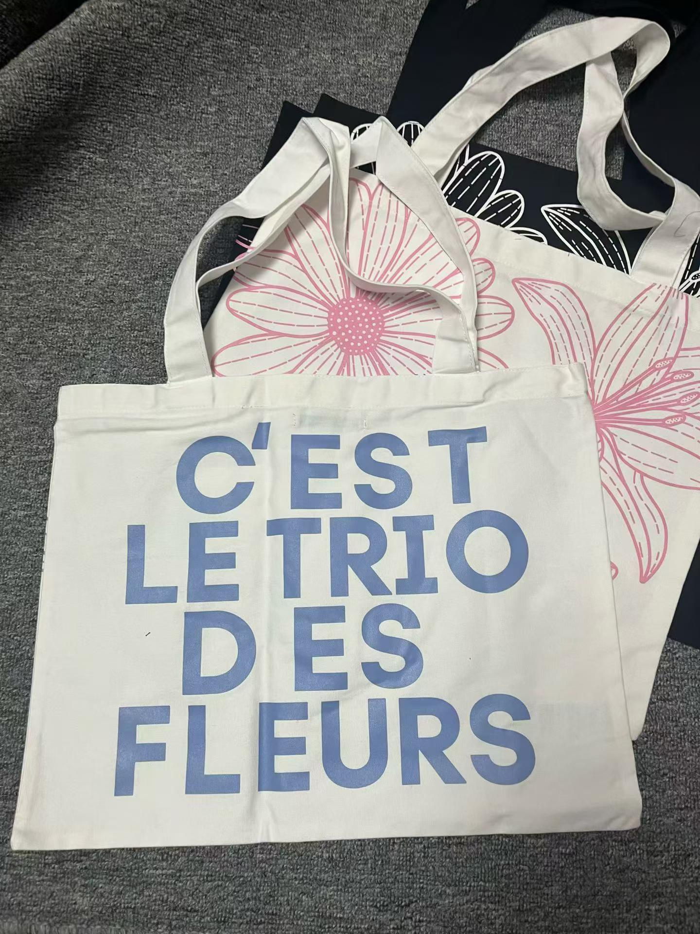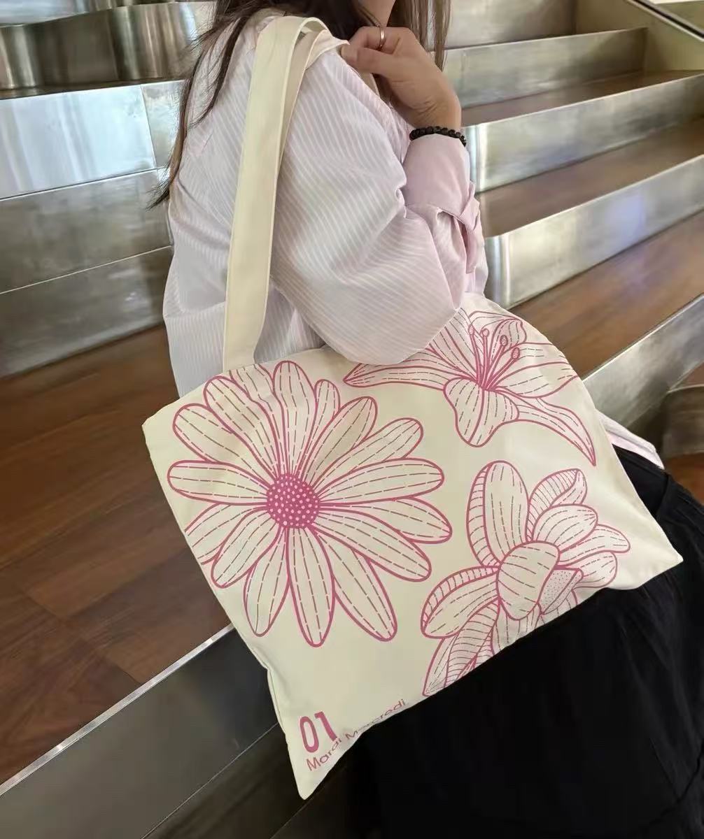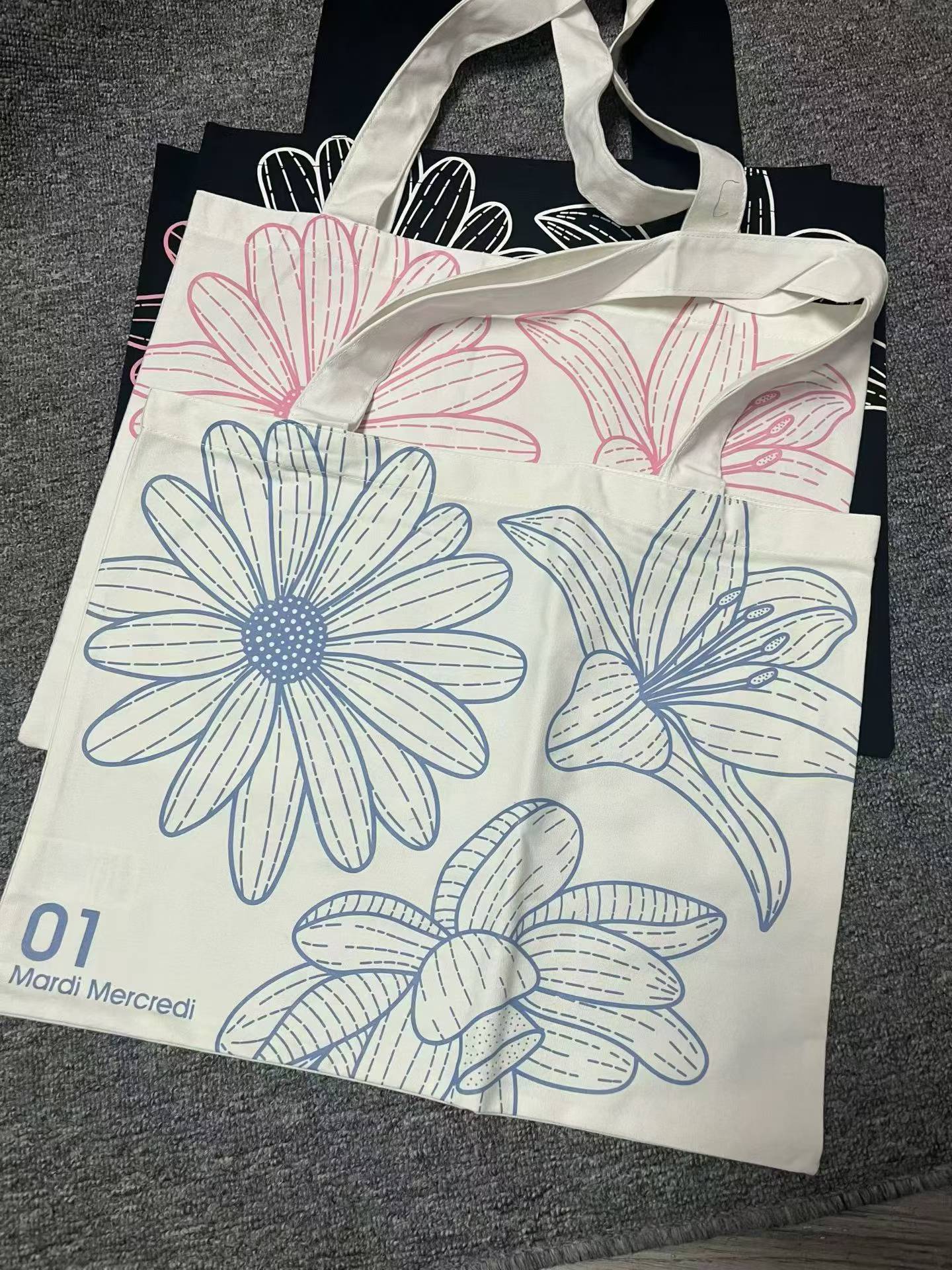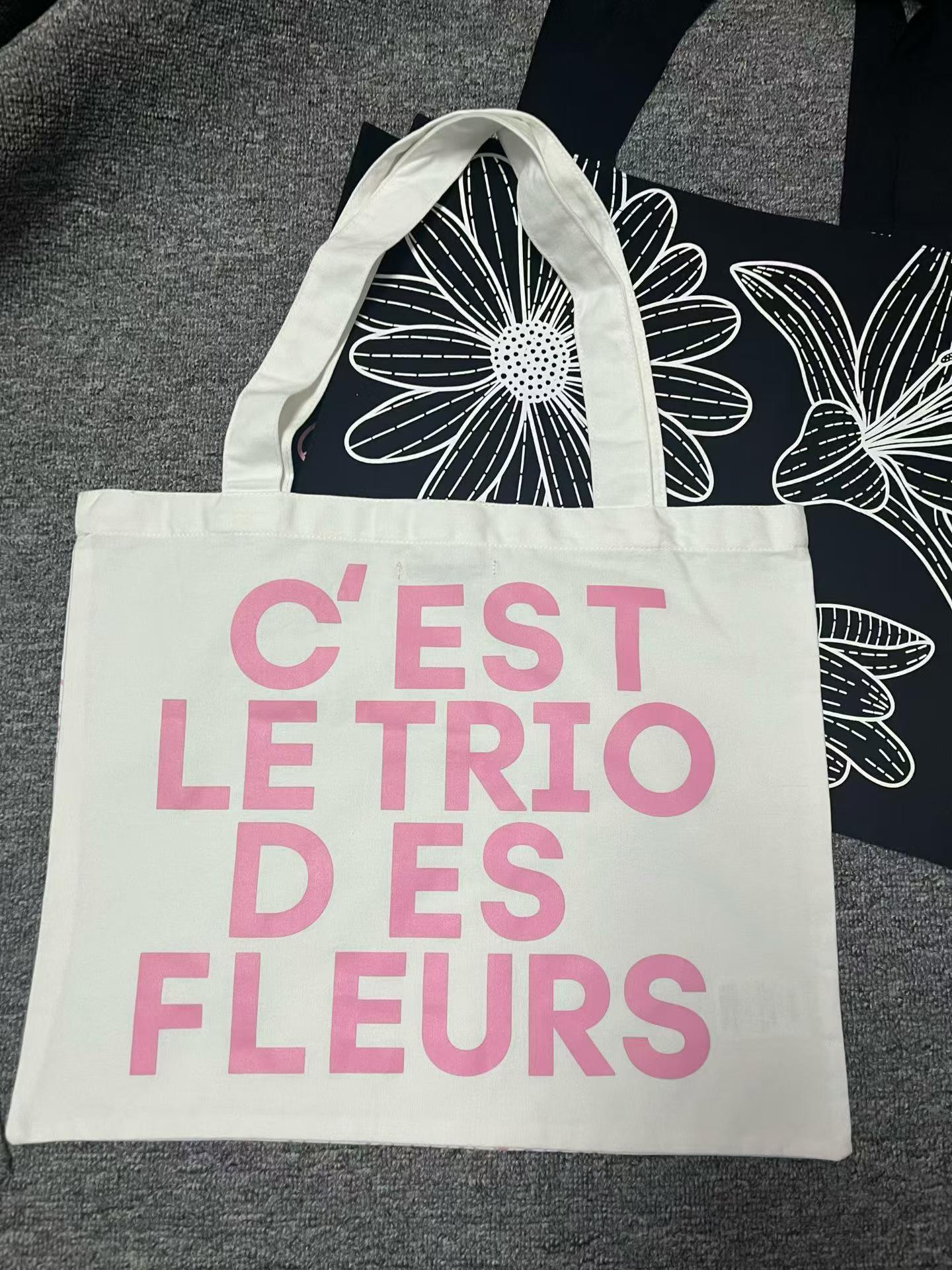 双面印花的帆布包,一面是标志性的雏菊图案,一面是撞色字母