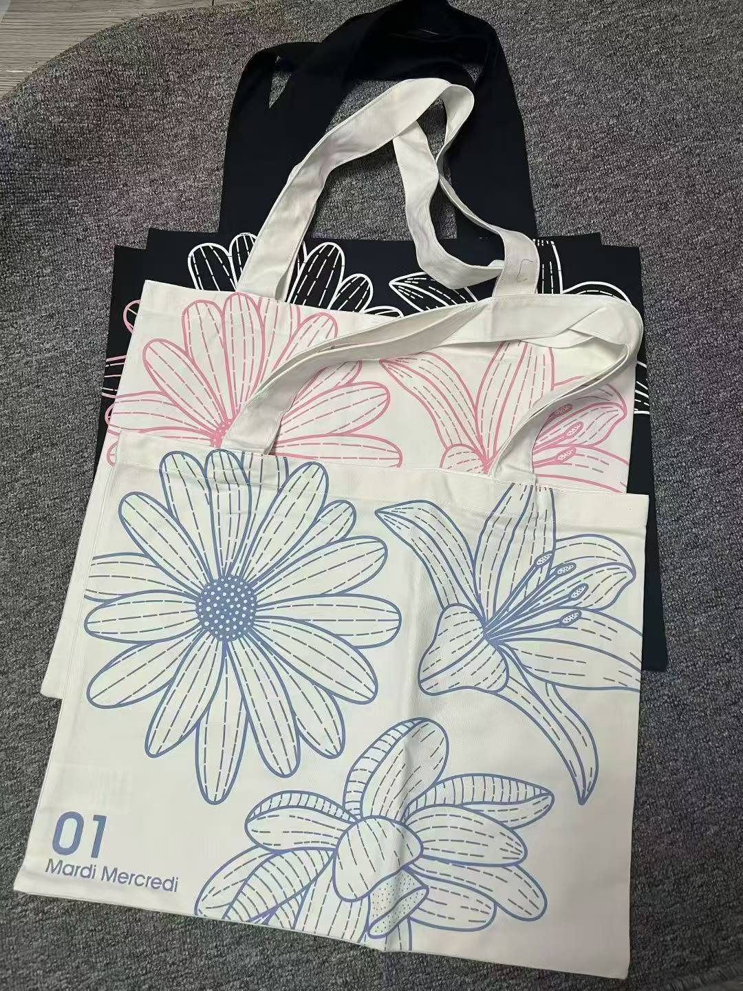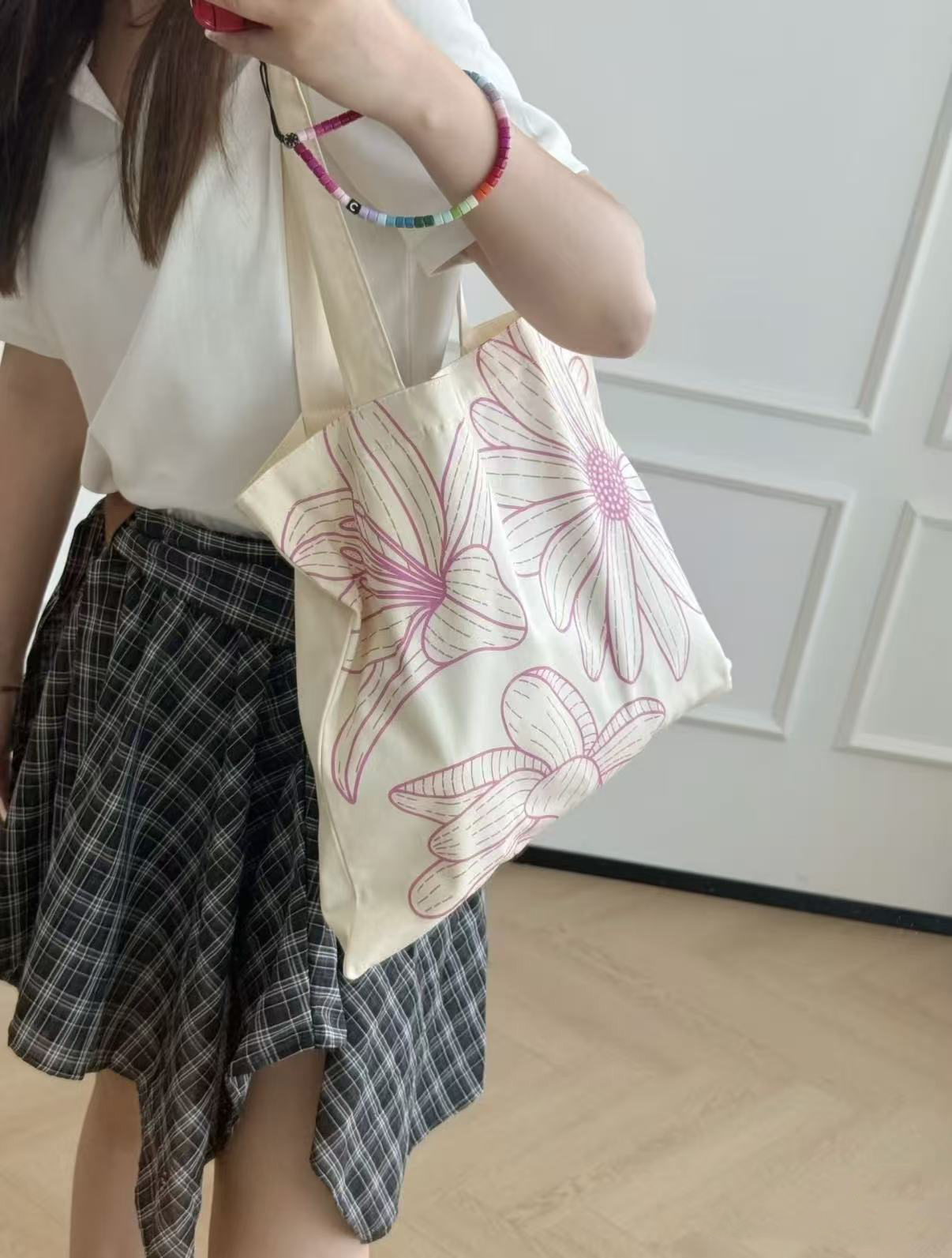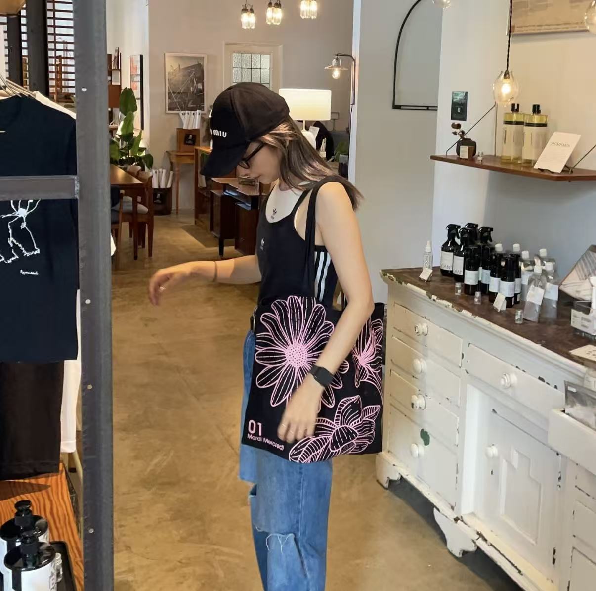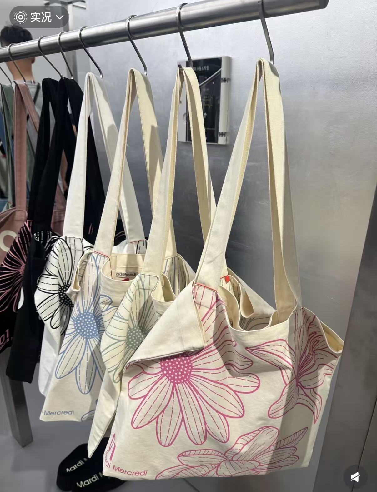 双面印花的帆布包,一面是标志性的雏菊图案,一面是撞色字母