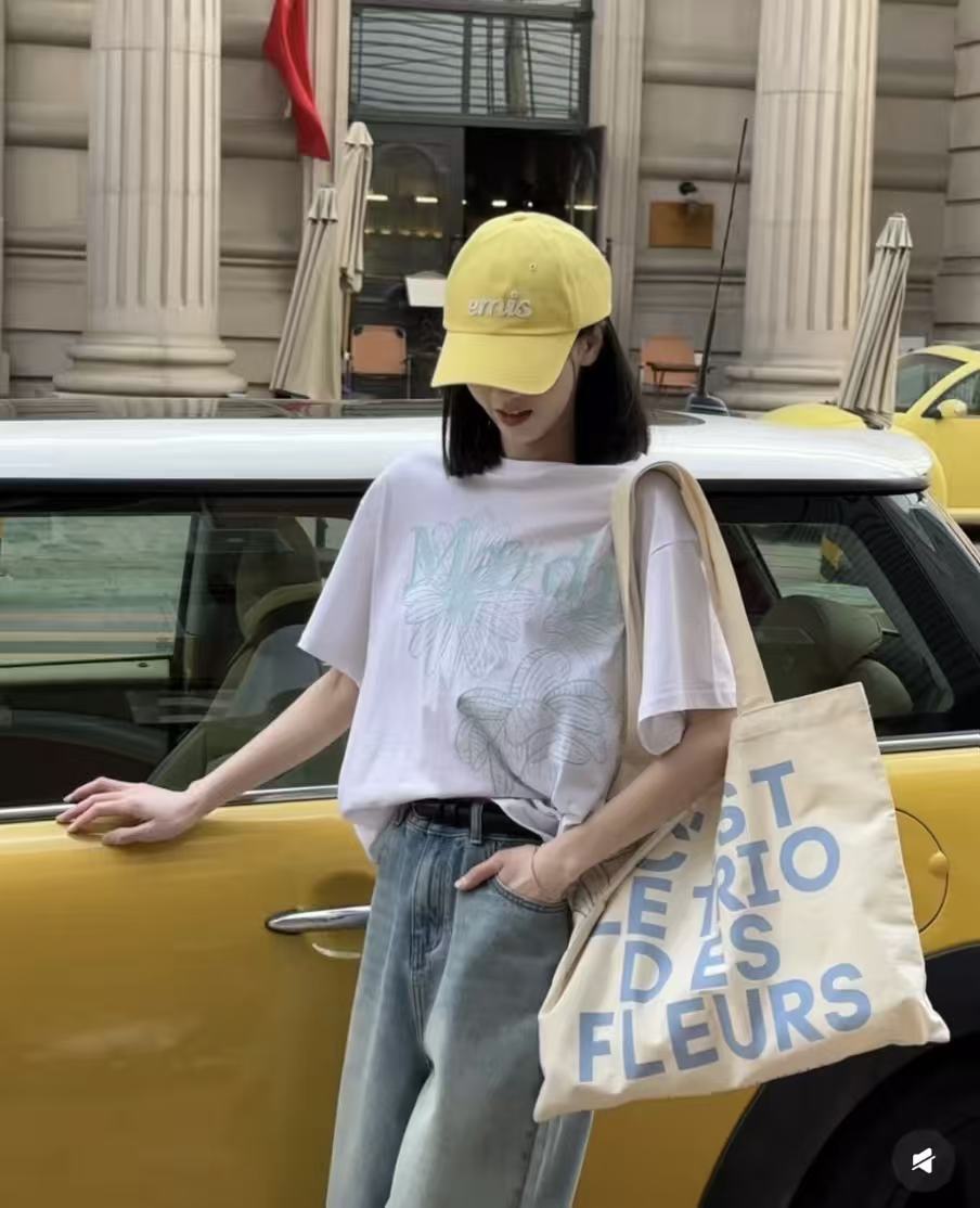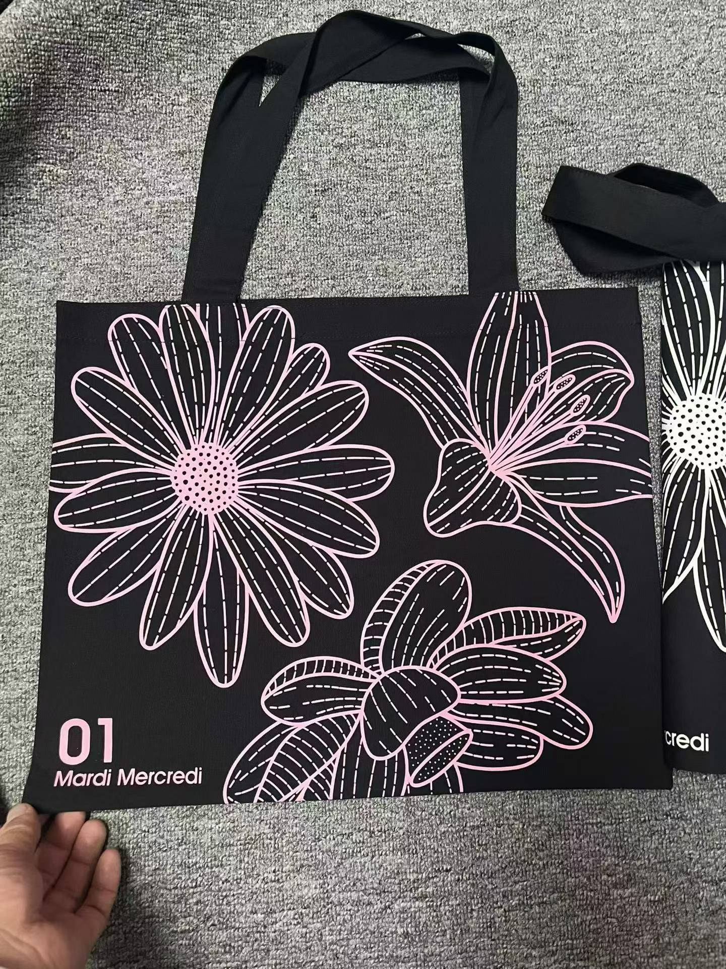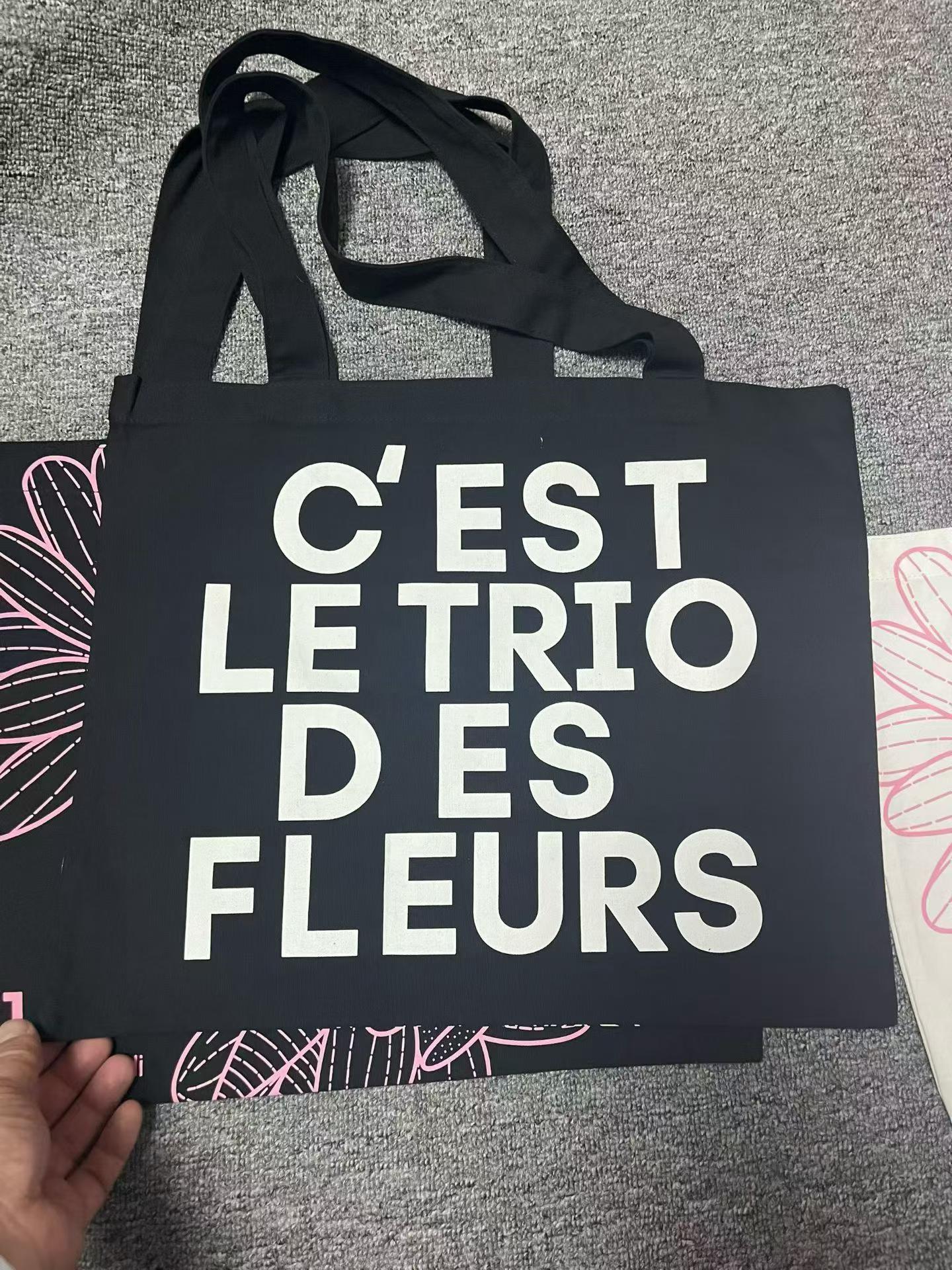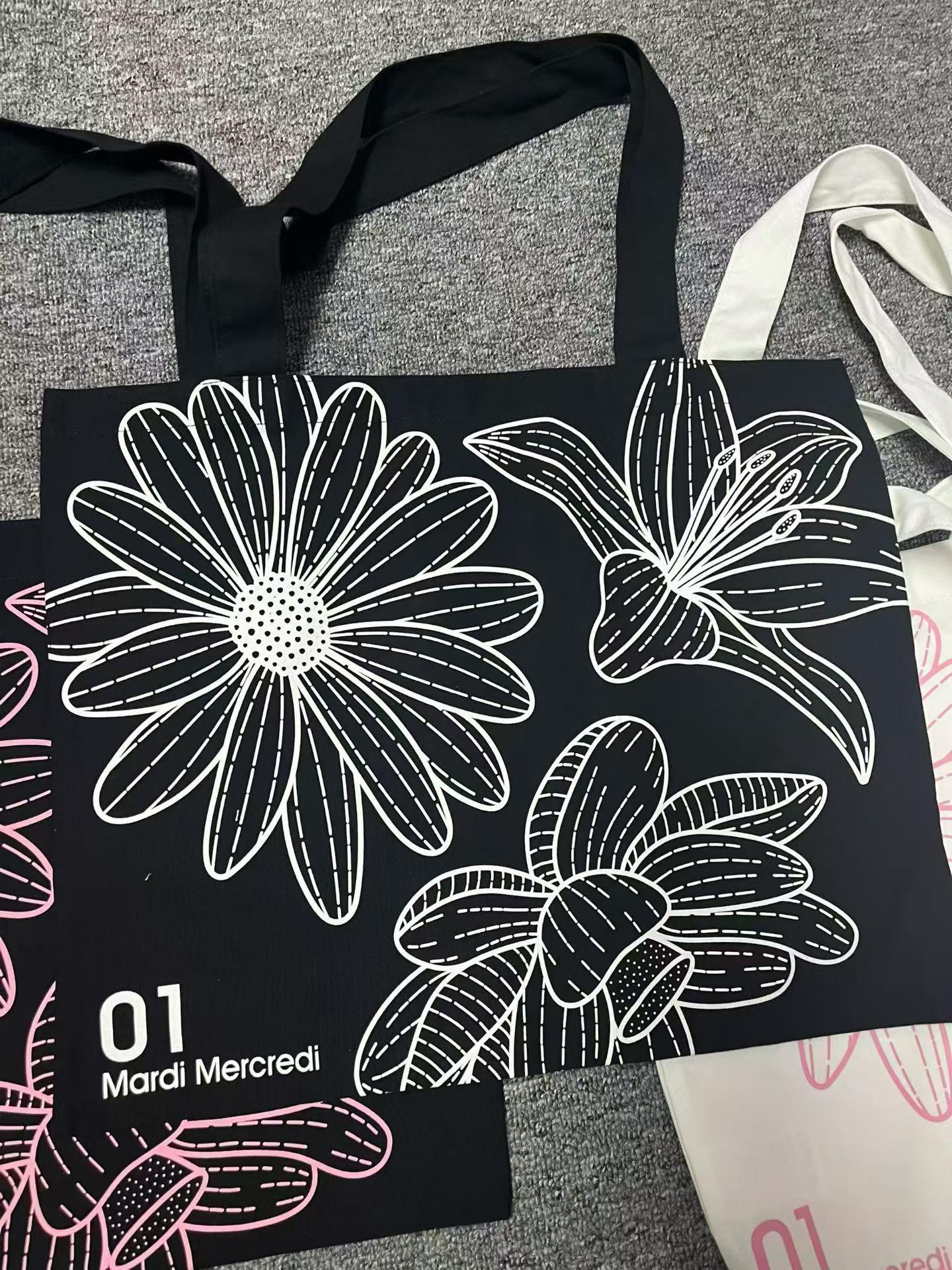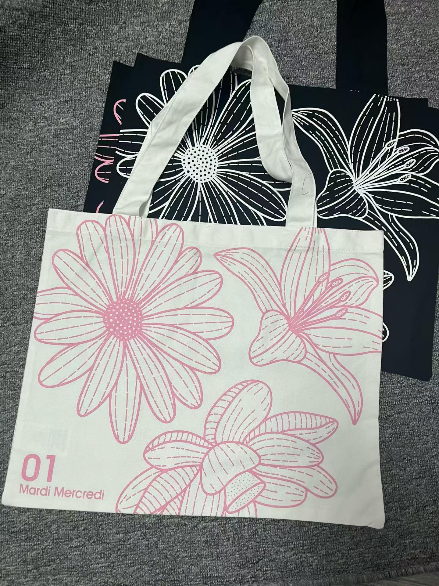双面印花的帆布包,一面是标志性的雏菊图案,一面是撞色字母
