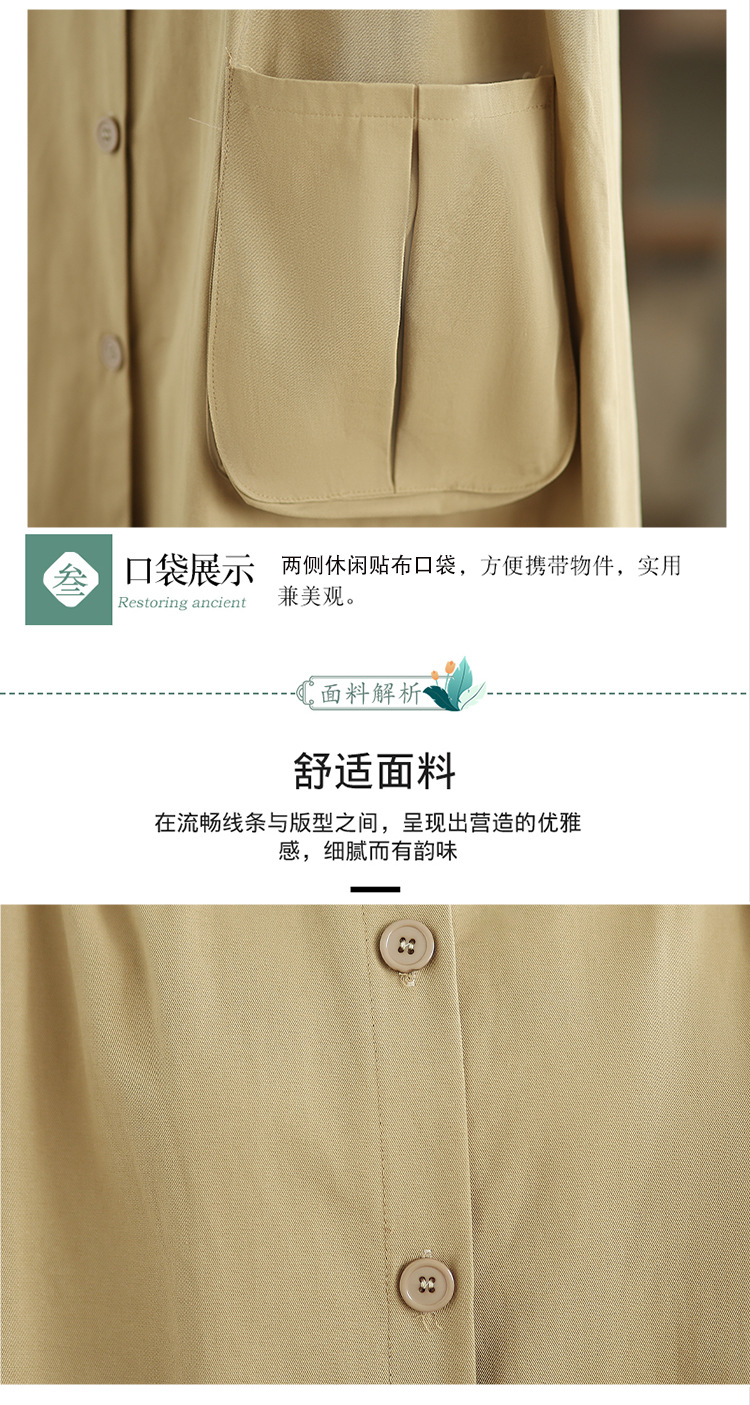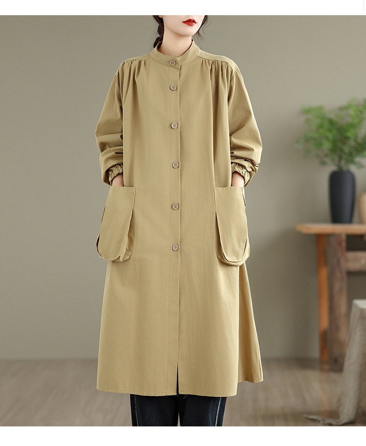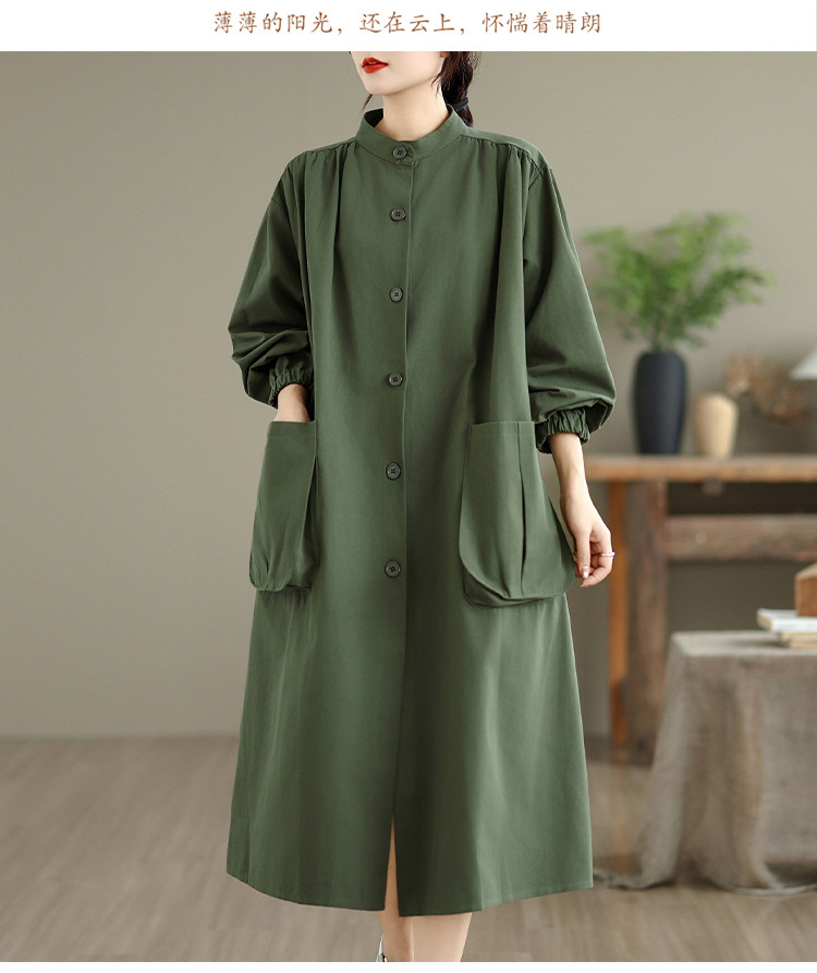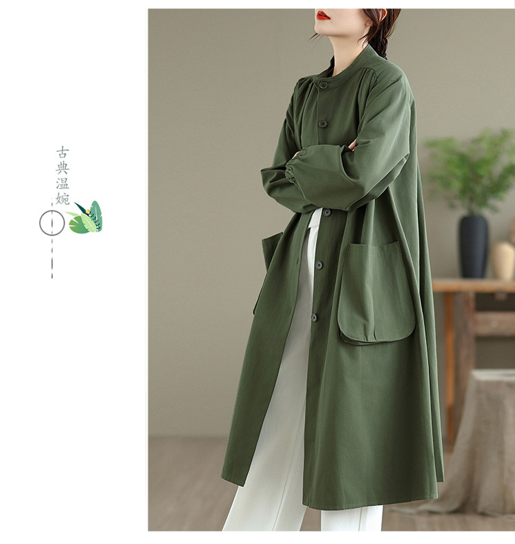 雀说文艺宽松大码女装长袖立领纯色大口袋中长款风衣外套AL999