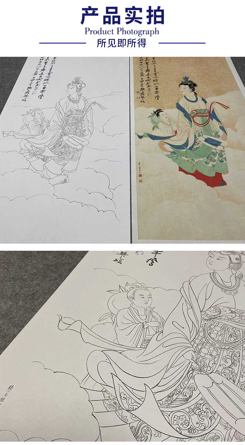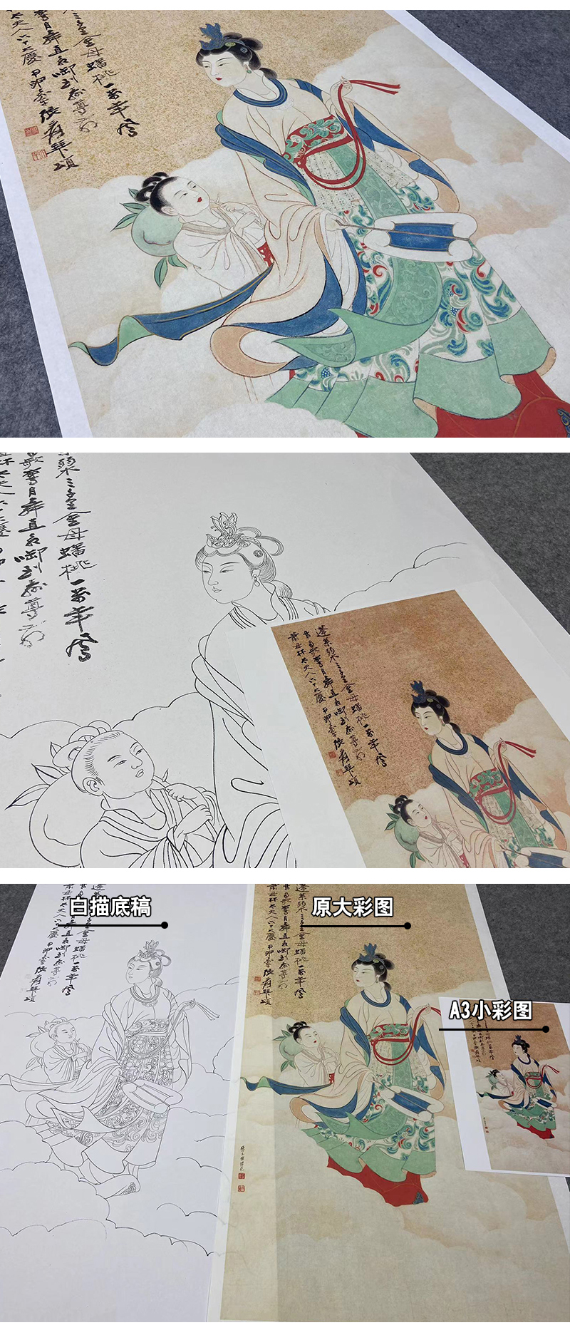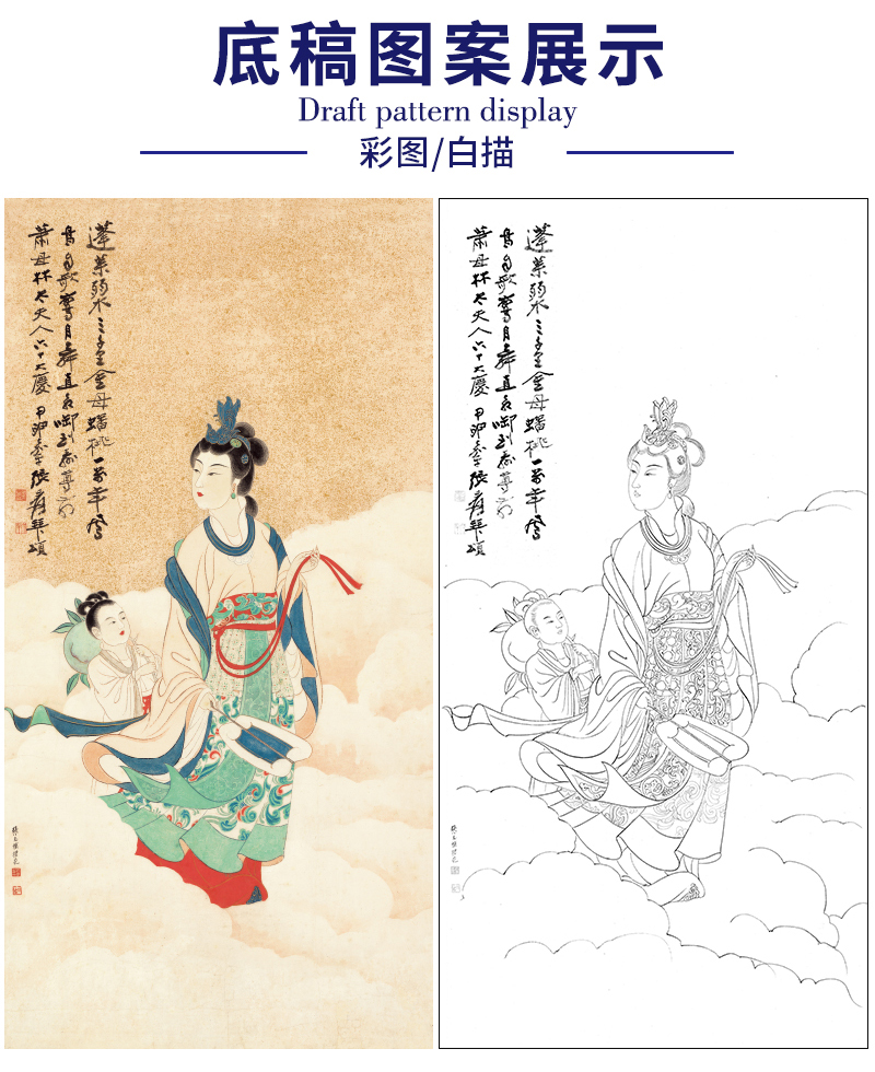 【大彩图】张大千竖幅工笔传统仕女人物白描底稿《蟠桃献寿》临摹勾线高清打印稿QD61