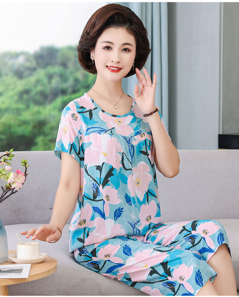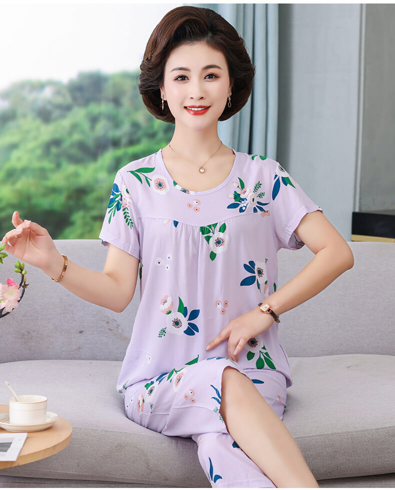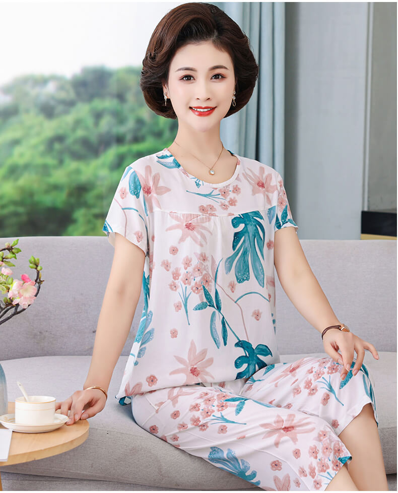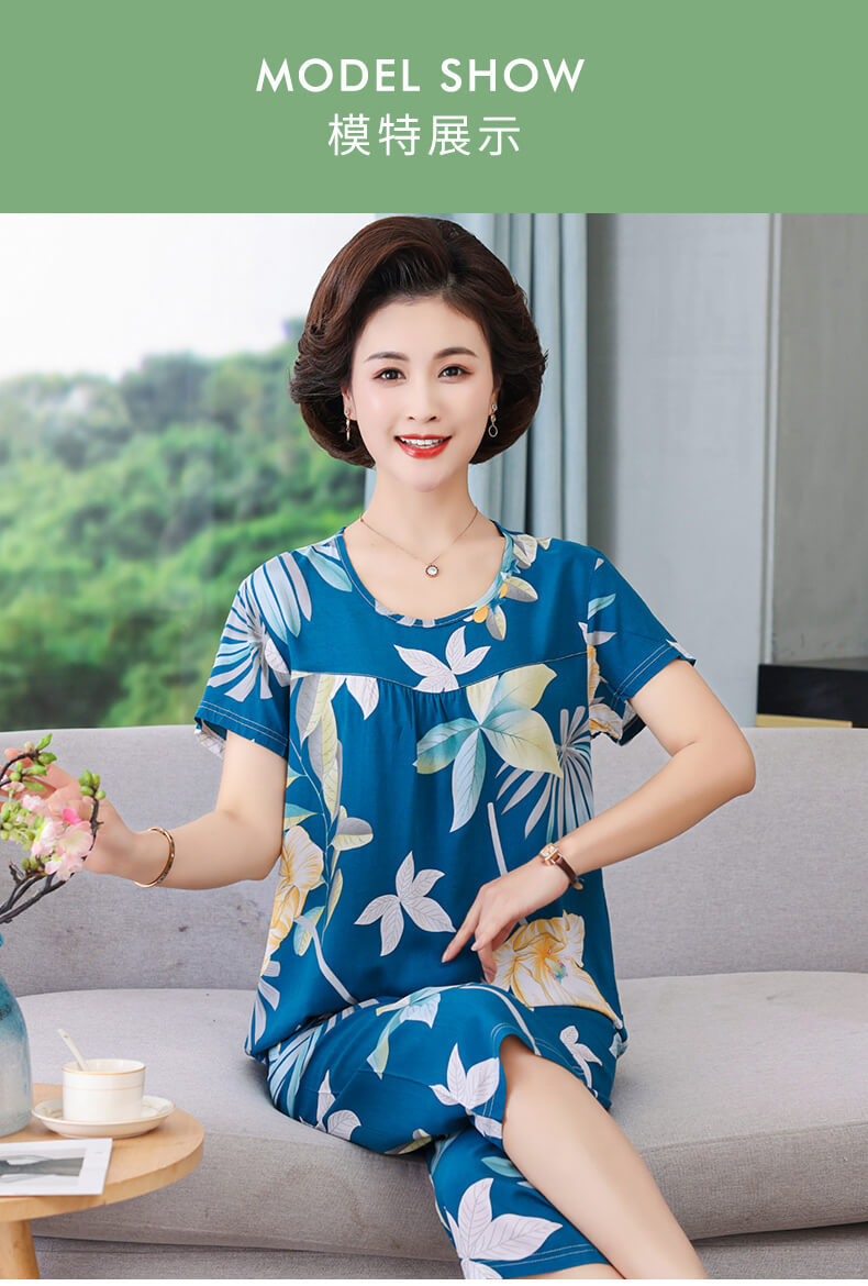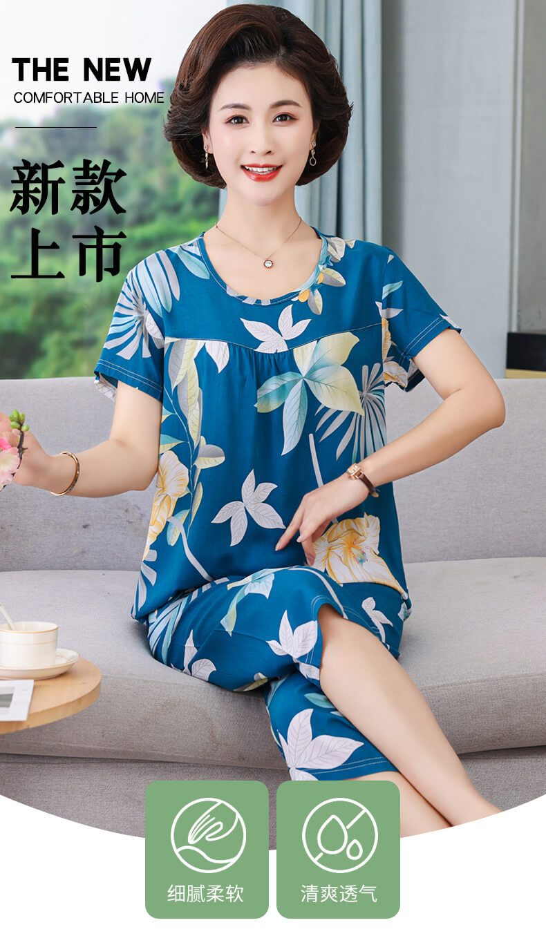 CLX睡衣春秋女款短袖套装棉绸家居服女休闲大码夏天