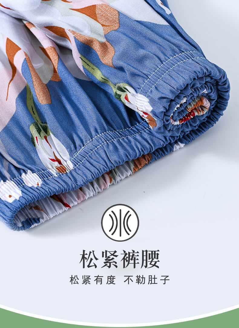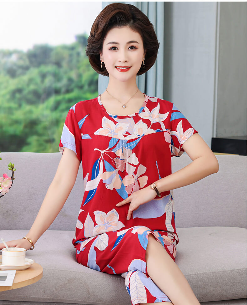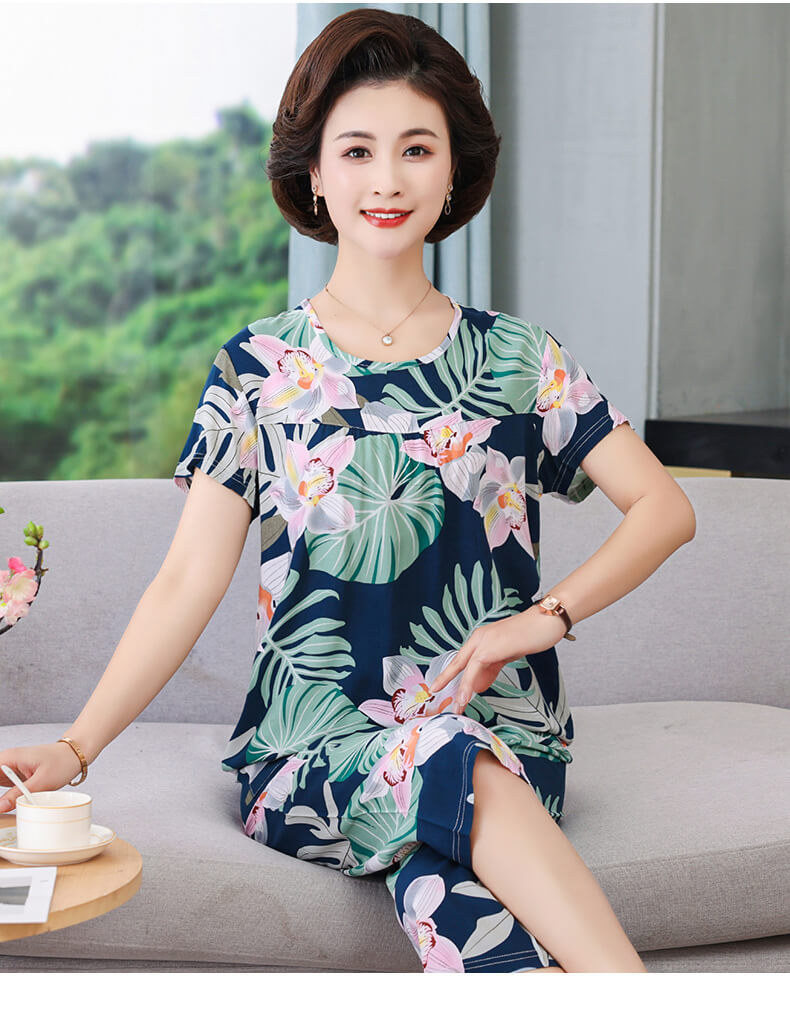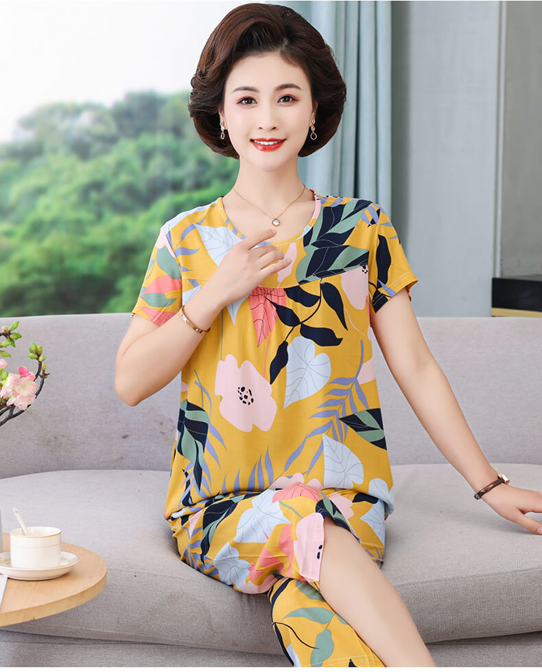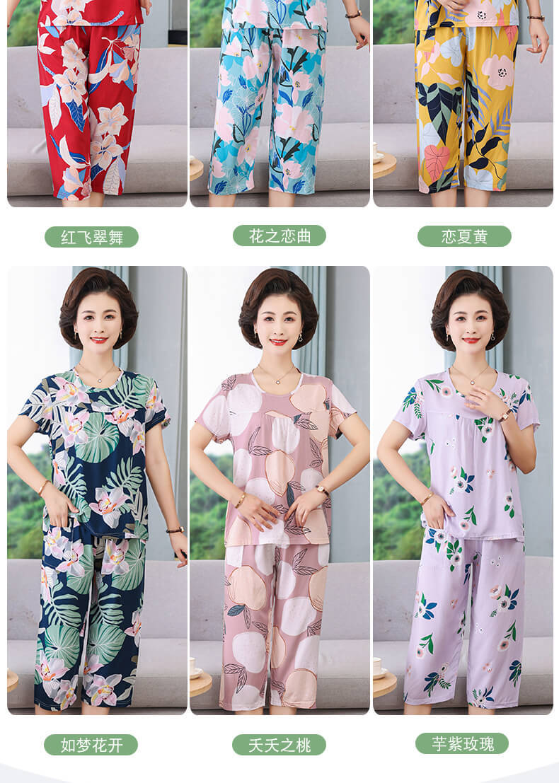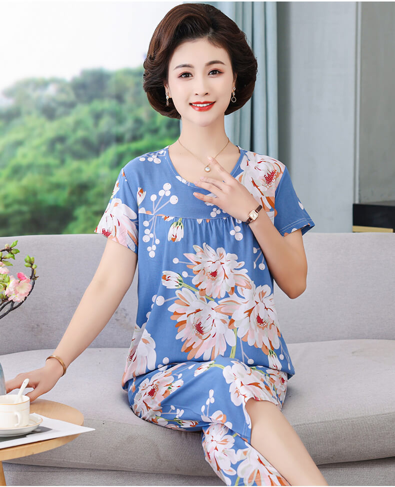CLX睡衣春秋女款短袖套装棉绸家居服女休闲大码夏天