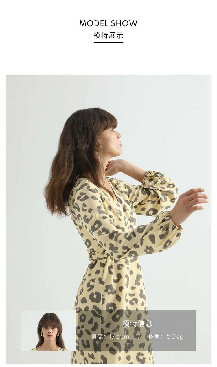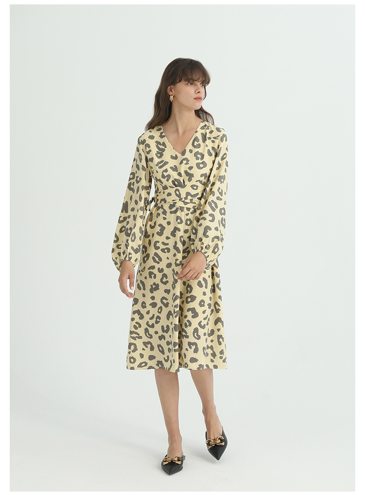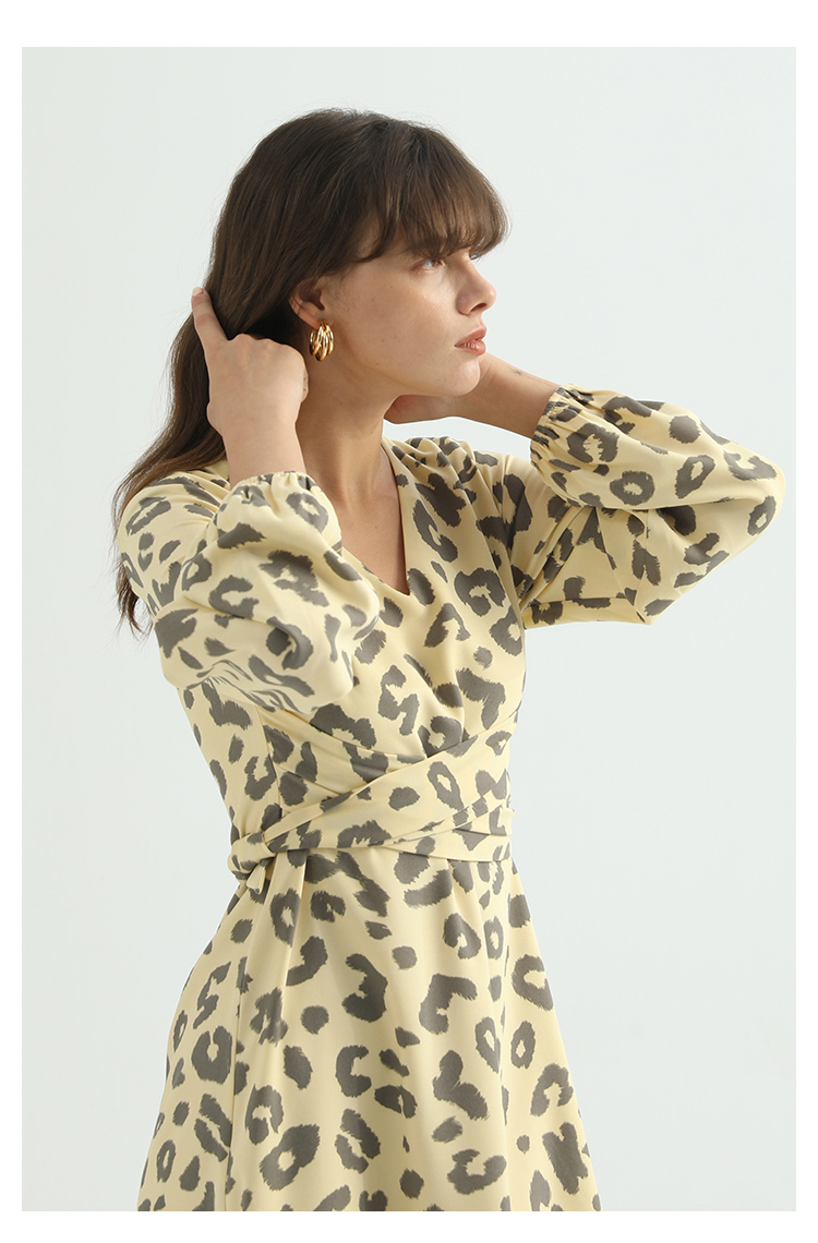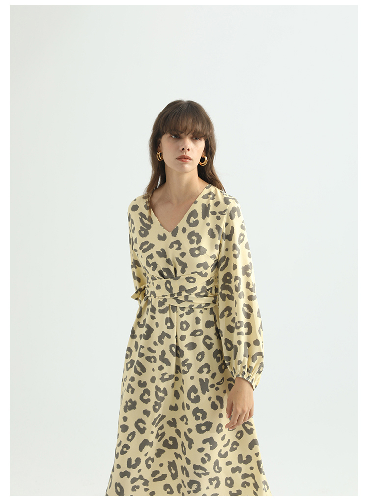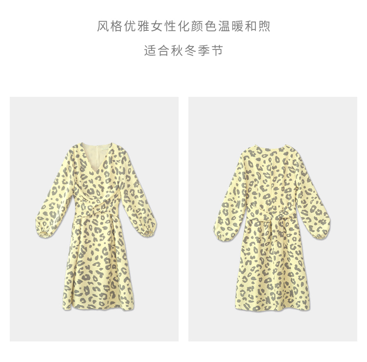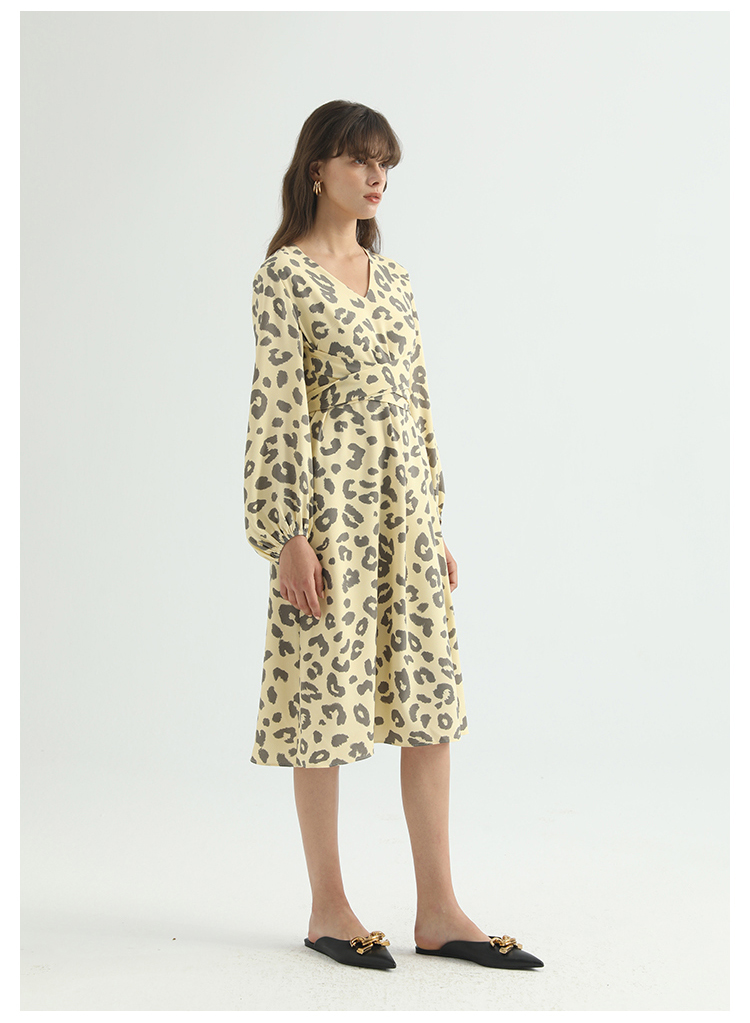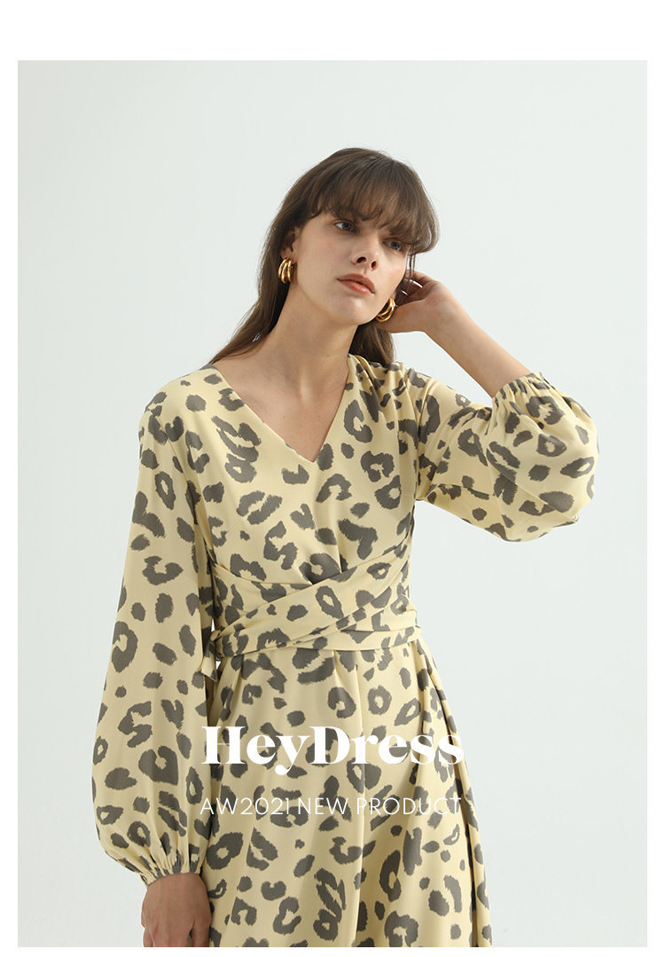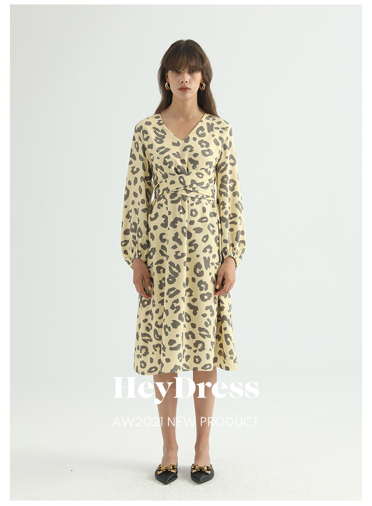 HeyDress豹纹V领连衣裙女收腰显瘦气质中长裙复古灯笼袖裙子