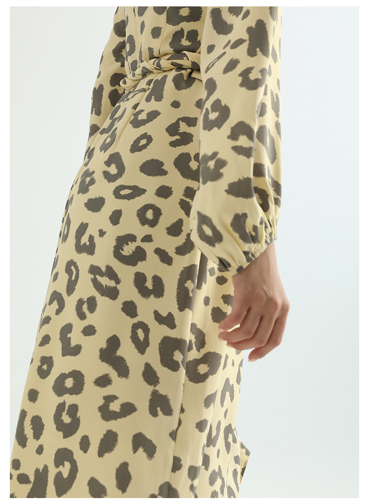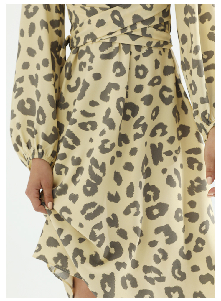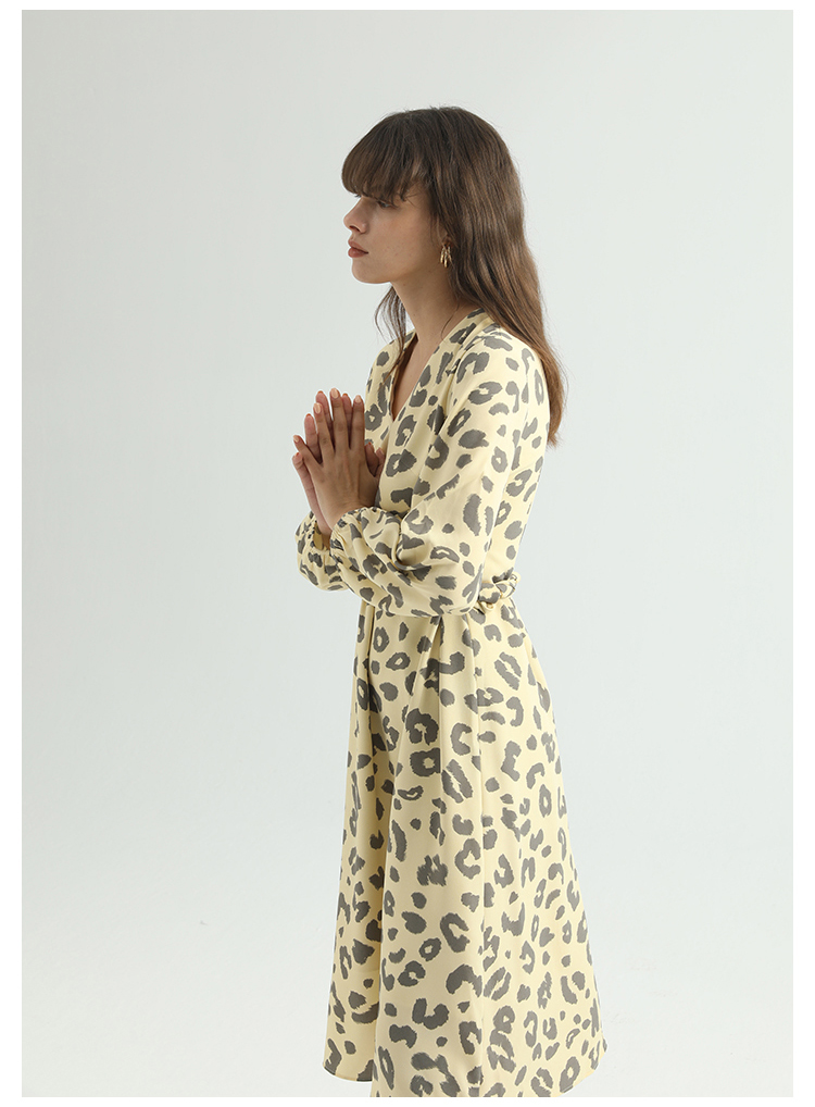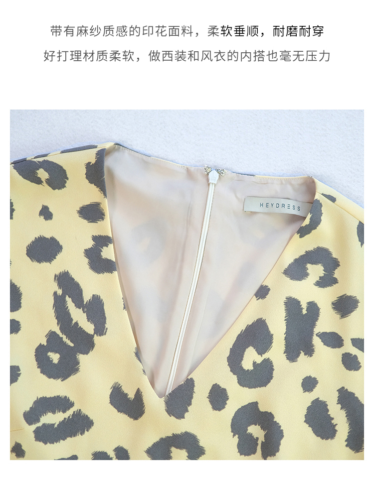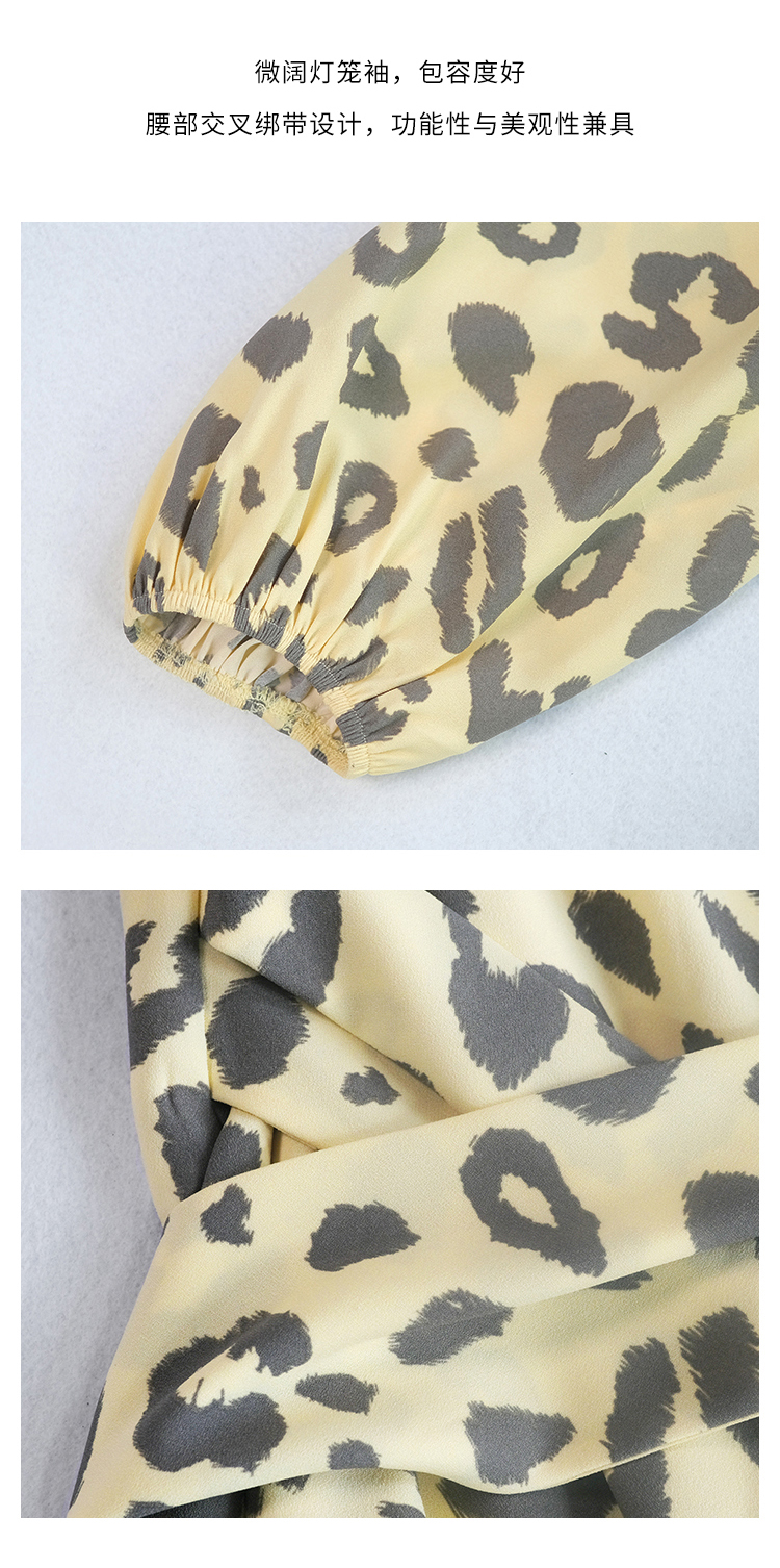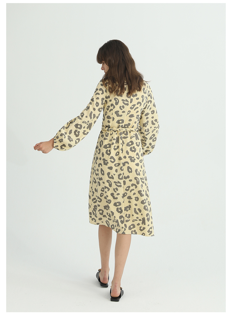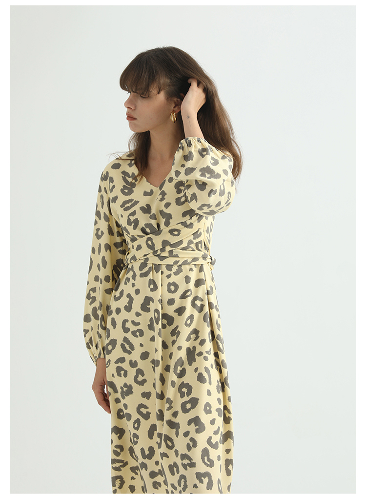 HeyDress豹纹V领连衣裙女收腰显瘦气质中长裙复古灯笼袖裙子
