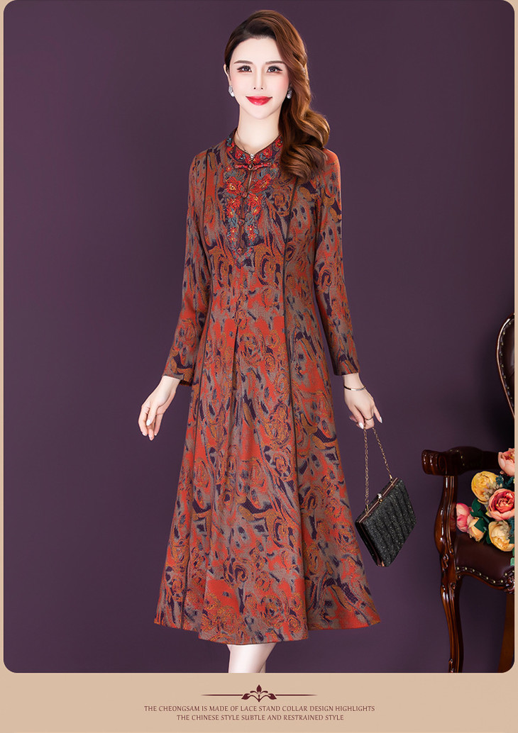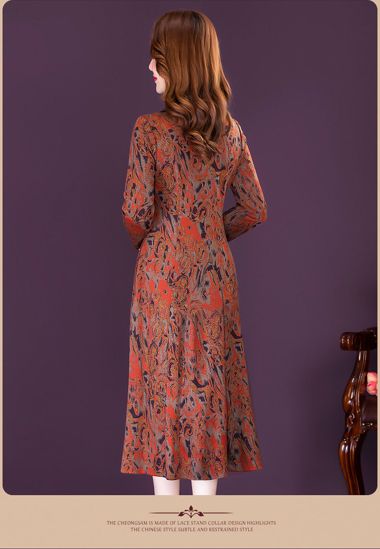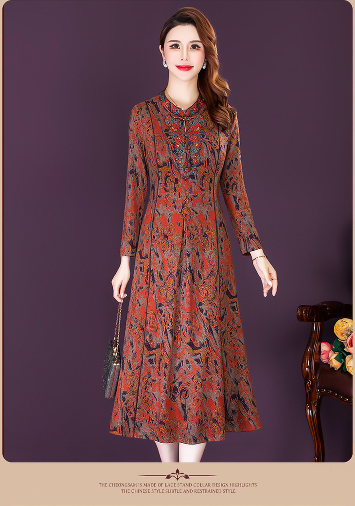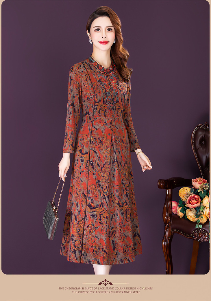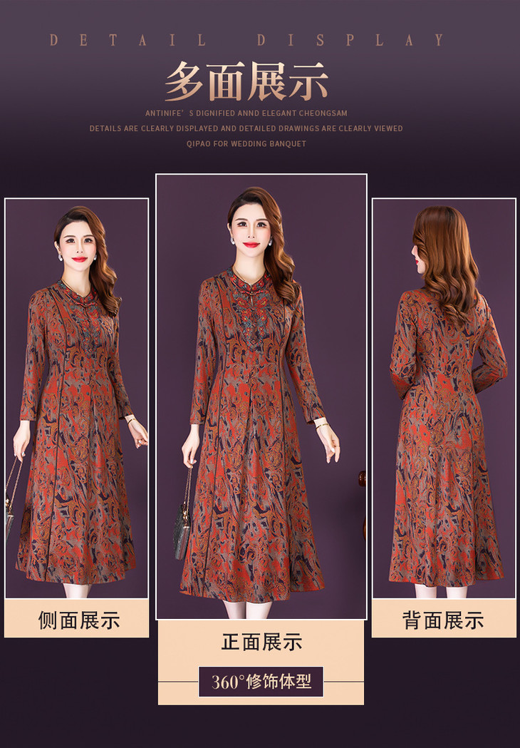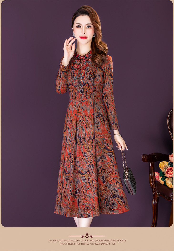 AHM-fyg8647新款复古优雅气质修身立领长袖中长款印花连衣裙