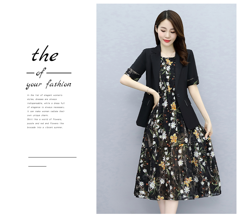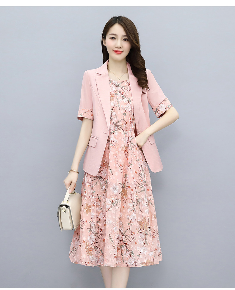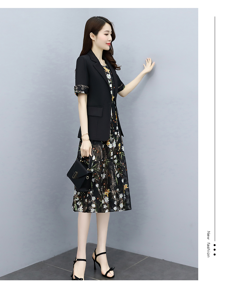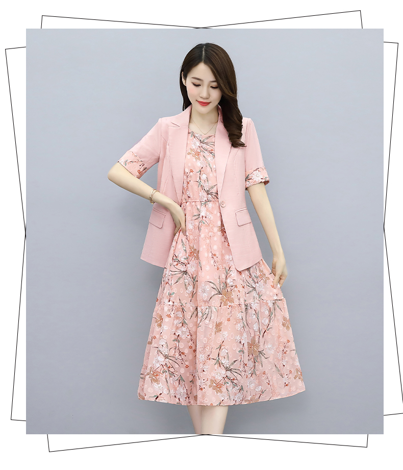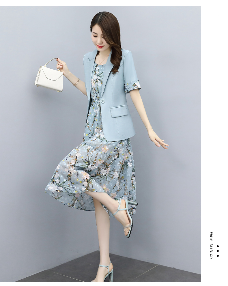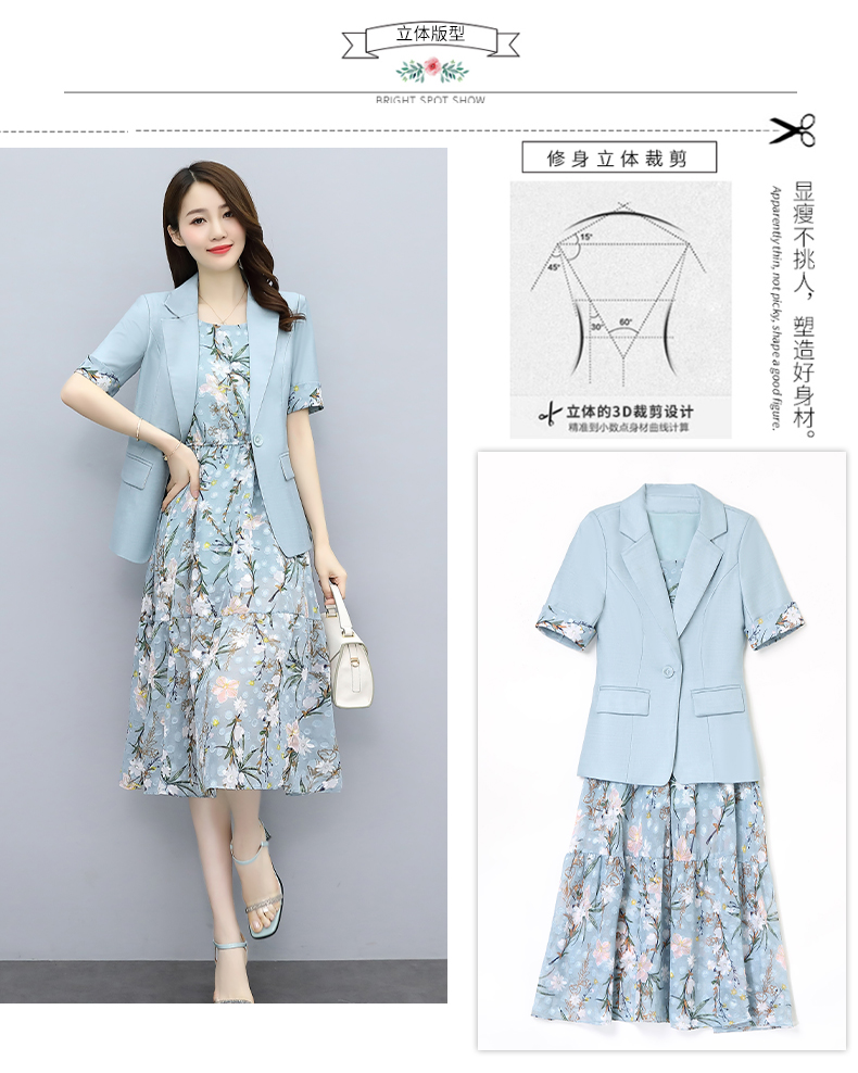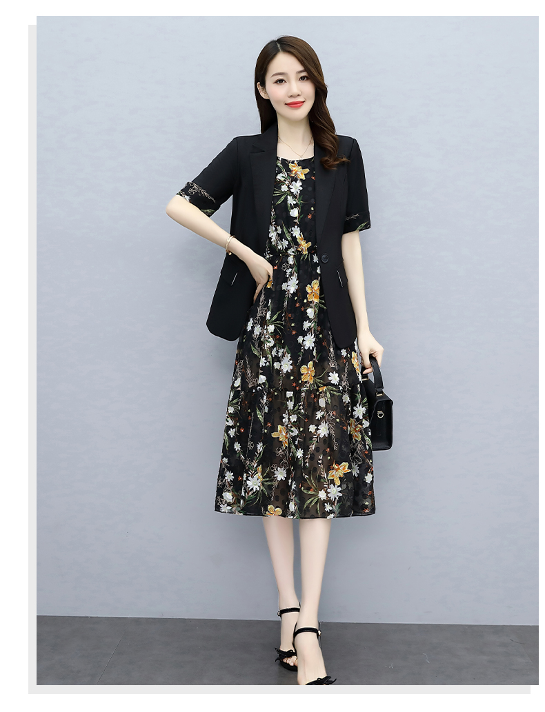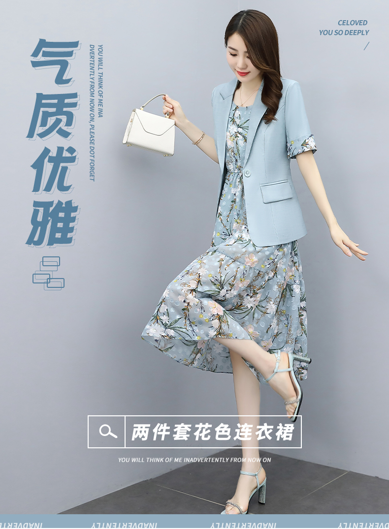 简约时尚,休闲西装外套+圆领花色连衣裙两件套HRYZ7296