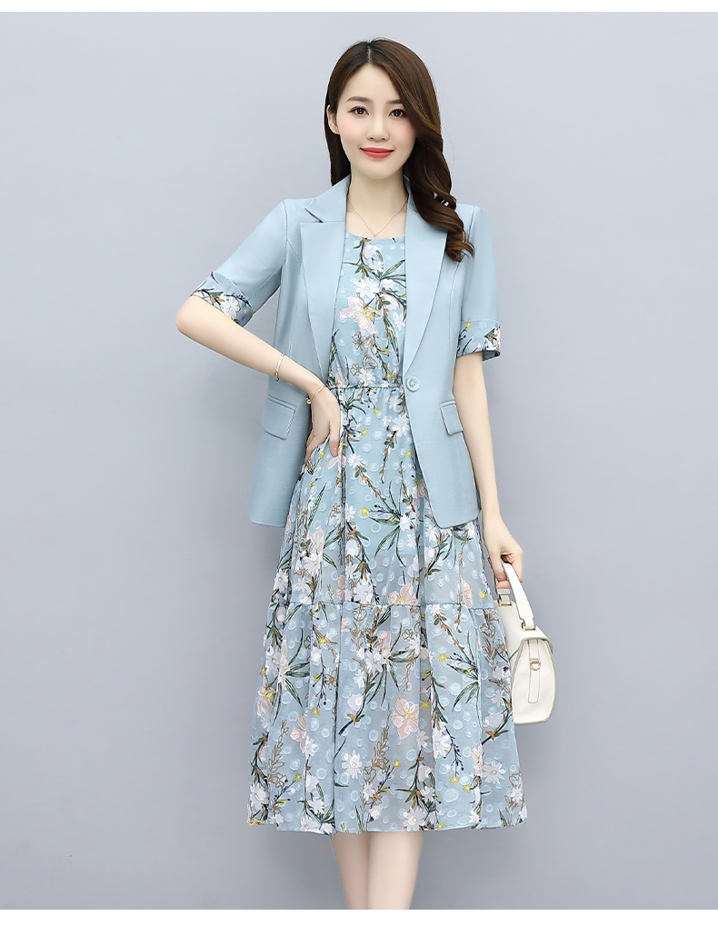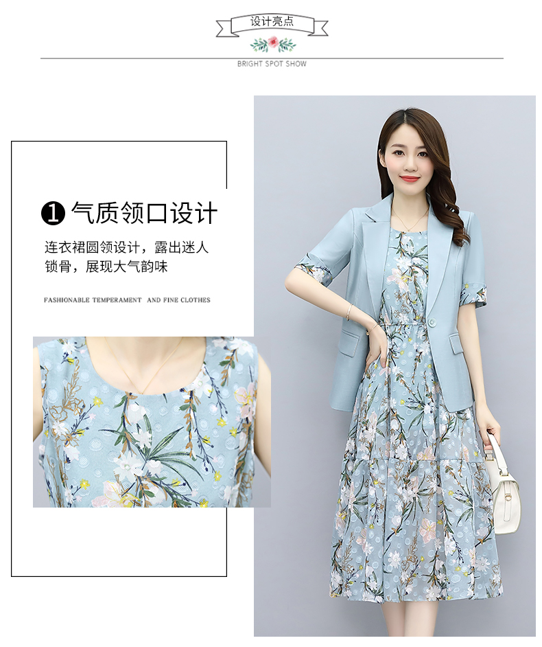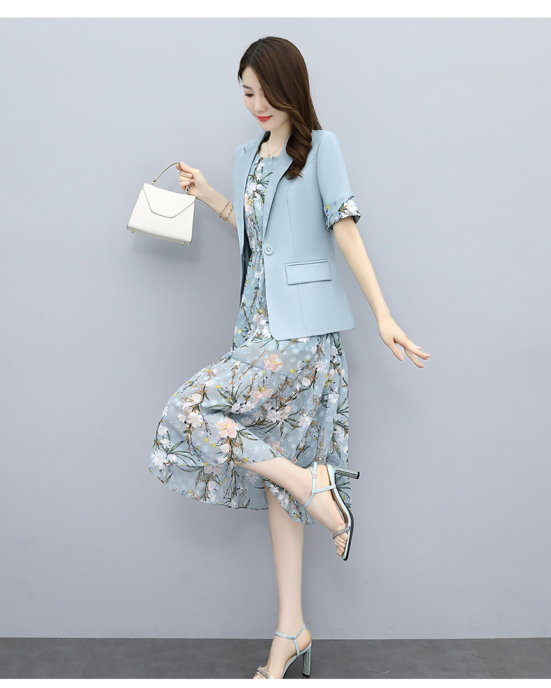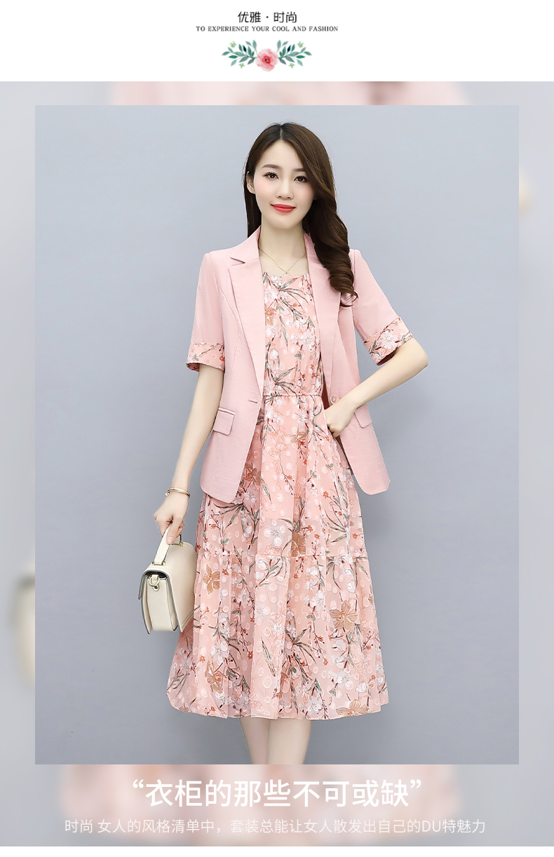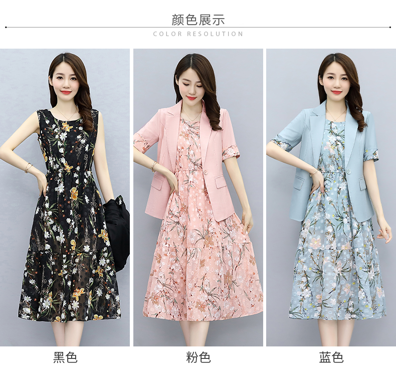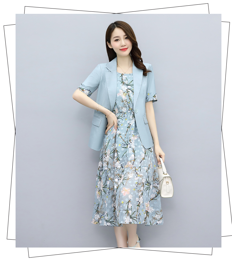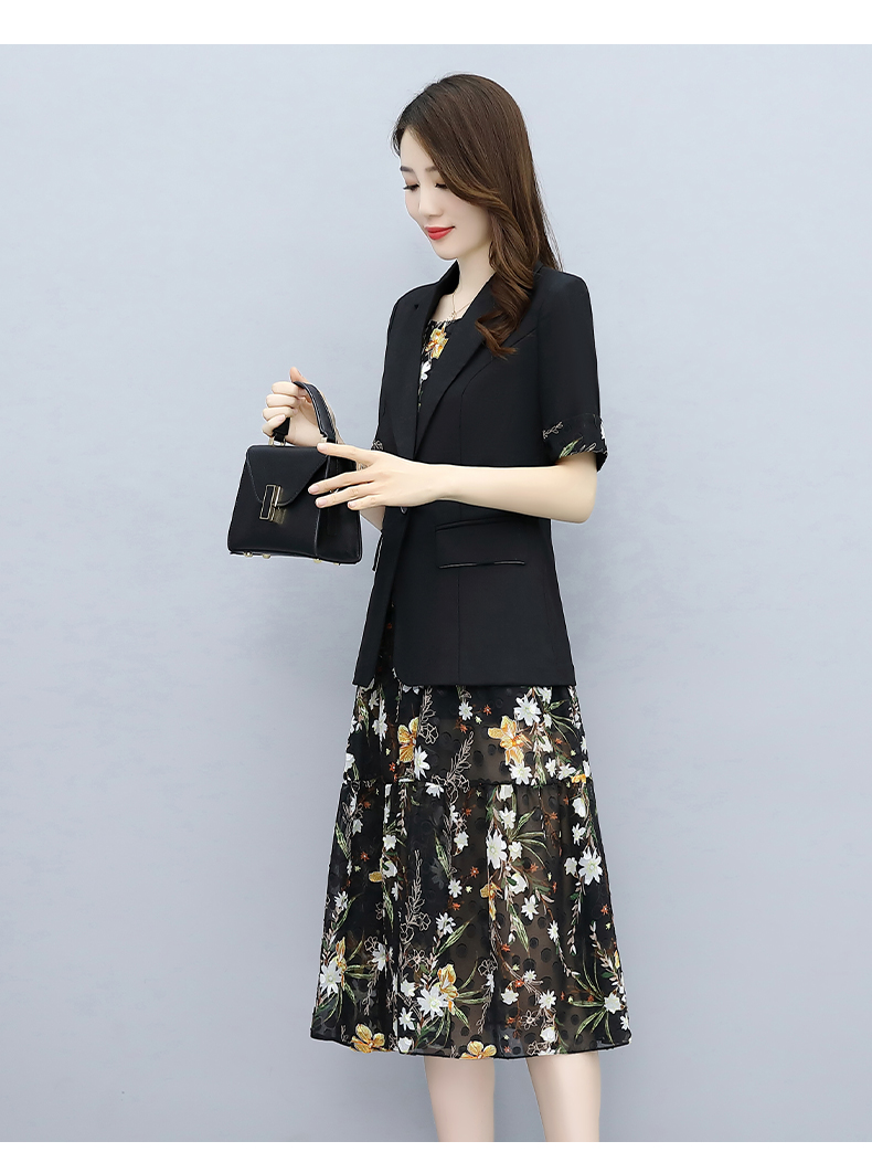 简约时尚,休闲西装外套+圆领花色连衣裙两件套HRYZ7296