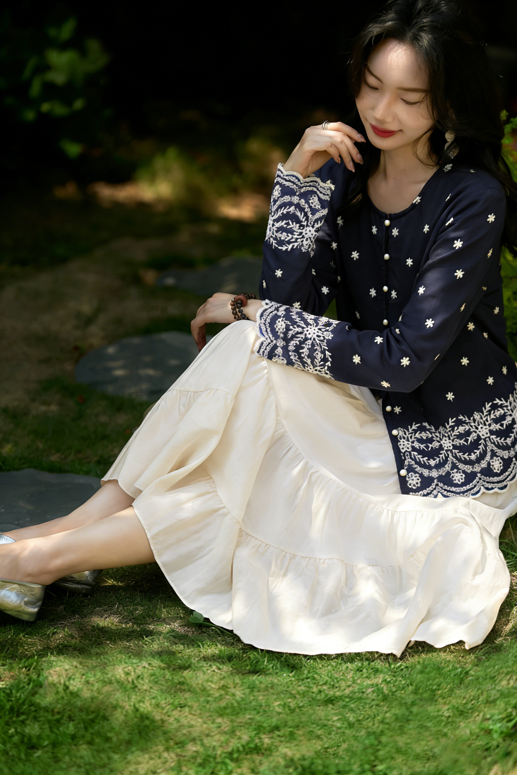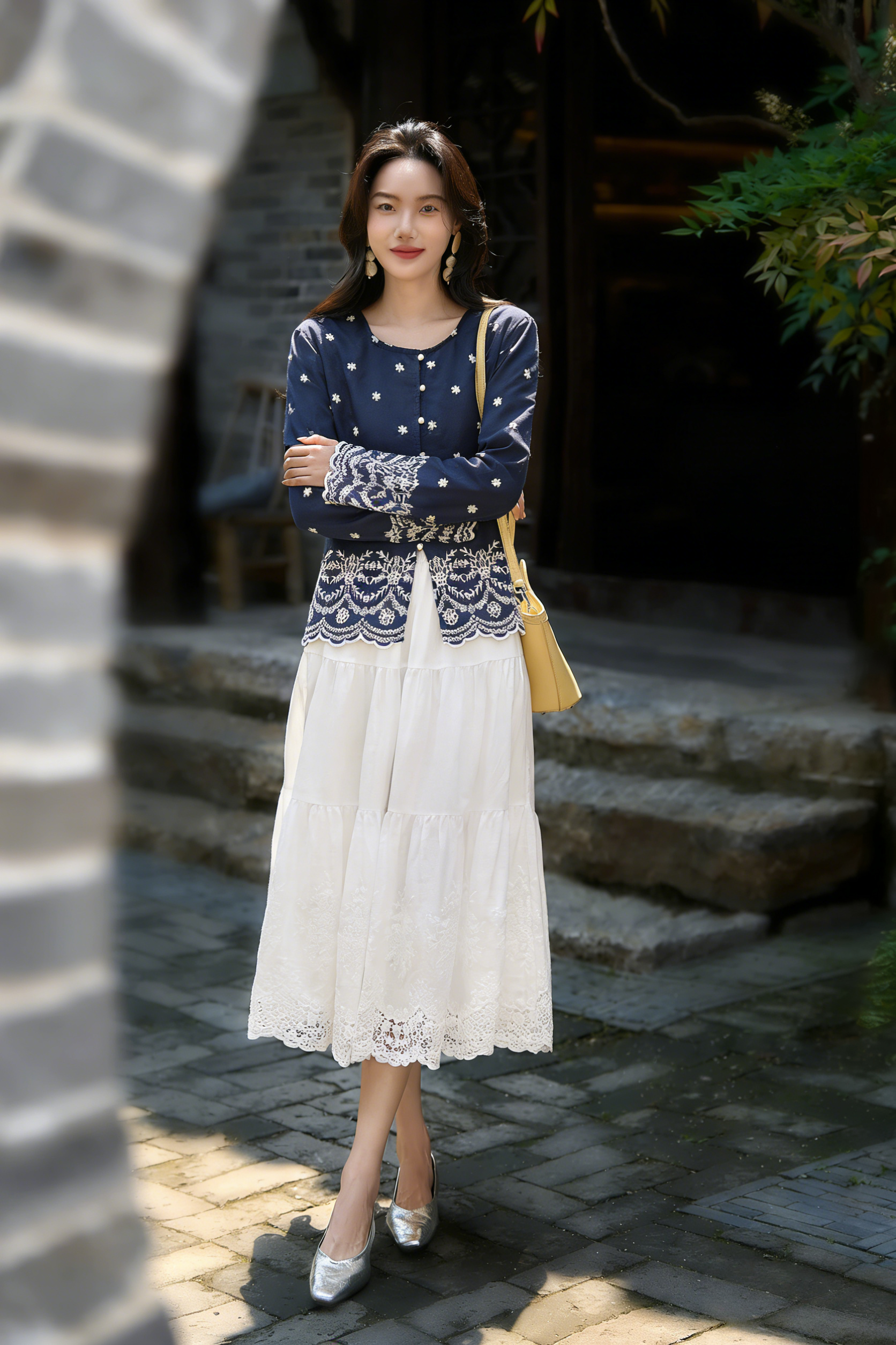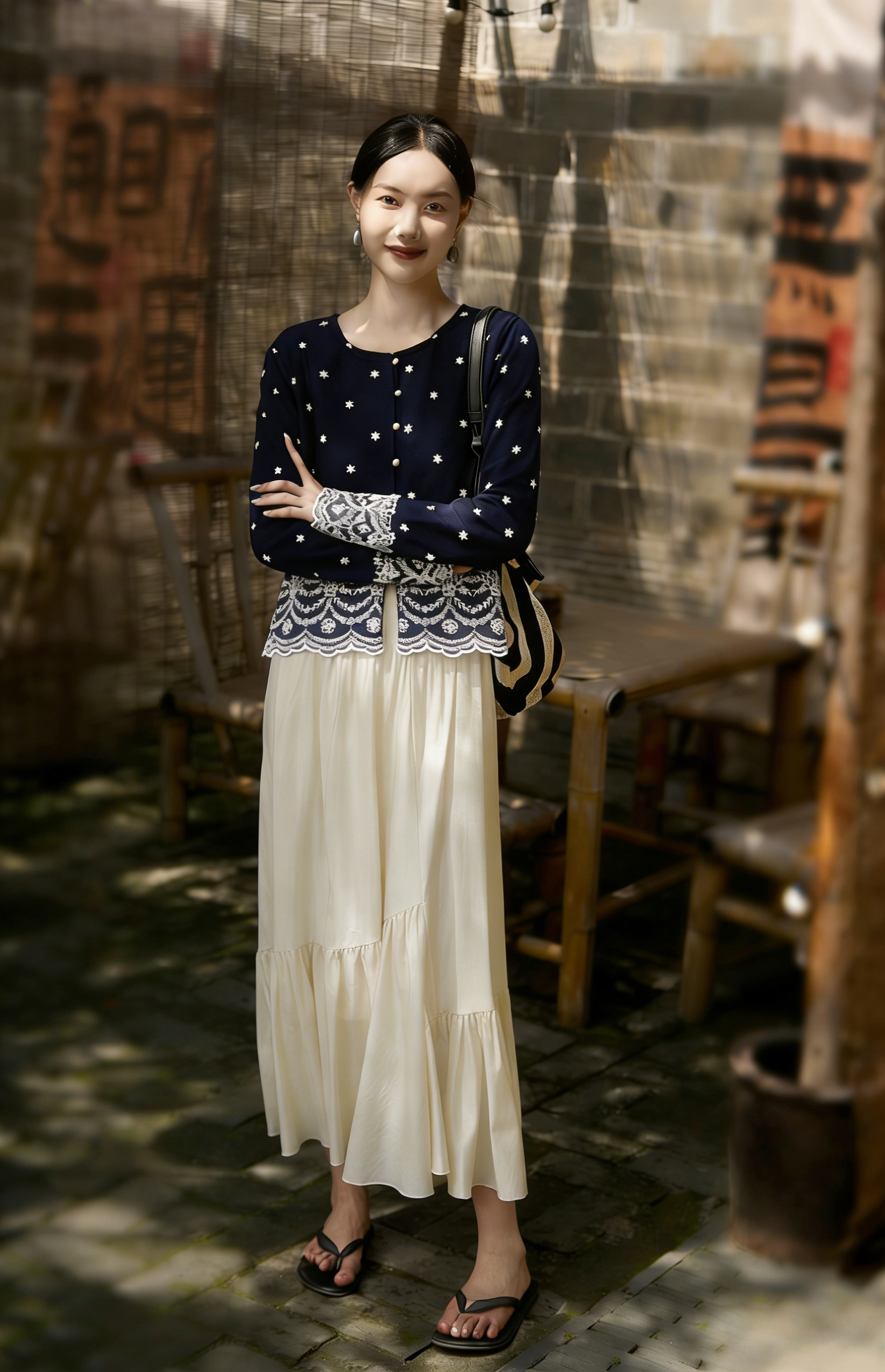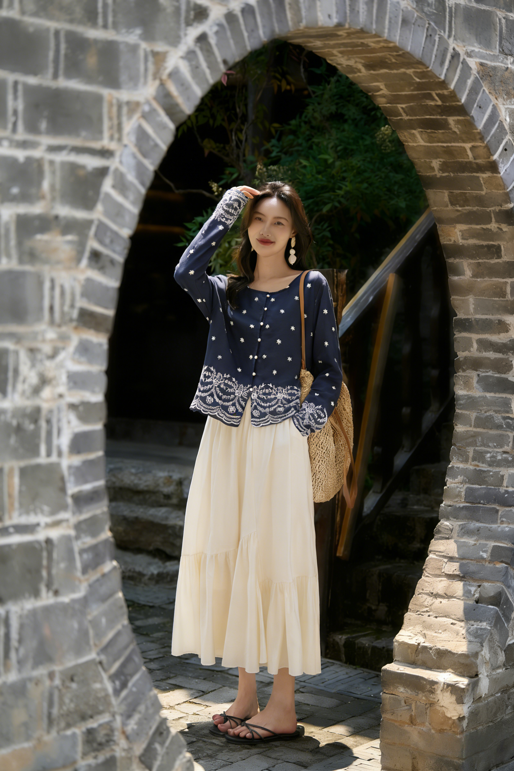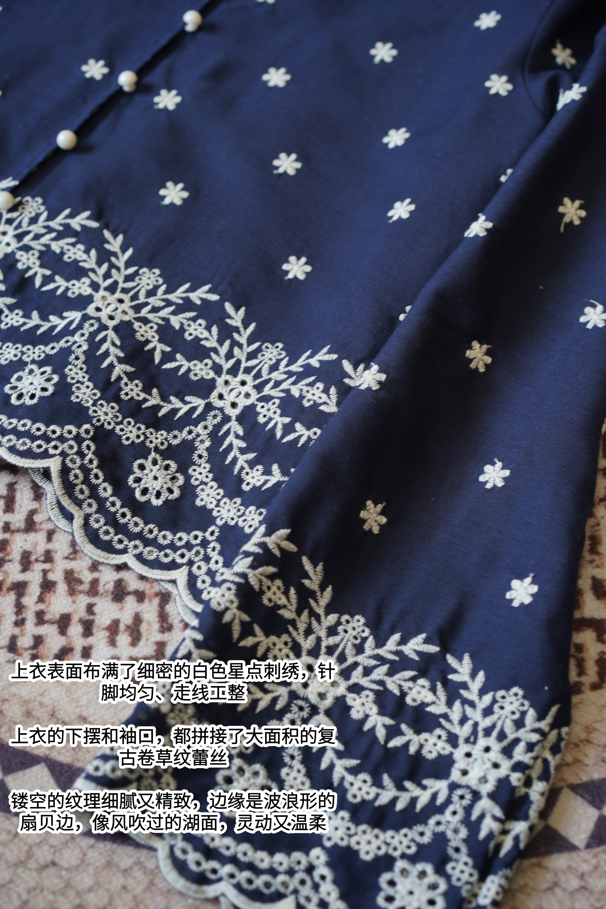 下单3-7天发货!LONGNVFAIR 藏青色撞白满天星刺绣花边上衣/奶油色花瓣半裙套装 一眼沦陷的东方雅致 梨形身材遮肉显瘦 温柔清冷国风穿搭
