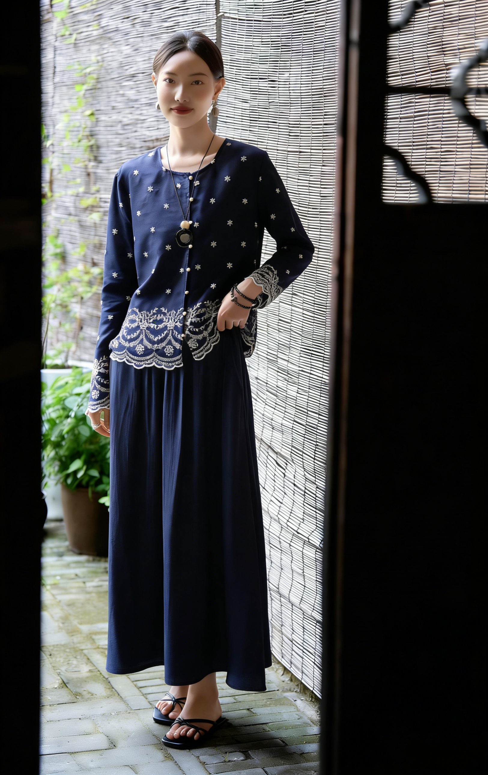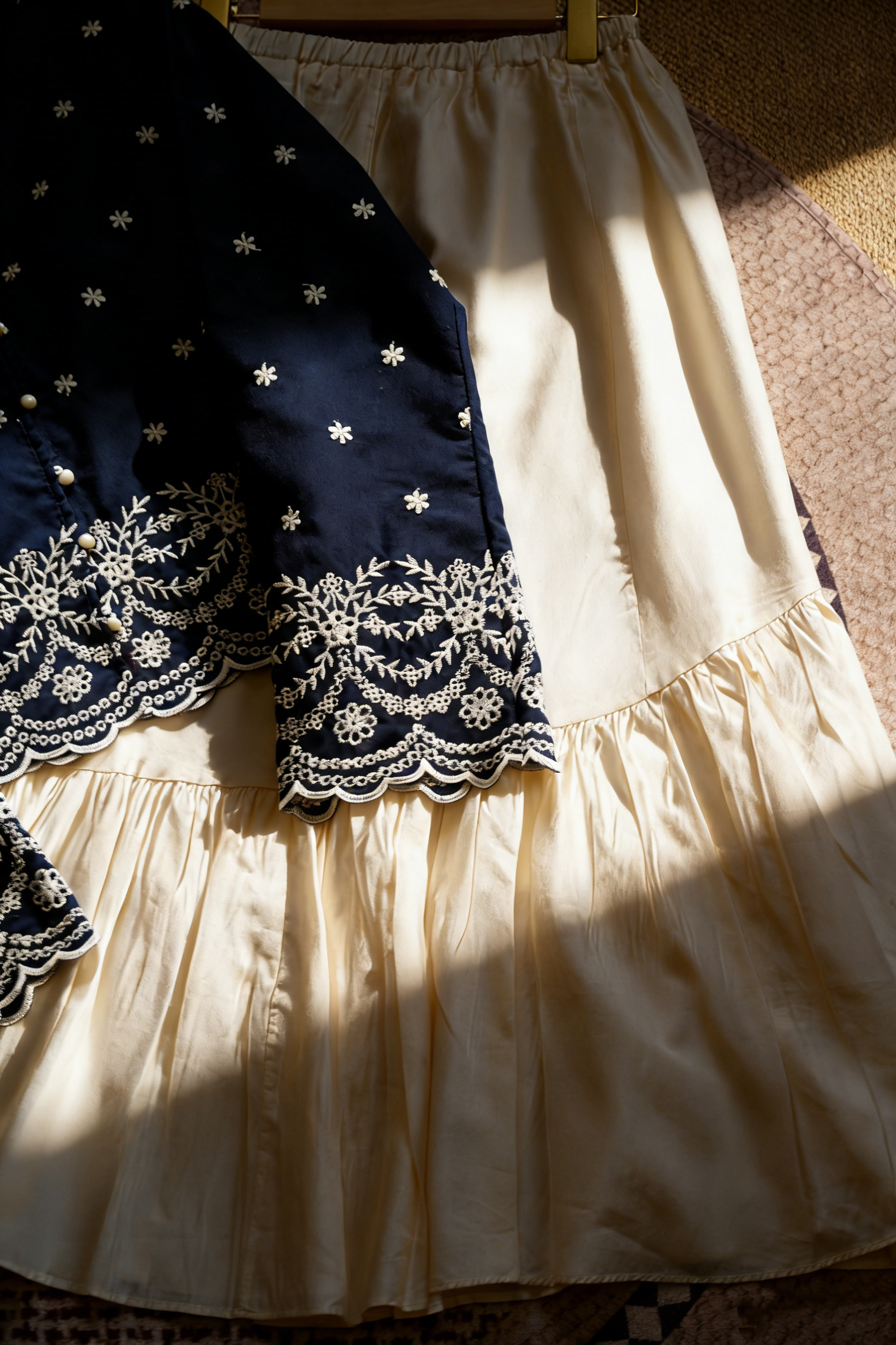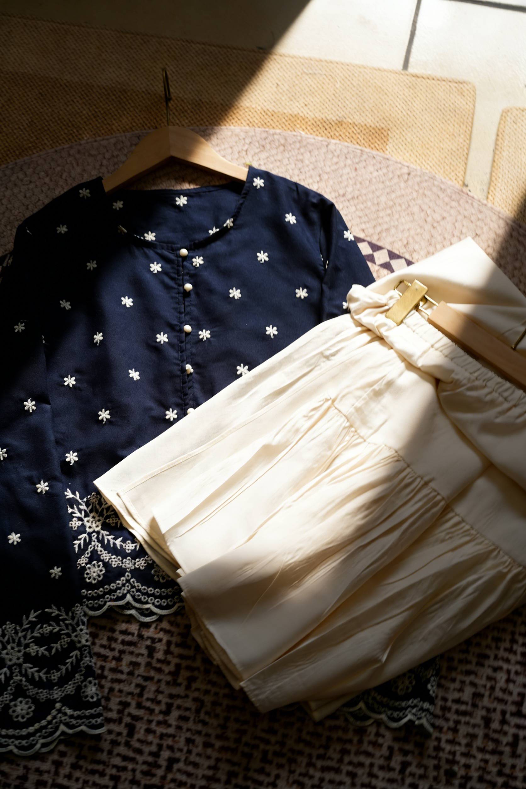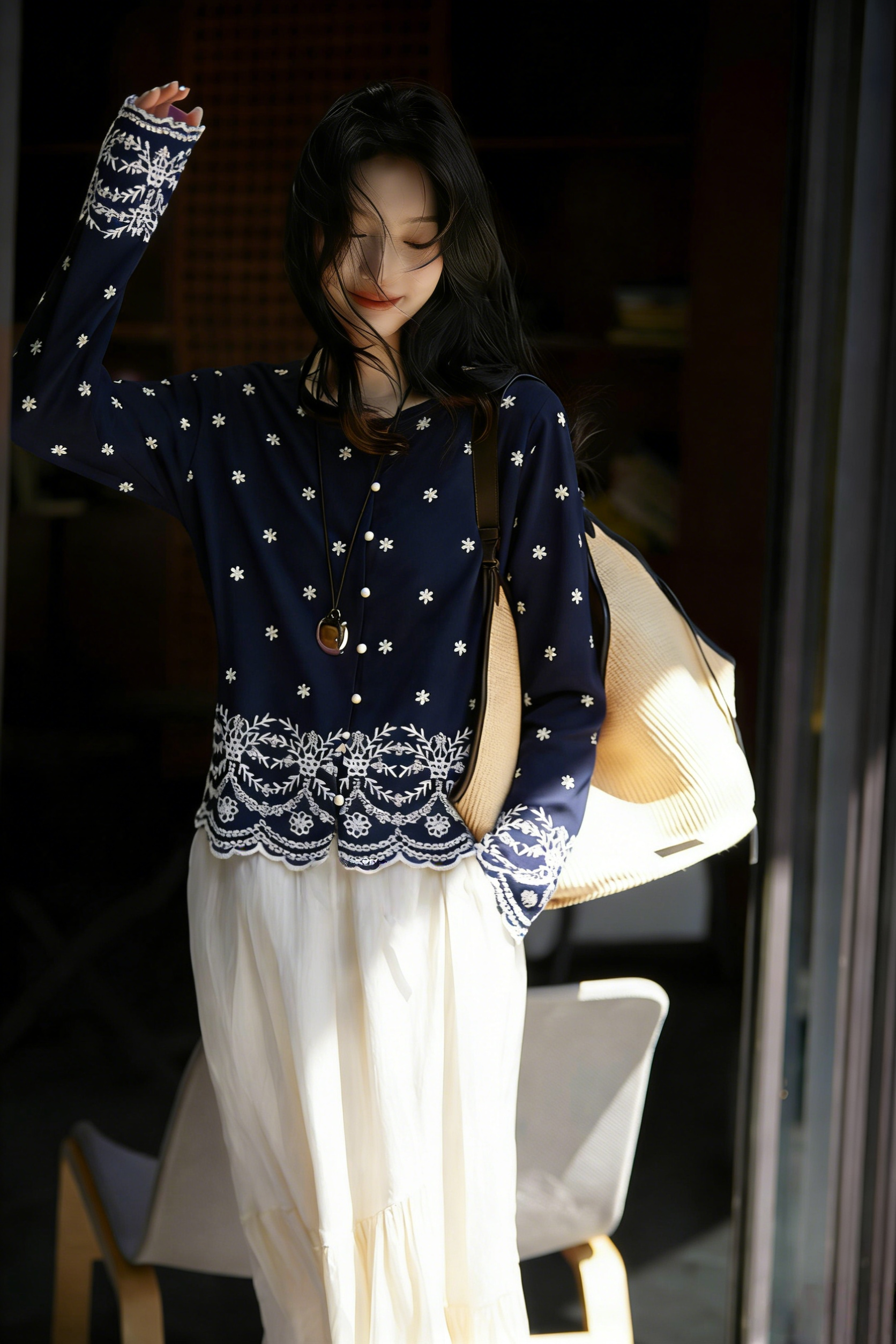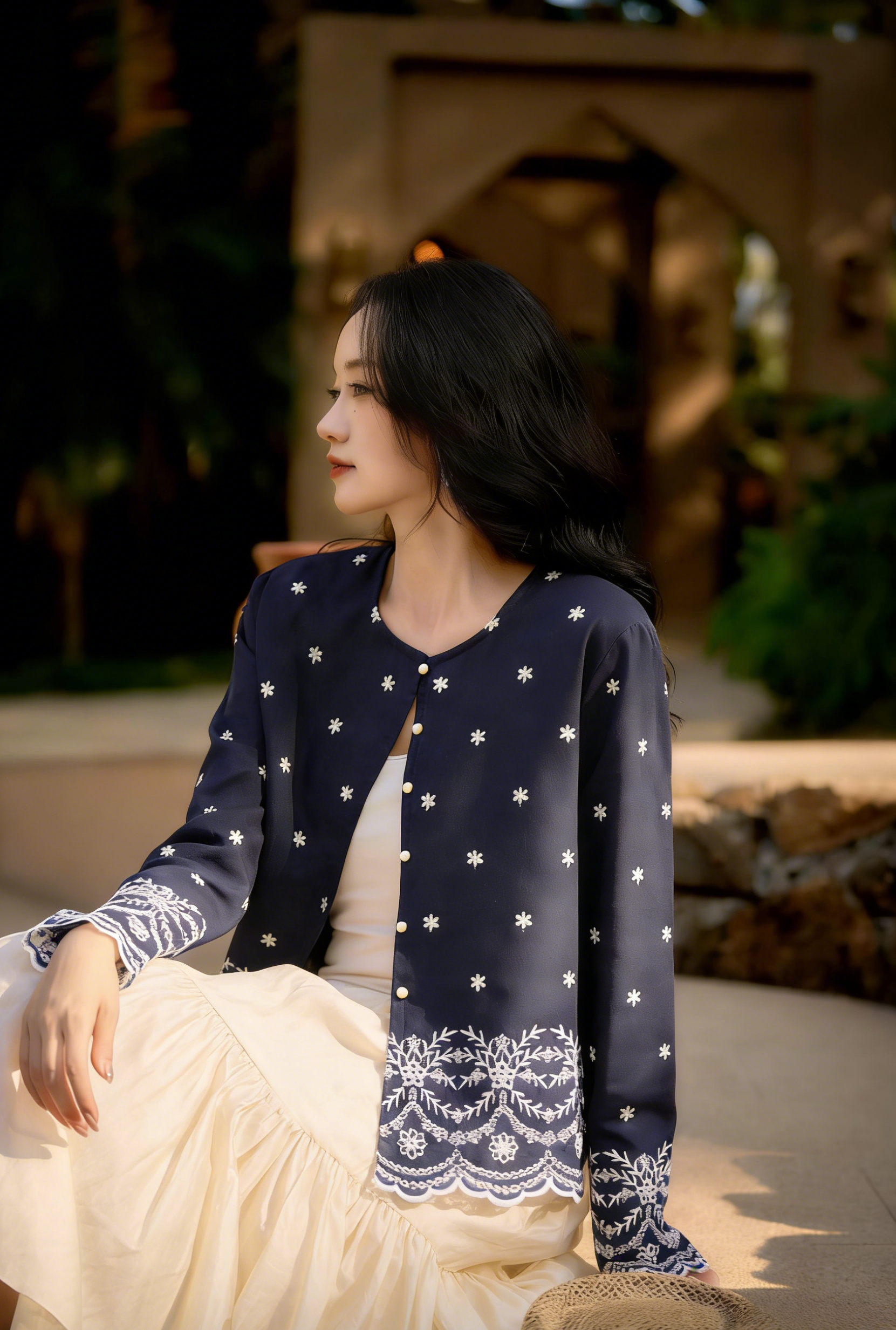 下单3-7天发货!LONGNVFAIR 藏青色撞白满天星刺绣花边上衣/奶油色花瓣半裙套装 一眼沦陷的东方雅致 梨形身材遮肉显瘦 温柔清冷国风穿搭
