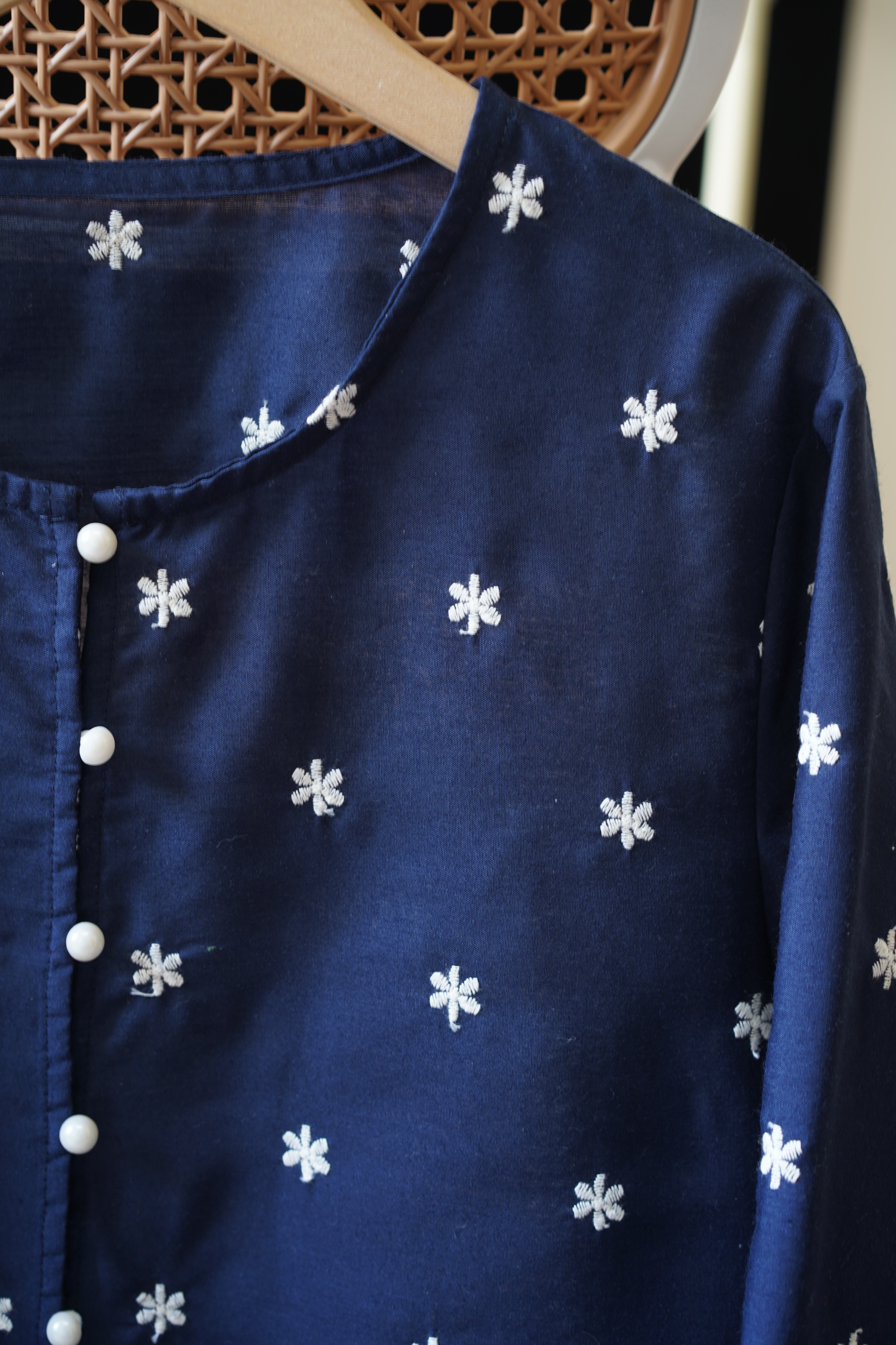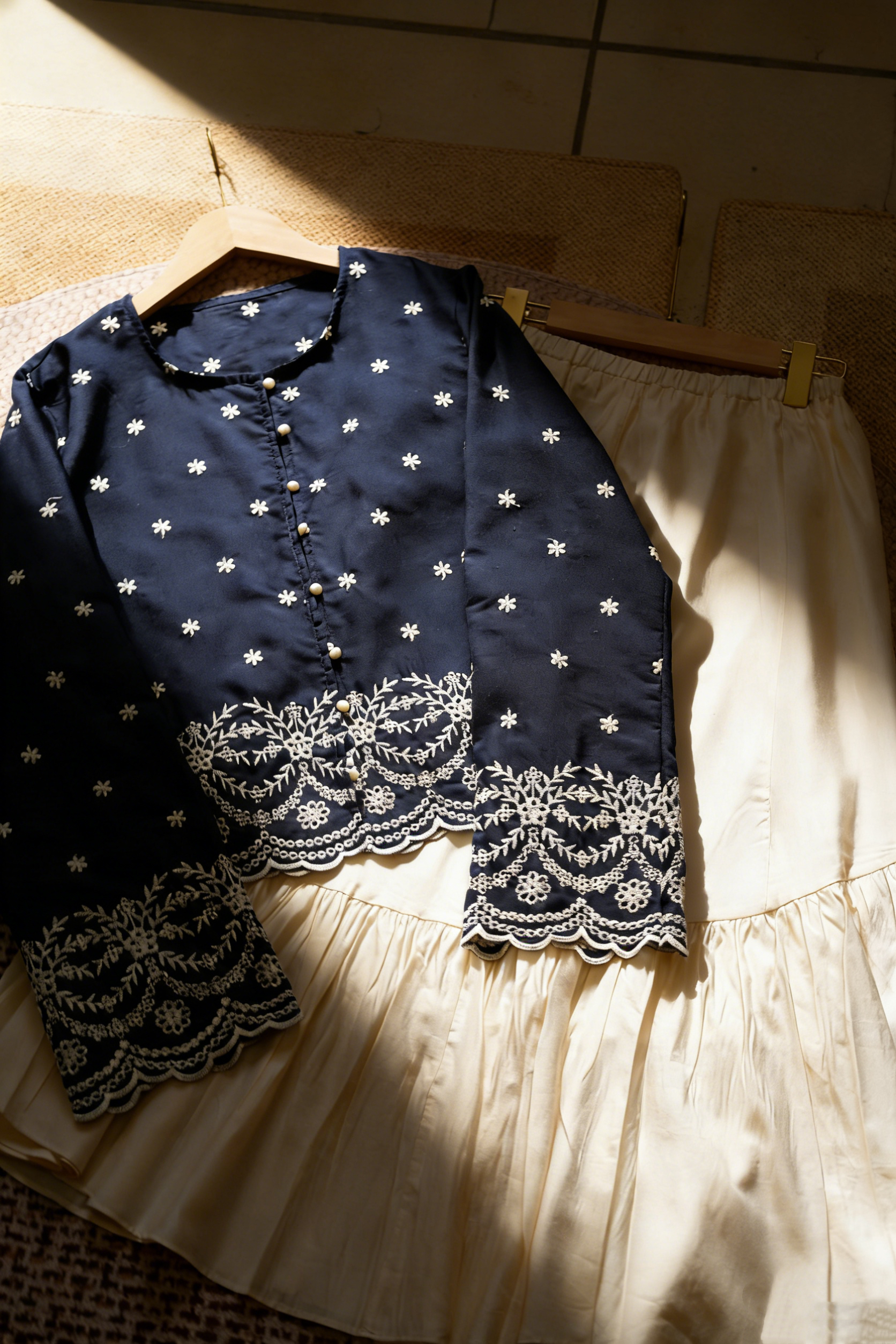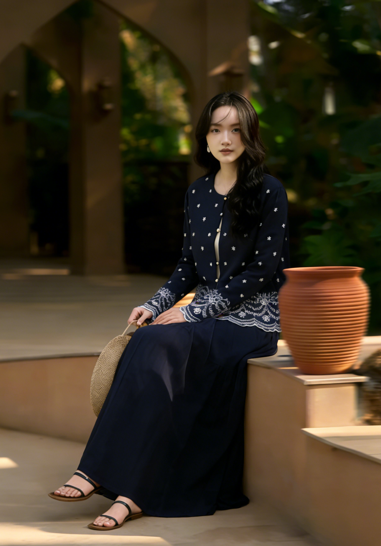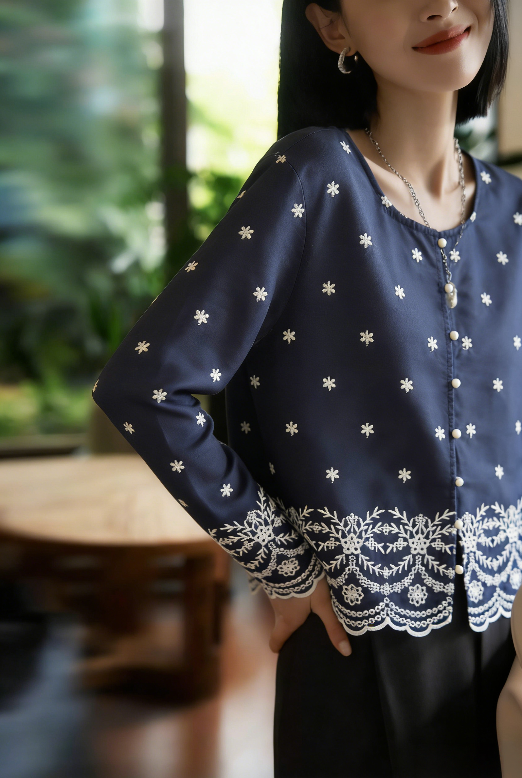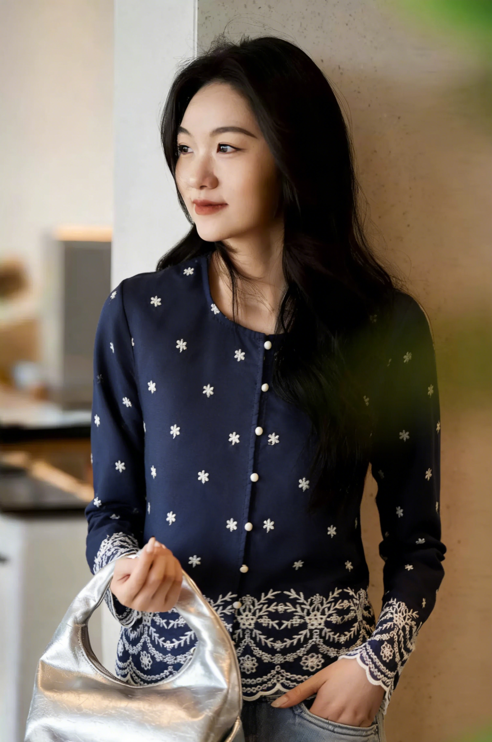 下单3-7天发货!LONGNVFAIR 藏青色撞白满天星刺绣花边上衣/奶油色花瓣半裙套装 一眼沦陷的东方雅致 梨形身材遮肉显瘦 温柔清冷国风穿搭