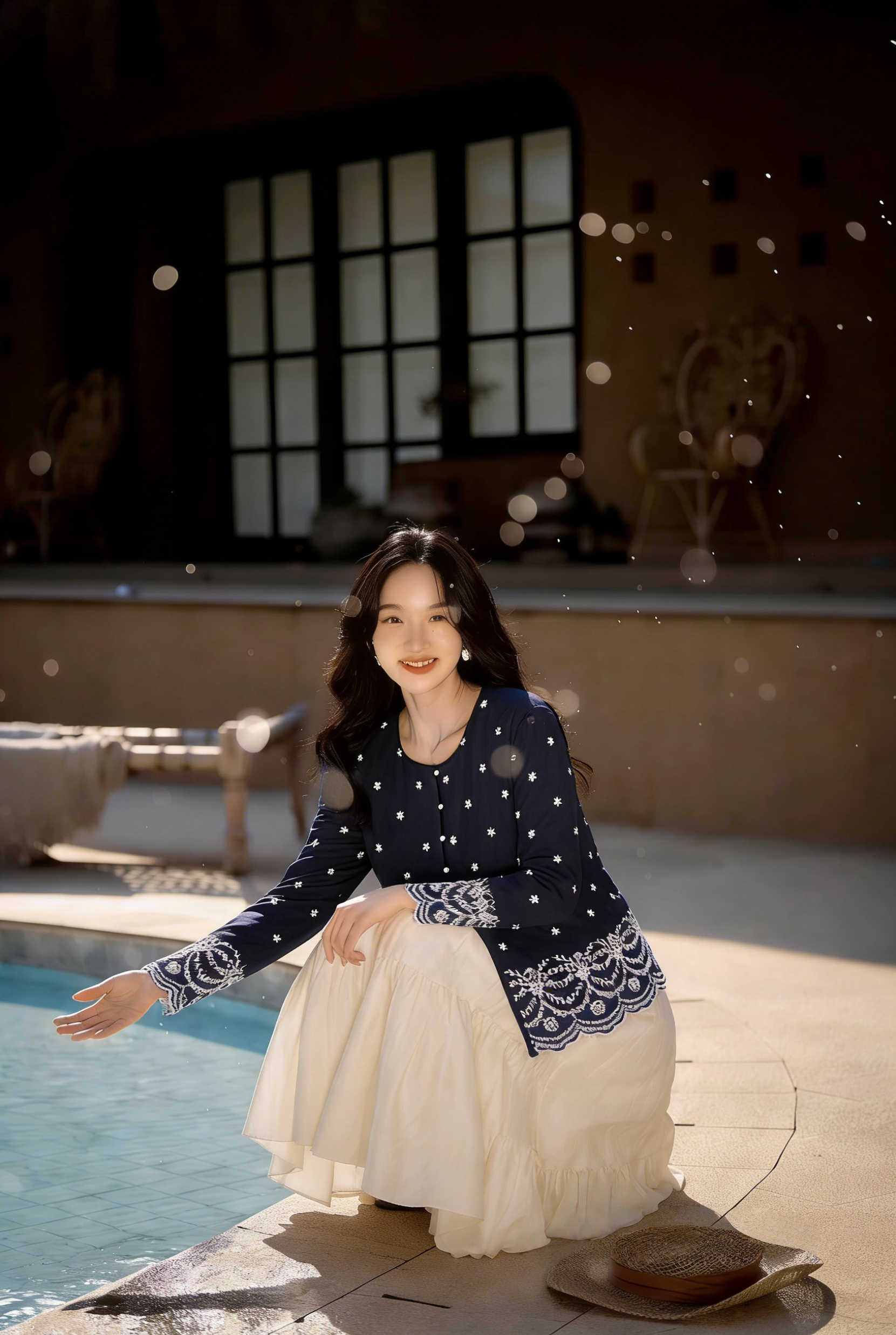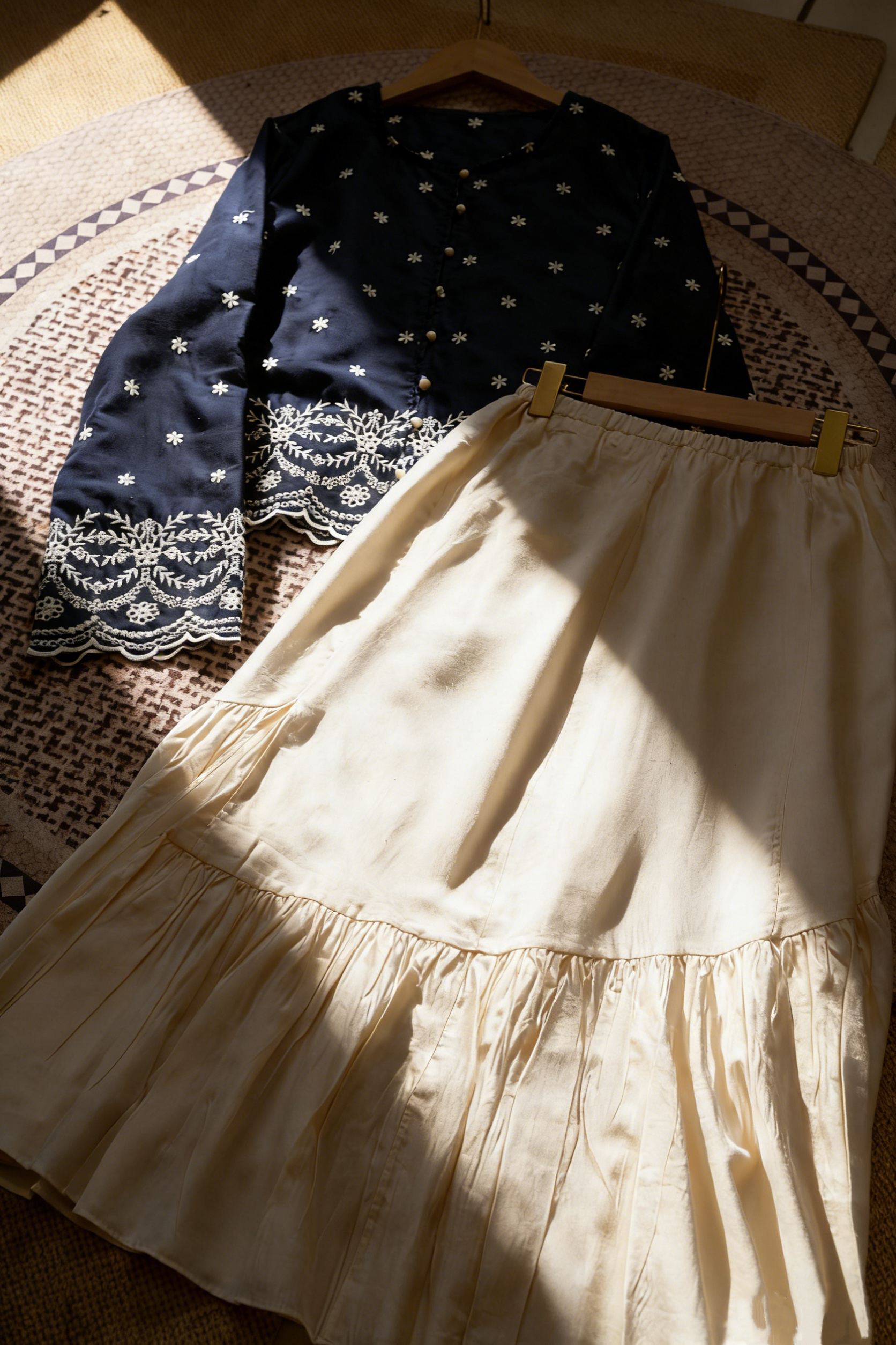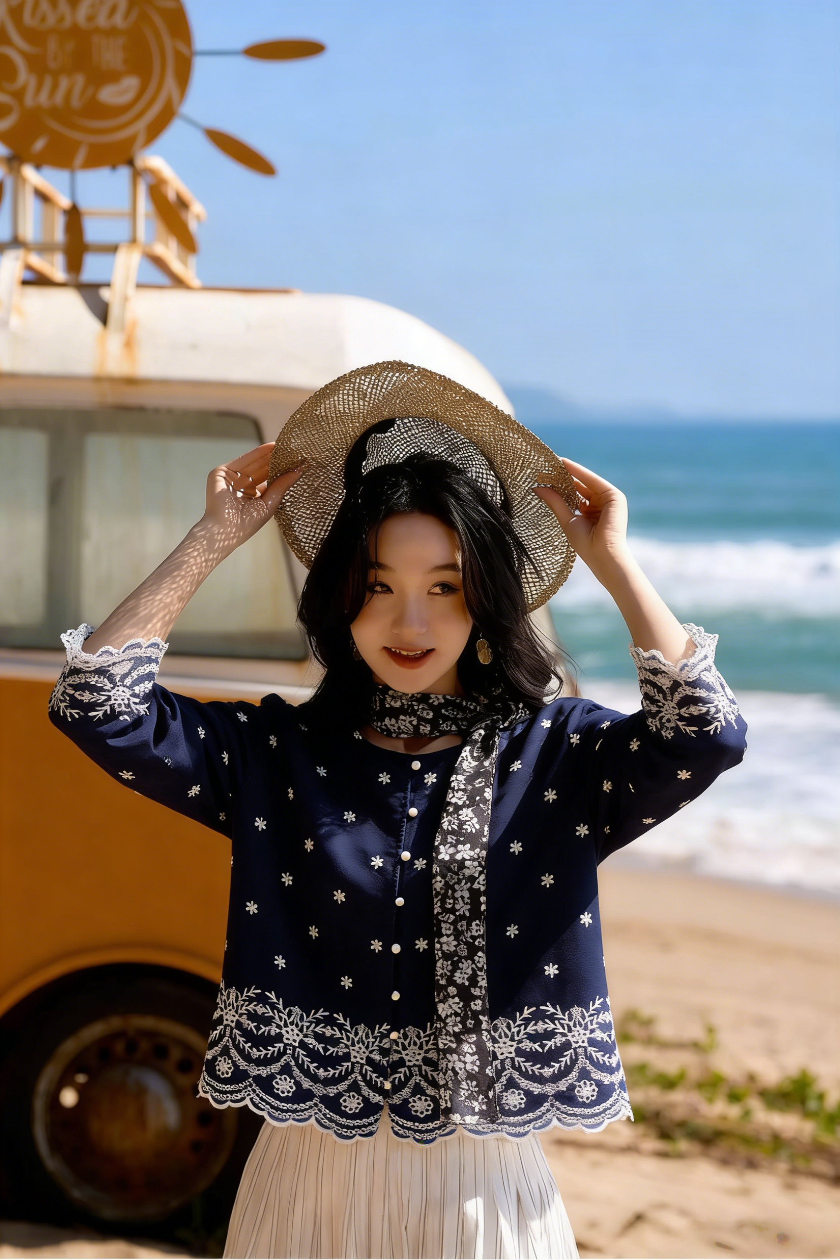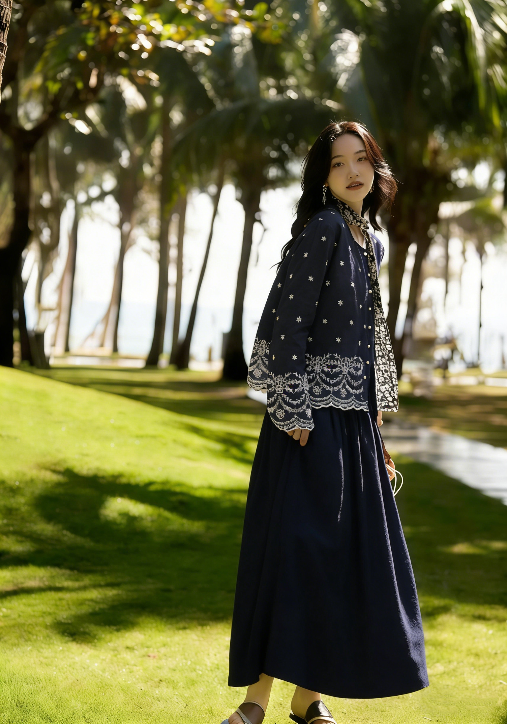 下单3-7天发货!LONGNVFAIR 藏青色撞白满天星刺绣花边上衣/奶油色花瓣半裙套装 一眼沦陷的东方雅致 梨形身材遮肉显瘦 温柔清冷国风穿搭